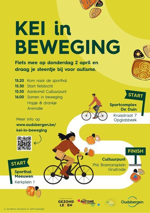 We organiseren een begeleide fietstocht die vertrekt vanuit onze twee sporthallen in Meeuwen en Opglabbeek. Van daaruit fietsen we samen naar het Cultuurpunt in Gruitrode, waar we elkaar ontmoeten en zo alle deelkernen van de gemeente Oudsbergen met elkaar verbinden. Naar aanleiding van "Wereld Autisme Dag" en "Kom van dat gat af" op 2 april geven we tijdens deze activiteit extra aandacht aan autisme, beweging en verbondenheid. In de sporthallen worden momenteel keien versierd en verzameld als symbool voor steun en begrip. Tijdens de fietstocht nemen we deze versierde keien mee en brengen we ze samen op één locatie. Op die manier maken we van alle keien één geheel en dragen we letterlijk ons steentje bij aan meer zichtbaarheid voor autisme en maken we mensen bewust van beweging. Bij de samenkomst op het Cultuurpunt worden verschillende beweegsessies georganiseerd voor jong en oud. Iedereen kan op zijn of haar eigen tempo deelnemen aan laagdrempelige en toegankelijke activiteiten, begeleid door een instructeur, zodat iedereen kan meedoen en samen plezier beleeft aan bewegen.