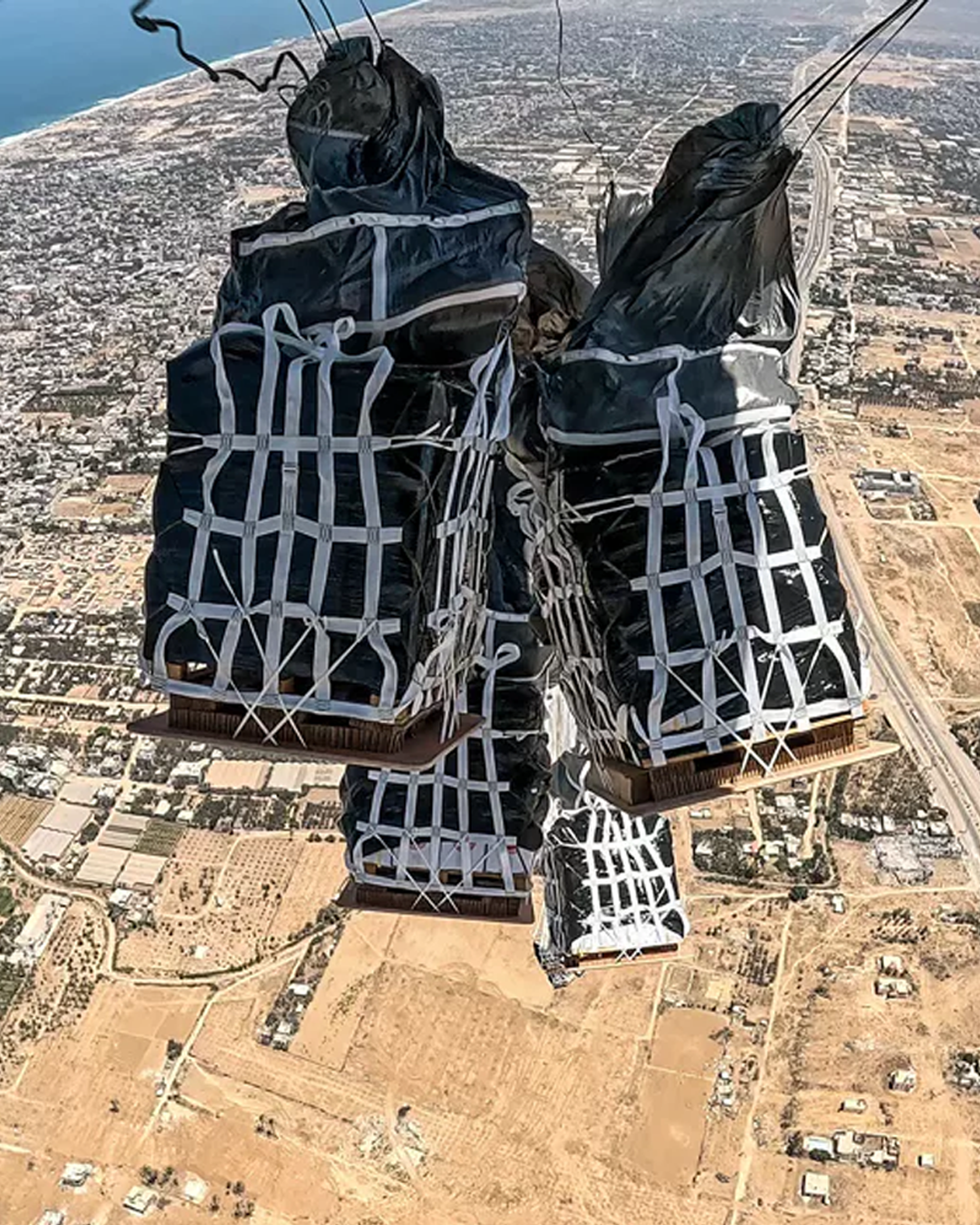 Belgisch vliegtuig dropt eerste lading hulpgoederen met pasta, rijst... boven Gazastrook