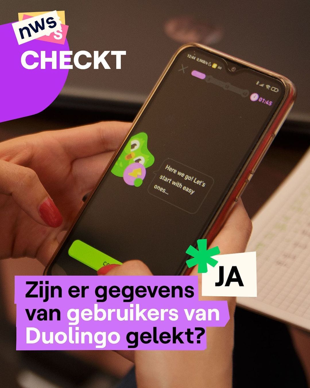 Jullie sturen ons ongeruste DM's over een hacking bij de taal-app Duolingo. Het klopt dat er gegevens gelekt zijn, maar er is geen reden tot paniek: je account én je wachtwoord zijn veilig. Een aantal maanden geleden was er een datalek bij Duolingo. De naam, gebruikersnaam en het e-mailadres van zo'n 2,6 miljoen gebruikers zijn toen gelekt. Die gegevens worden sinds augustus online gedeeld. Hackers vonden een fout in de manier waarop Duolingo omgaat met persoonlijke gegevens, waardoor het makkelijk was om aan de gegevens te geraken. Ze hebben dus niet echt ingebroken in de systemen. Gegevens die extra beveiligd zijn, zoals een wachtwoord, zijn daardoor niet gestolen. Je wachtwoord veranderen is dan ook niet nodig. Let wel op voor valse e-mails. Als je opeens gekke phishing-mails krijgt van Duolingo, check dan zeker of ze wel écht van de app komen en klik niet zomaar op een link in de mail.