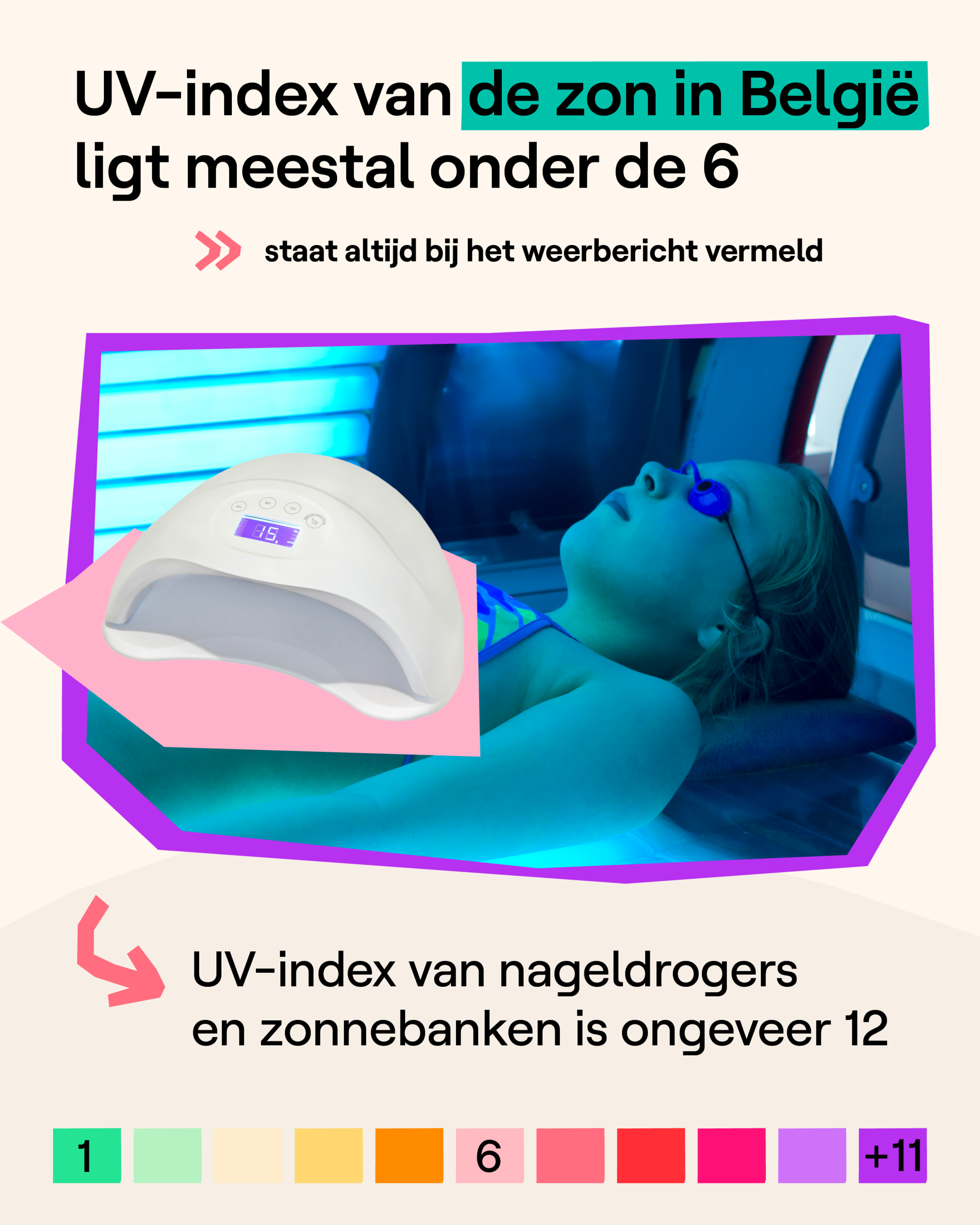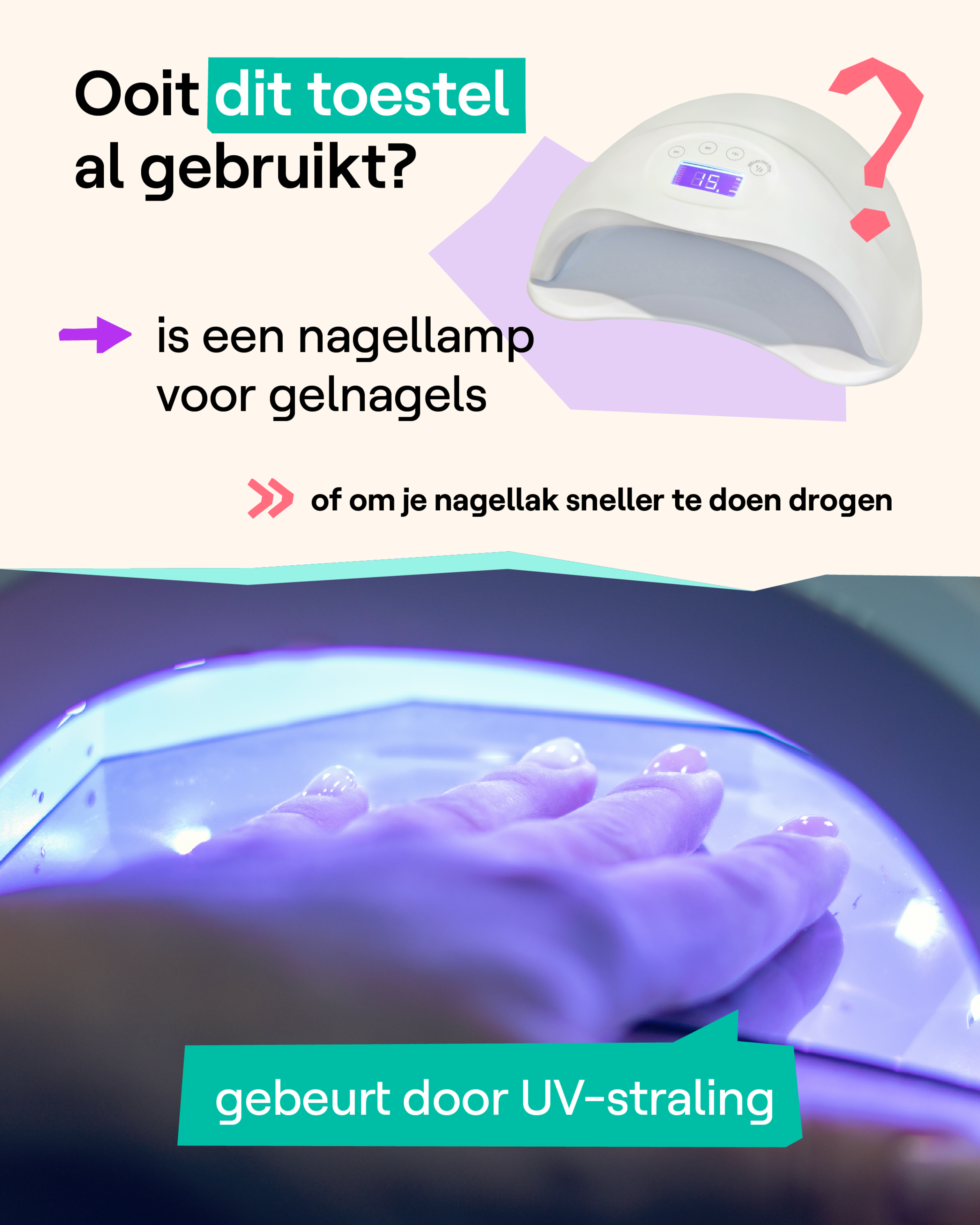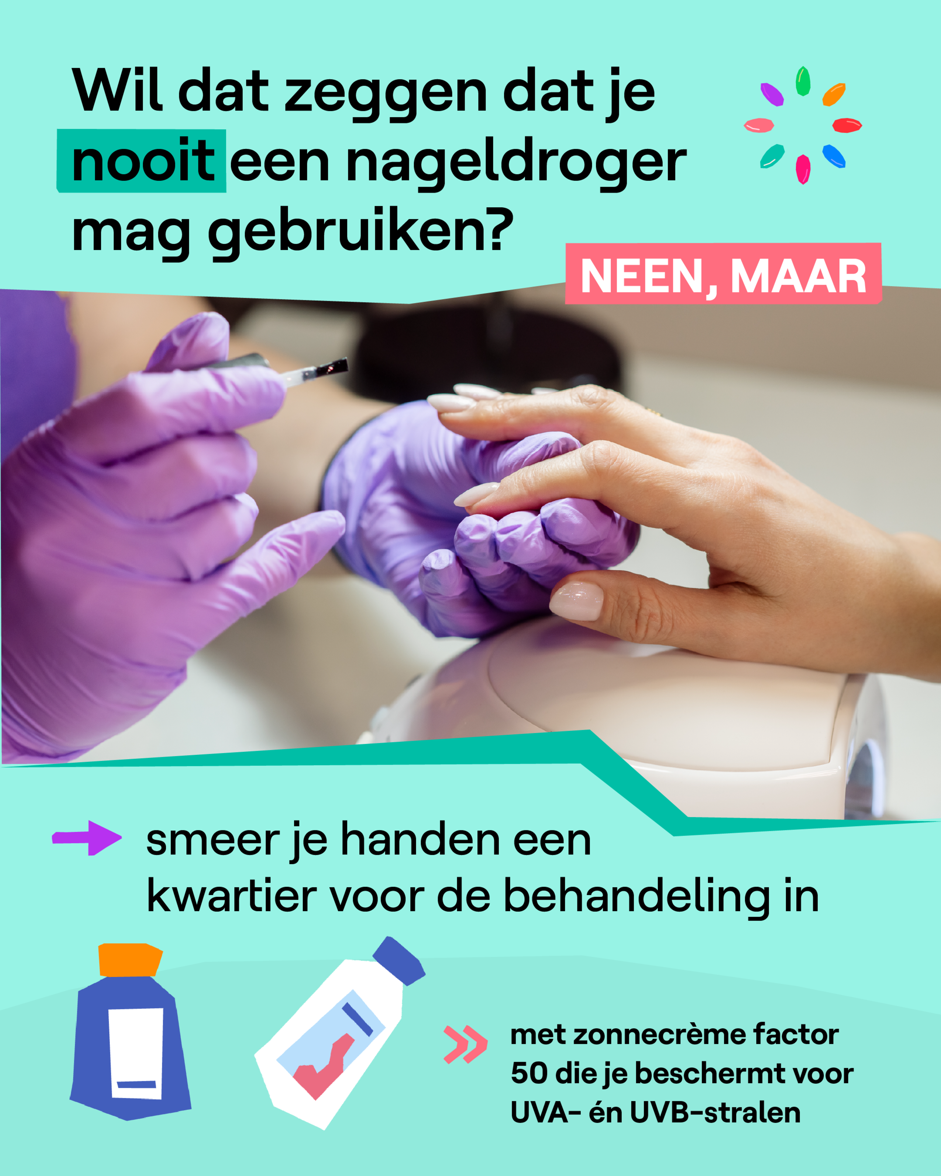 Vaak wordt gedacht dat LED-lampen minder gevaarlijk zijn dan UV-lampen, maar dat klopt niet. UV verwijst naar de ultraviolette stralen die de lamp uitstraalt, terwijl LED verwijst naar de manier waarop de lamp technisch werkt. Het een sluit dus het andere niet uit. LED-lampen kunnen even goed UV-stralen uitstralen. Dus ook bij een nageldroger die met LED-lampen werkt, smeer je je handen best even in met zonnecrème.