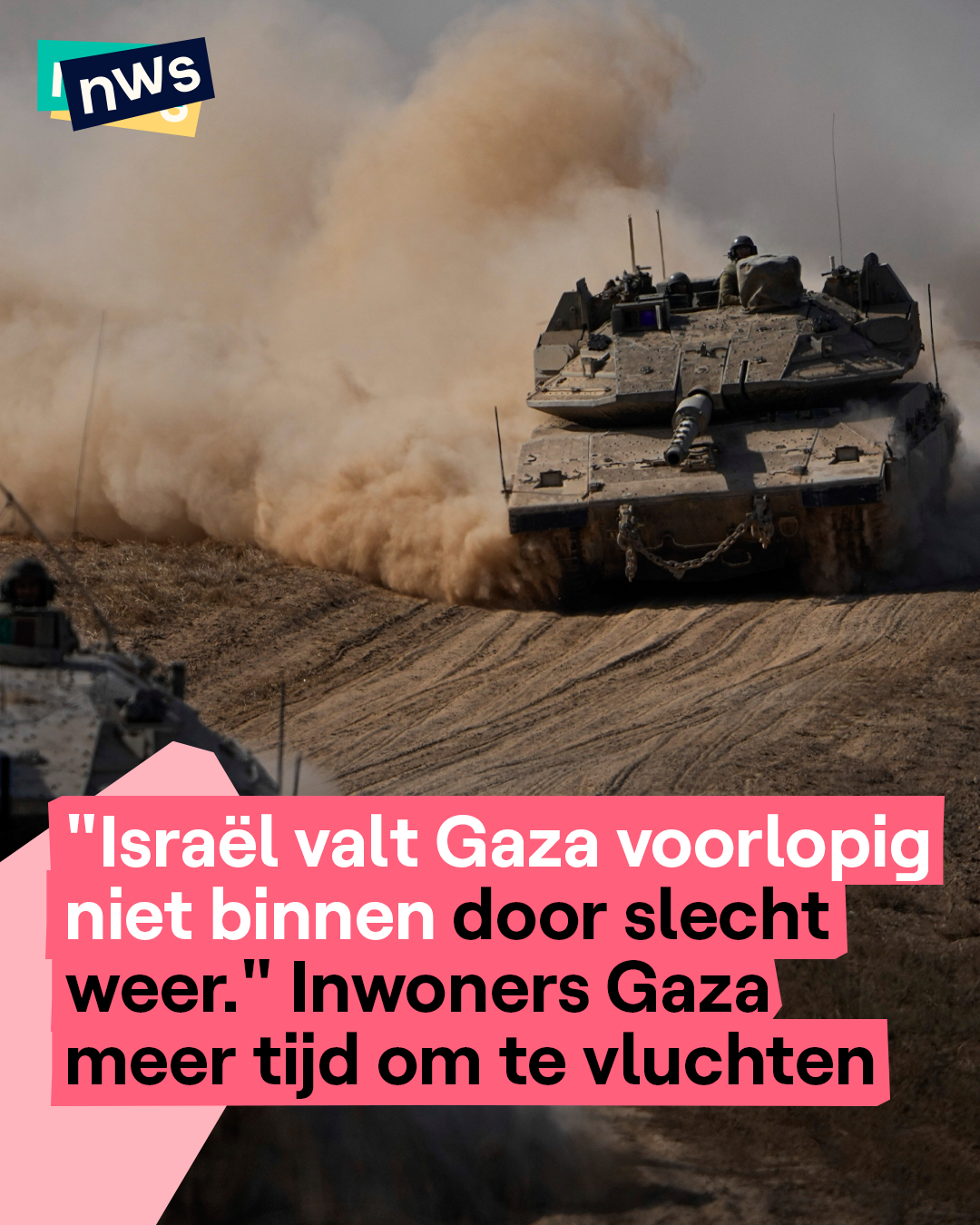 Het is niet duidelijk wanneer het Israëlische leger de Gazastrook zal aanvallen om de leiders van de terreurgroep Hamas te doden. Die aanval ging normaal dit weekend gebeuren maar wordt nu mogelijk een paar dagen uitgesteld door het slechte weer, zeggen Amerikaanse media. Het regent heel hard en er is veel bewolking en dat maakt het moeilijk voor Israëlische piloten en drones om iets te kunnen zien vanuit de lucht. Inwoners van Gaza hebben nu wel meer tijd om te vluchten van het noorden naar het zuiden. Tienduizenden inwoners zijn sinds vrijdagochtend op de vlucht omdat het Israëlische leger dreigt het noorden van de Gazastrook te bombarderen. Israël zou van plan zijn om Gaza aan te vallen over de grond, via zee en vanuit de lucht, als reactie voor een verrassingsaanval van Hamas vorige week.
