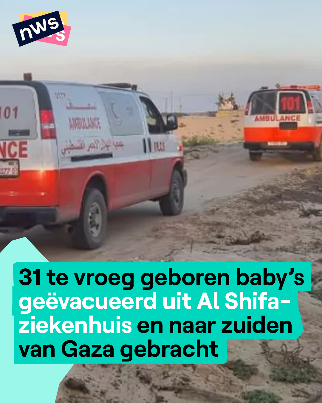 In Gaza zijn 31 te vroeg geboren baby's vandaag geëvacueerd uit het Al Shifa-ziekenhuis. Dat is het grootste ziekenhuis van Gaza en ligt in het noorden van de Gazastrook. Begin deze week viel het Israëlische leger het ziekenhuis binnen. Er waren toen nog duizenden mensen aanwezig. Volgens Israël verschuilen Hamasstrijders zich onder dat ziekenhuis. Gisteren werd Al Shifa volledig geëvacueerd. Maar 120 gewonden en premature baby's konden niet verplaatst worden en bleven achter. 31 baby's zijn nu veilig aangekomen in het zuiden van Gaza. Ze worden voorlopig verzorgd in een andere ziekenhuis. De bedoeling is om de baby's over te brengen naar een ziekenhuis in Egypte.