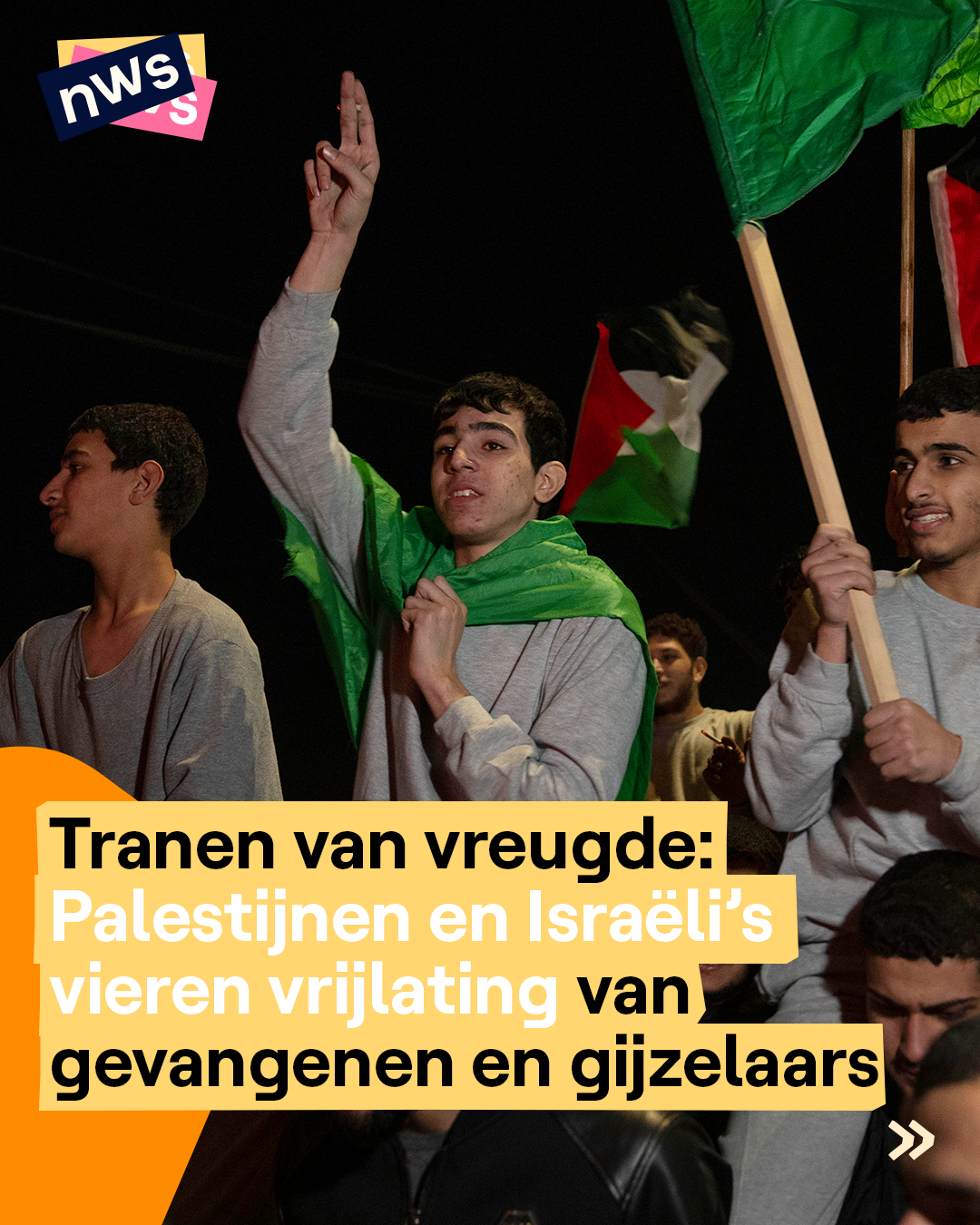 Muziek, tranen van vreugde en optochten in de straten. Palestijnen en Israëli's vieren de vrijlating van gevangenen en gijzelaars. Gisteren liet de Palestijnse terreurgroep Hamas 24 gijzelaars gaan uit Gaza. In ruil lieten de Israëli's 39 Palestijnen vrij uit de gevangenis. En dat gaat gepaard met veel emotie. De Israëlische gijzelaars die gisteren vrijkwamen, zijn in goede gezondheid. ‘t Is de tweede dag van de gevechtspauze tussen Israël en Hamas. Vandaag gaat Israël opnieuw 39 of 42 Palestijnse gevangenen vrijlaten. Dat zeggen de Israëlische autoriteiten. In ruil daarvoor laat Hamas 14 nieuwe Israëlische gijzelaars vrij. Tegelijkertijd kunnen een 200-tal vrachtwagens met hulpgoederen vanuit Egypte de grens met Gaza oversteken.