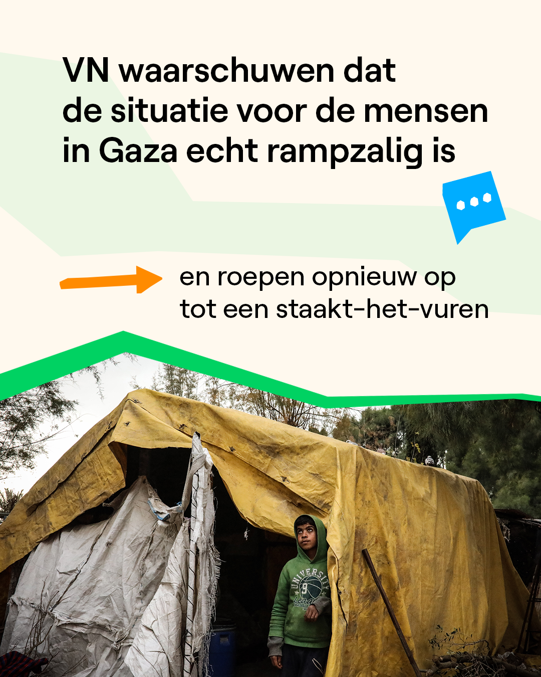 België stuurde deze week een vliegtuig naar Gaza met hulpgoederen zoals slaapzakken en shelters. Binnenkort zou nog een tweede vliegtuig met medisch materiaal vertrekken. Maar noodhulp raakt de Gazastrook amper binnen. De VN maken zich grote zorgen om de Palestijnse bevolking en willen dat er een einde komt aan het geweld, maar voorlopig is er nog geen wapenstilstand in zicht. Vandaag stemde de VN-veiligheidsraad over een staakt-het-vuren. De VS - de belangrijkste bondgenoot van Israël - stemde tegen. De afgelopen twee maanden zijn meer dan 17.000 Palestijnen gedood. De meerderheid van hen zijn vrouwen en kinderen.