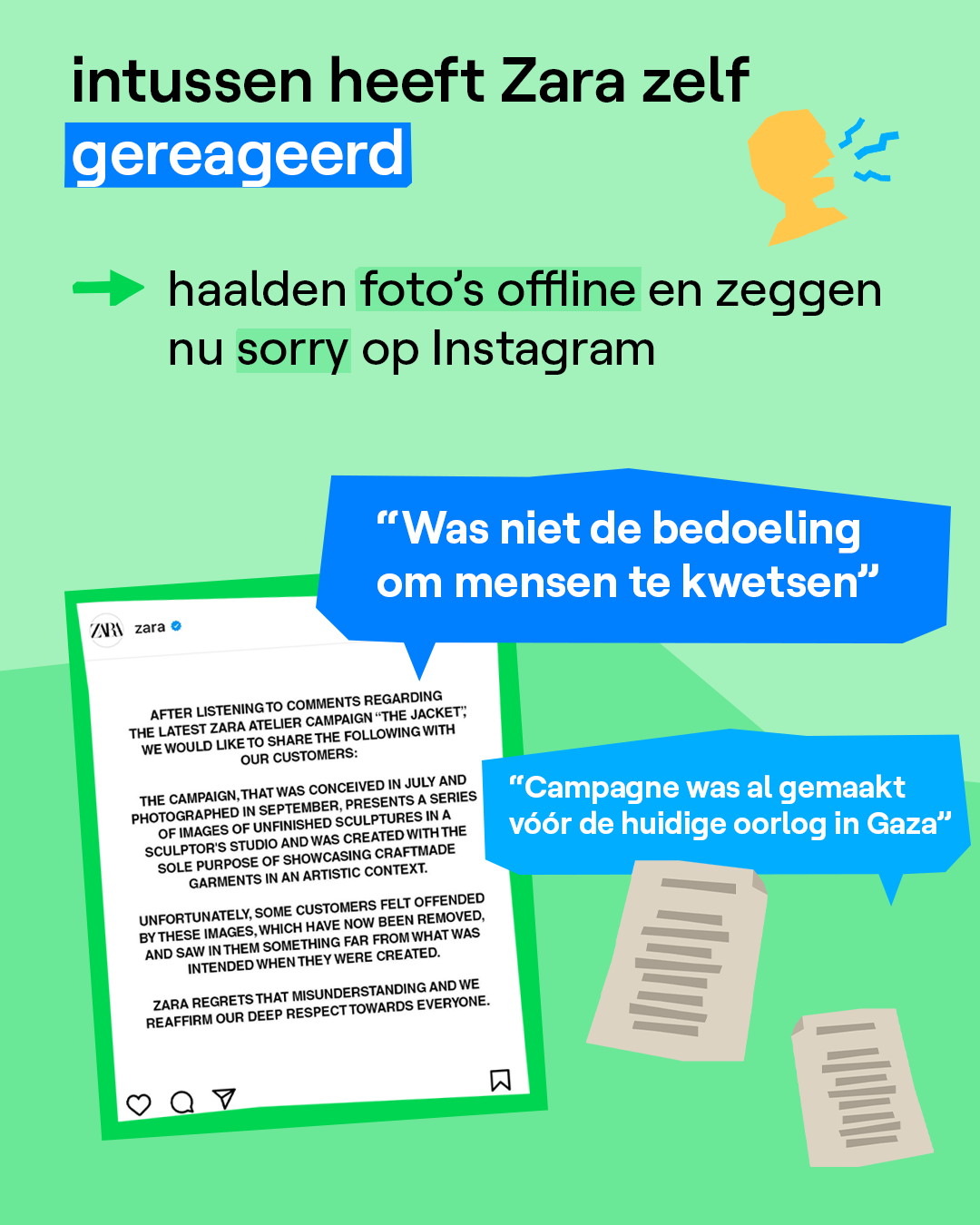 Volgens de modeketen wilden ze met de beelden de sfeer van een ambachtelijk atelier weergeven. De campagne werd bedacht in juli en gefotografeerd in september en heeft volgens hen niks te maken met de oorlog in Gaza. « Jammer genoeg voelden sommige klanten zich beledigd. Ze zagen er iets helemaal anders in dan de bedoeling was, » laat Zara weten op Insta.