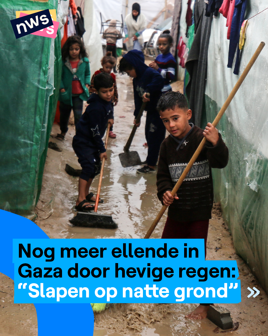 In de Gazastrook staan door hevige regen heel wat vluchtelingenkampen onder water. Duizenden Palestijnen moeten in tenten zonder grondzeil op nat zand slapen. Hulporganisaties zoals het Rode Kruis maken zich zorgen over de verspreiding van ziektes. “Mensen hebben dringend nood aan voedsel, water, onderdak, gezondheid en bescherming.” Door de regen en wind wordt het ook moeilijker om de vele doden te begraven. De oorlog tussen Hamas en Israël duurt nu al meer dan twee maanden en Israël is nog niet van plan om de gevechten te stoppen