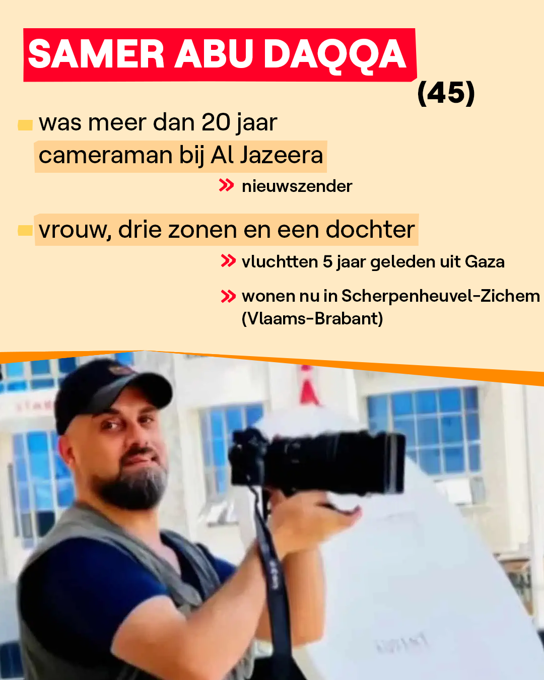 Zain, Yazan en hun broer en zus rouwen om hun papa. De cameraman Samer Abu Daqqa is vorige week tijdens zijn werk gedood bij een Israëlische luchtaanval op Khan Younis, in het zuiden van Gaza. De cameraman bracht er samen met zijn collega’s verslag uit van een bombardement op een school in de buurt. Zijn gezin woont in Scherpenheuvel-Zichem (in Vlaams-Brabant). Oudste zoon Yazan kreeg vlak voor de aanval nog een berichtje. “Hij stuurde dat ik voor mijn broers, zus en mama moet zorgen. Hij zei dat ik mijn studies moet afmaken en dat hij trots is op mij. Als ik daaraan terugdenk, doet dat pijn”. Yazan en zijn familie willen nu een klacht indienen tegen Israël bij het Internationaal Strafhof.