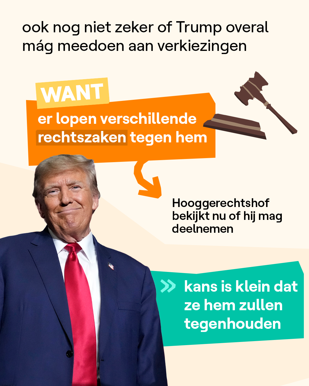 Trump for president? Da’s niet helemaal zeker. Hij mág niet overal meedoen aan de voorverkiezingen, bijvoorbeeld in de staten Colorado en Maine. Dat komt door de bestorming van het parlement enkele jaren terug. Trump was president van de Verenigde Staten van 2017 tot 2021. Na vier jaar verloor hij de verkiezingen van Joe Biden. Trump zei toen dat de uitslag vervalst was, waarop Trump-fans het parlement bestormden. Daarbij vielen 5 doden. Er loopt een rechtszaak tegen Trump voor het aanzetten tot een opstand en samenzwering tegen de VS. Colorado en Maine beslisten alvast dat Trump geen verkiesbare kandidaat mag zijn in hun staat. In andere staten mag hij wel nog meedoen.