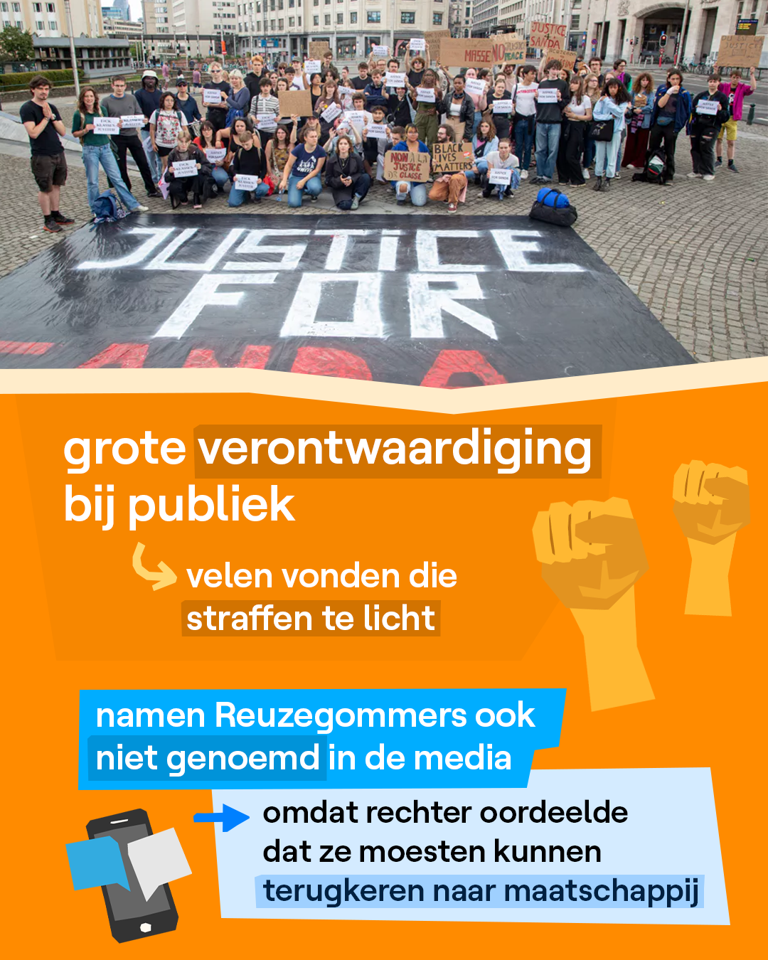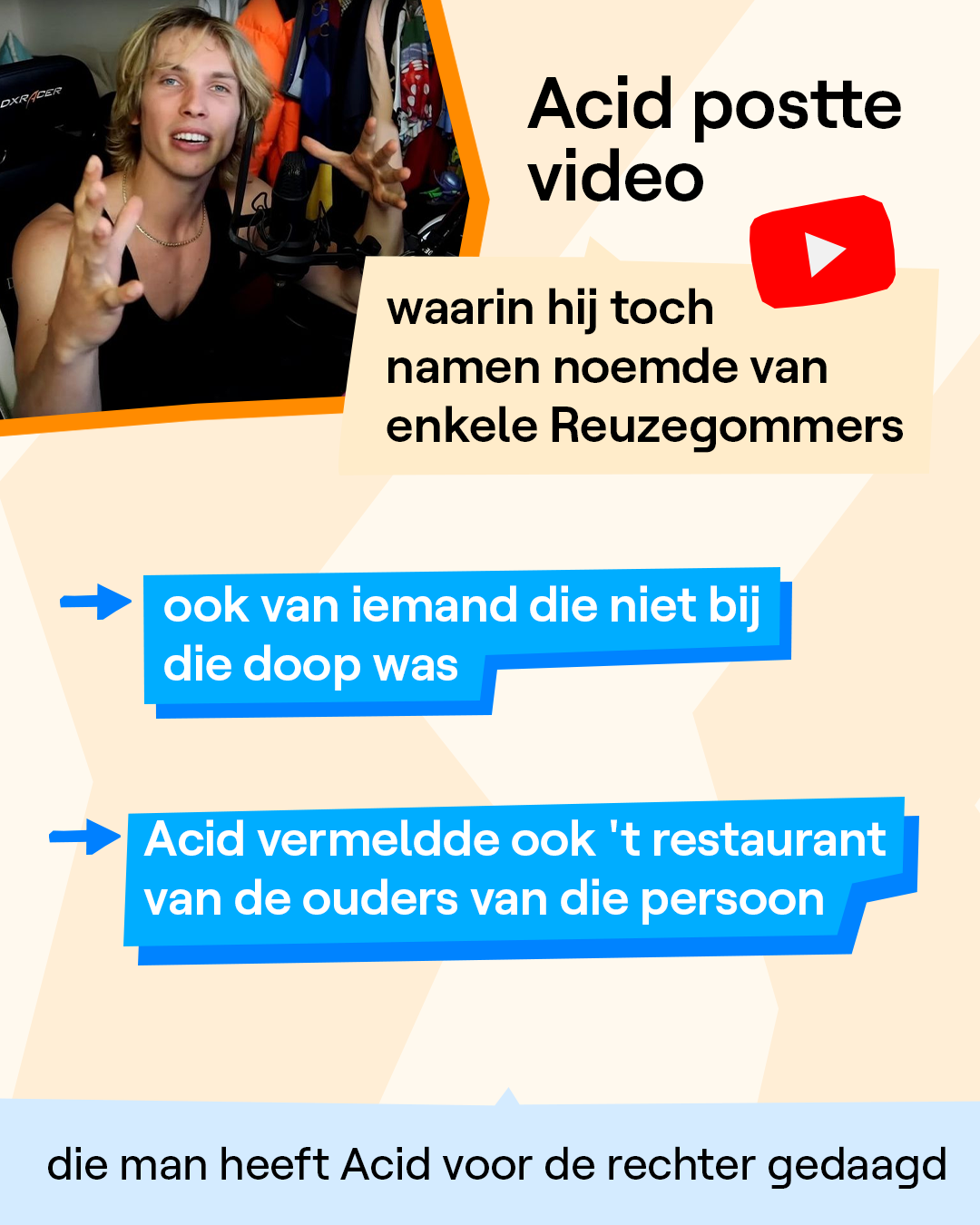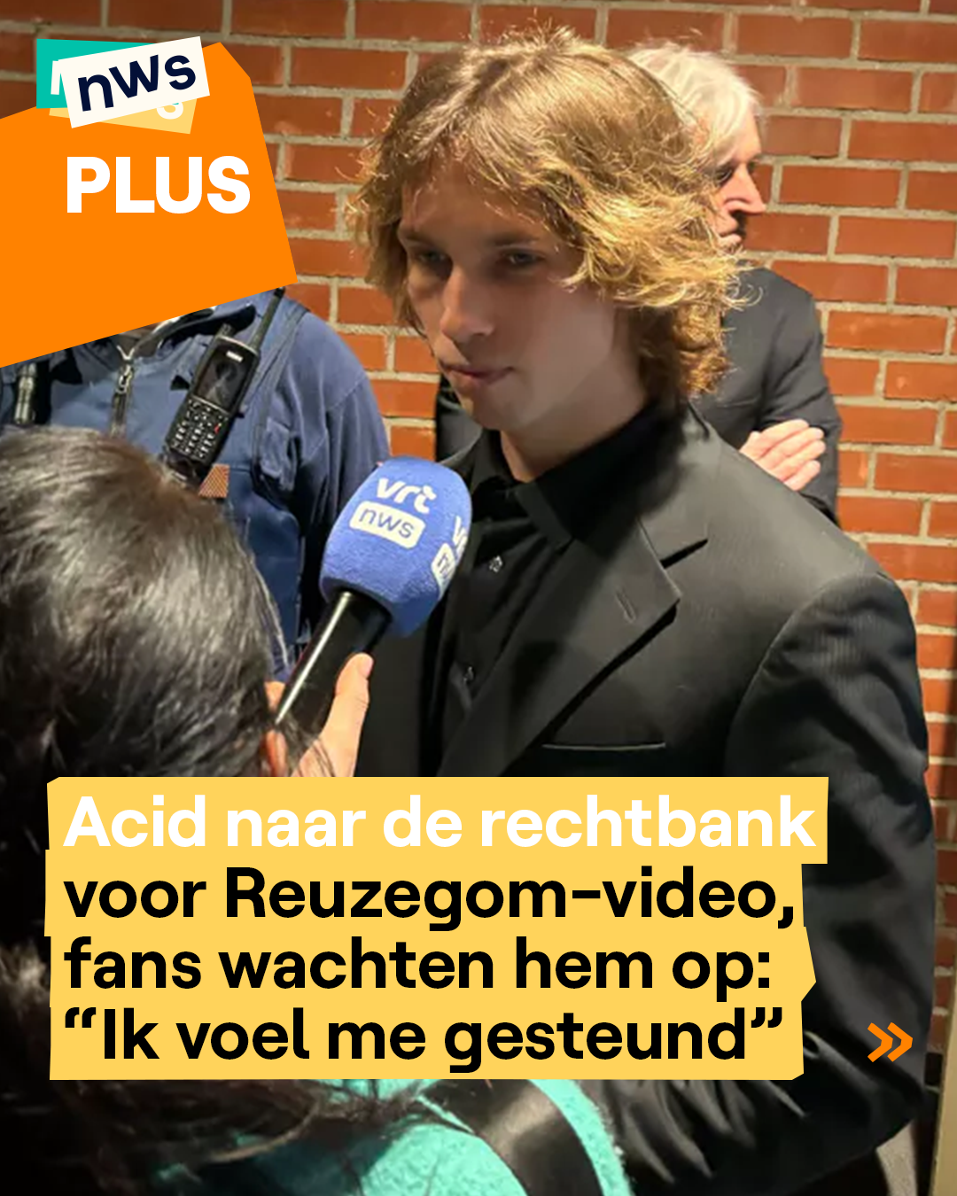 Tientallen jongeren uit heel Vlaanderen wachten Acid op aan de rechtbank in Brugge. Er waren ook twee klassen die het proces wilden bijwonen. Acid (echte naam Nathan Vandergunst) staat terecht omdat hij vier Reuzegommers bij naam noemde in een video, ook iemand die niet bij de doop van Sanda Dia was. Die daagde hem voor de rechter. “De info was al online”, zegt Acid. “Ik heb er gewoon een video over gemaakt.” Het parket zegt dat Acid zowel aanklager als rechter speelt.”Hij pakt mensen aan, zonder correct weer te geven wat ze hebben gedaan, zonder dat ze zich kunnen verdedigen.”