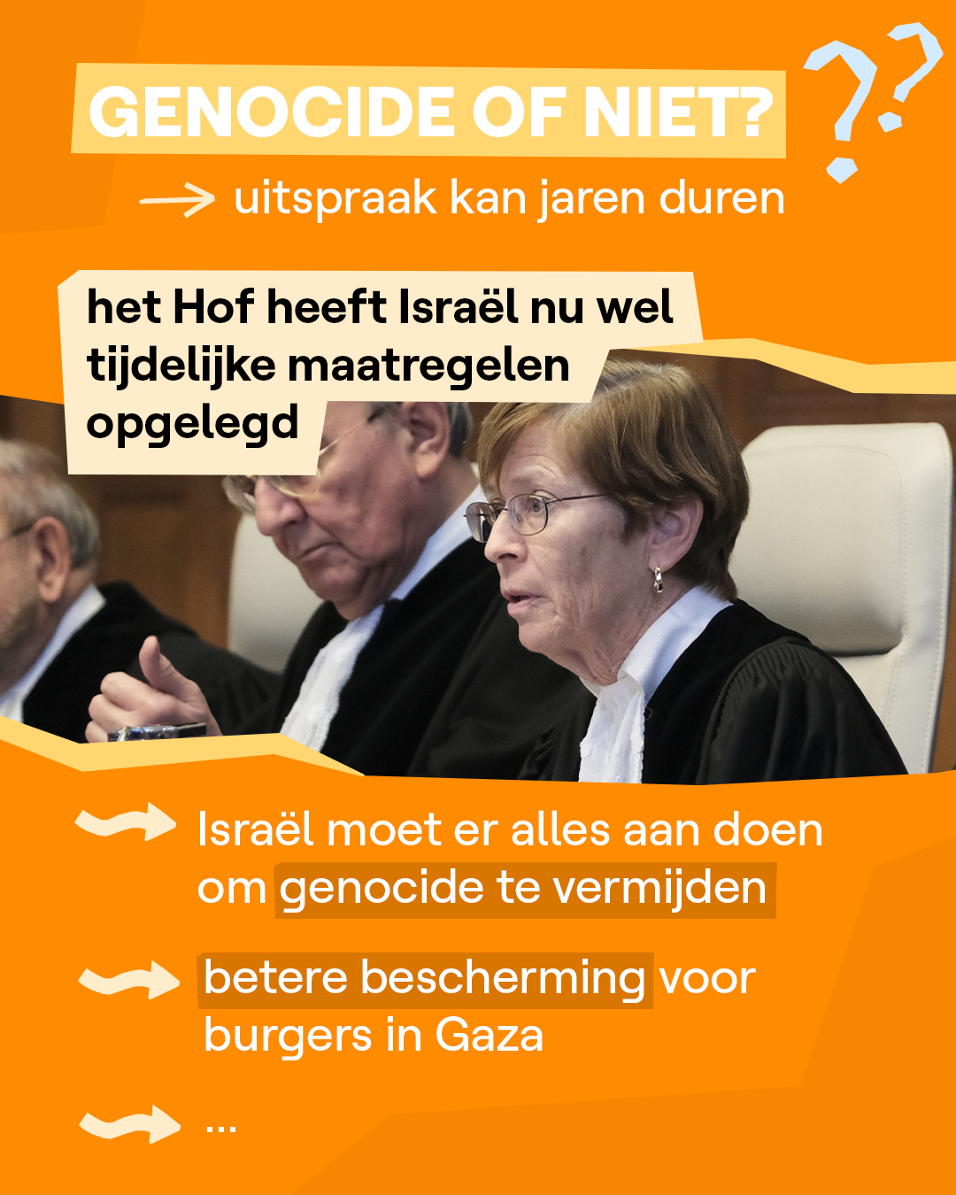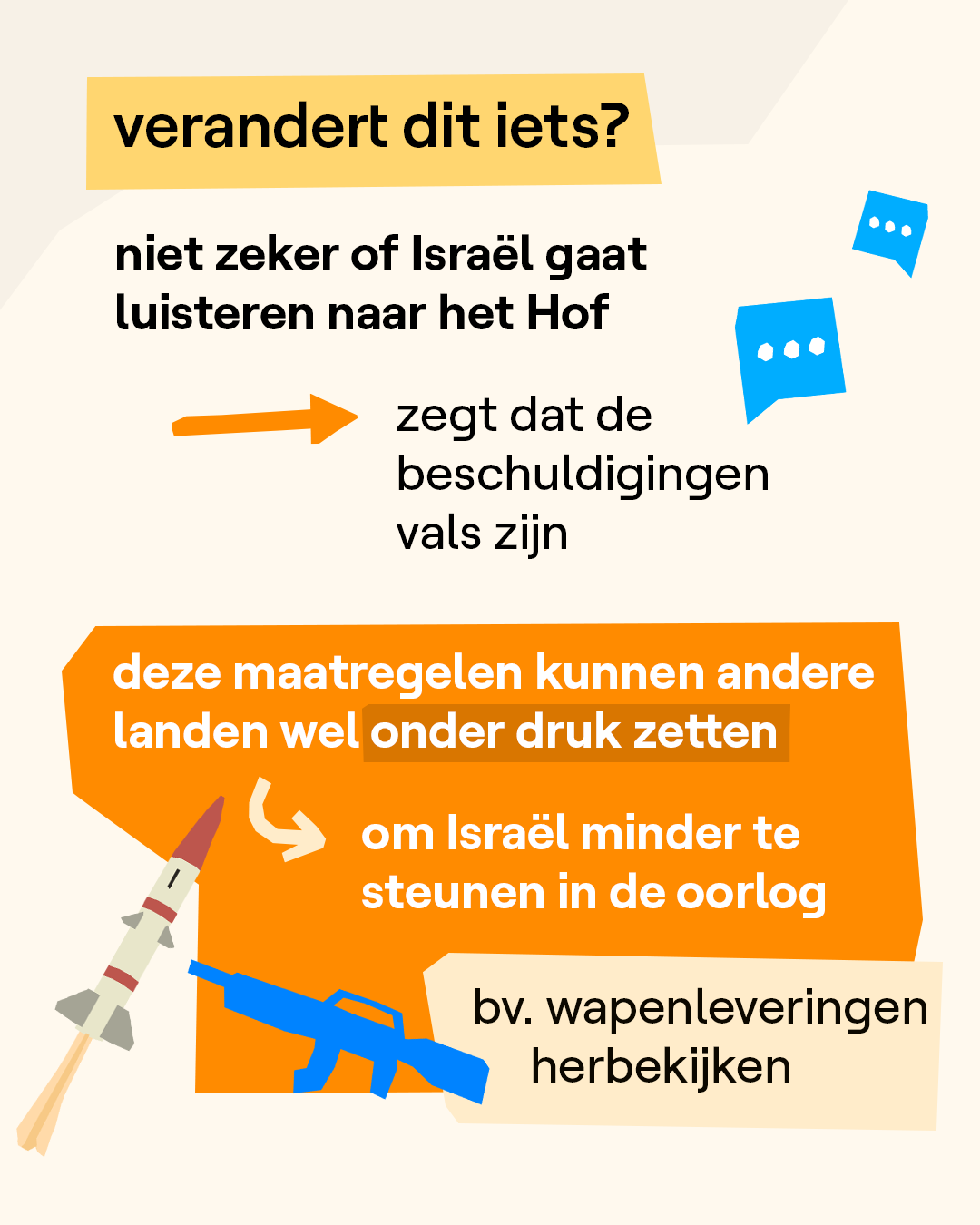 In december beschuldigde Zuid-Afrika Israël van genocide in Gaza. Zuid-Afrika heeft een slechte band met Israël en kiest al jaren de kant van de Palestijnen. Het Hof onderzoekt nu of er echt sprake is van genocide. Dat onderzoek kan jaren duren. Nu legt het Hof tijdelijke maatregelen op aan Israël. Het zegt ook dat de Palestijnse terreurorganisatie Hamas alle Israëlische gijzelaars meteen moet vrijlaten. De Israëlische premier Netanyahu herhaalt dat Israël de strijd tegen Hamas gewoon verderzet, en zich “zoals altijd aan de rechtsregels houdt”.