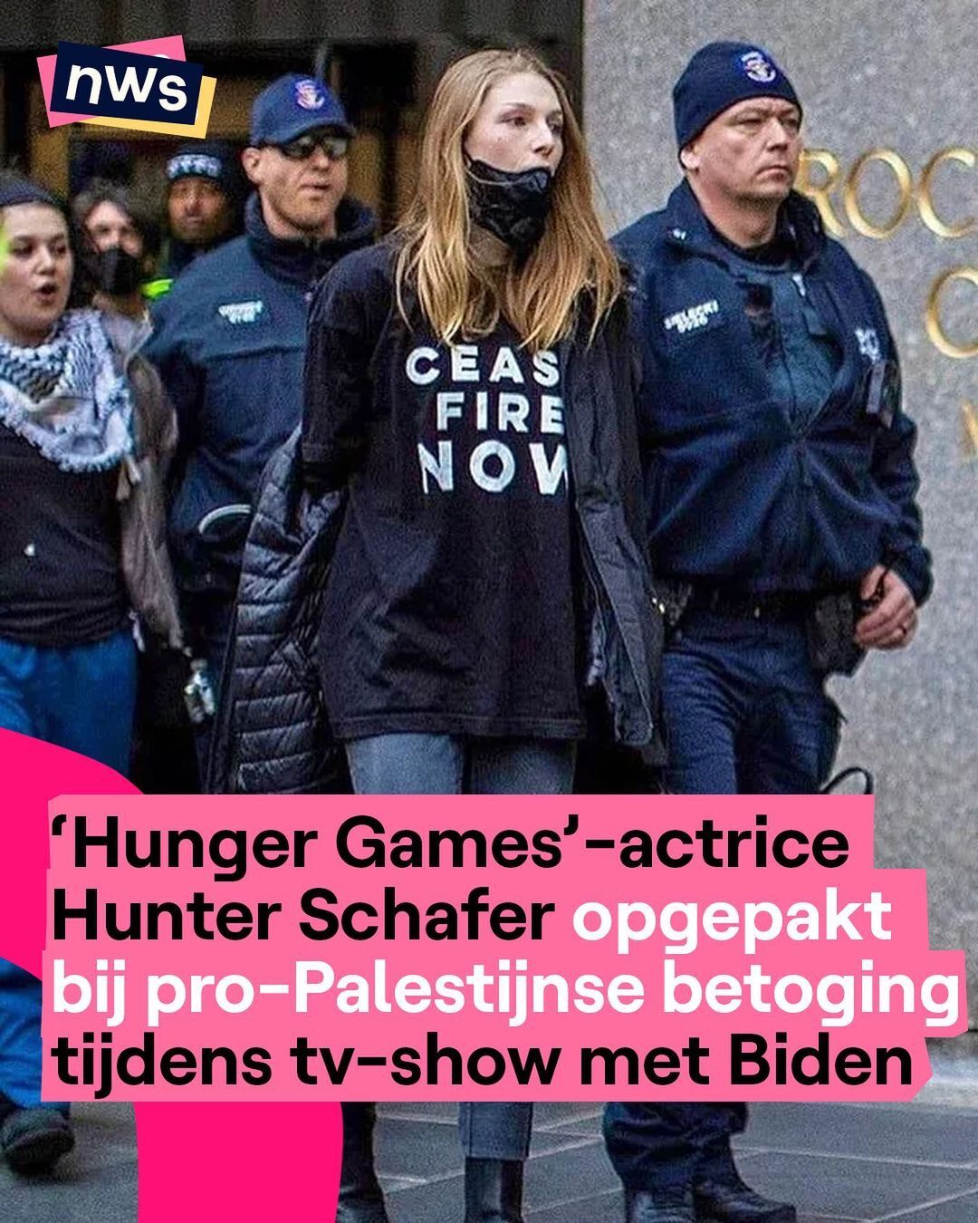 Actrice Hunter Schafer (25) is maandag gearresteerd bij een pro-Palestijns protest tijdens een Amerikaanse tv-show. Niemand minder dan de Amerikaanse president Joe Biden was er te gast. De actrice protesteerde samen met de organisatie Jewish Voice for Peace. De betogers droegen zwarte t-shirts met “Ceasefire Now” en “Not in Our Name” op. Schafer en tientallen andere demonstranten werden opgepakt, en moeten nu voor de rechter verschijnen voor huisvredebreuk (binnendringen van een woning of besloten gebouw). Schafer kan je spotten in de Hunger Games-prequel ‘The Ballad of Songbirds & Snakes’. Ze speelde ook de rol van Jules Vaughn in de serie ‘Euphoria’.