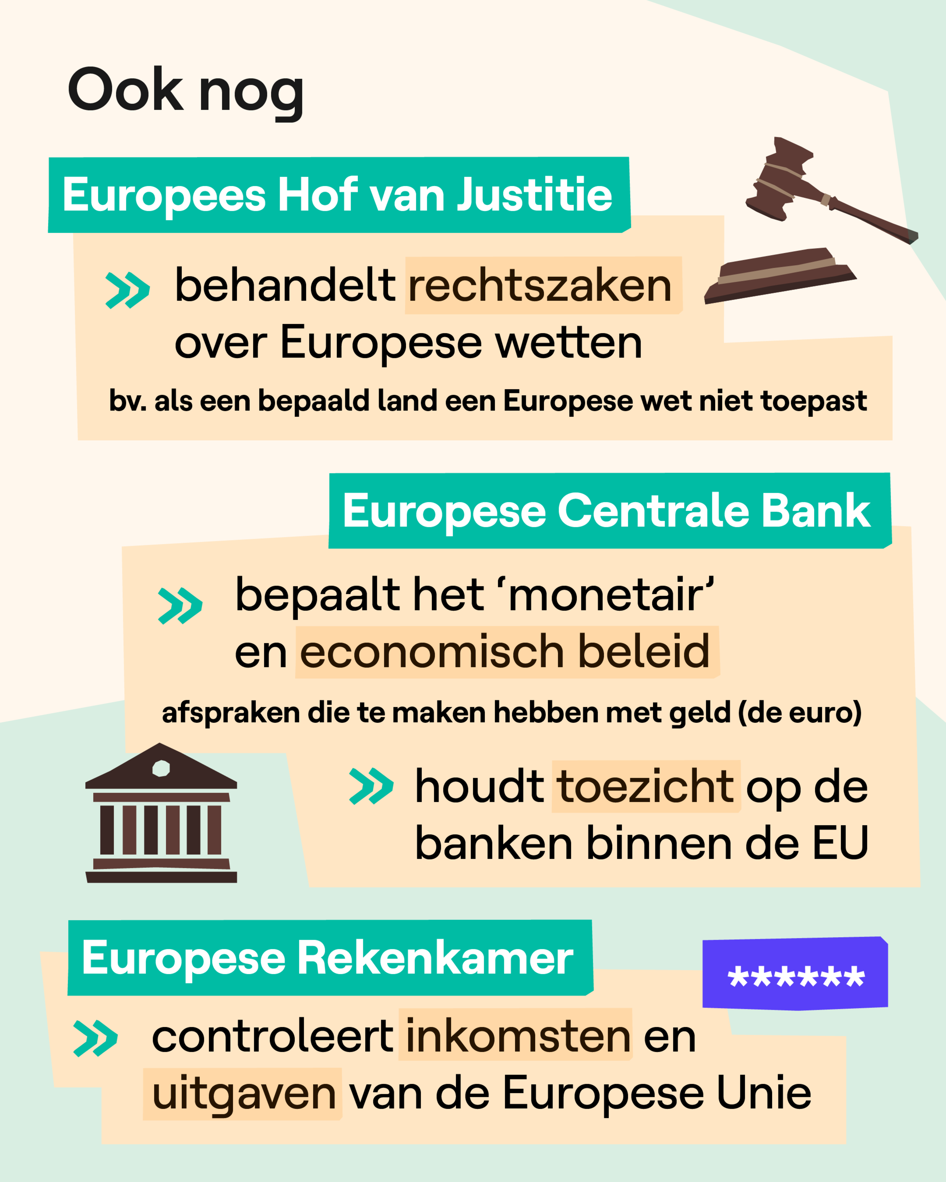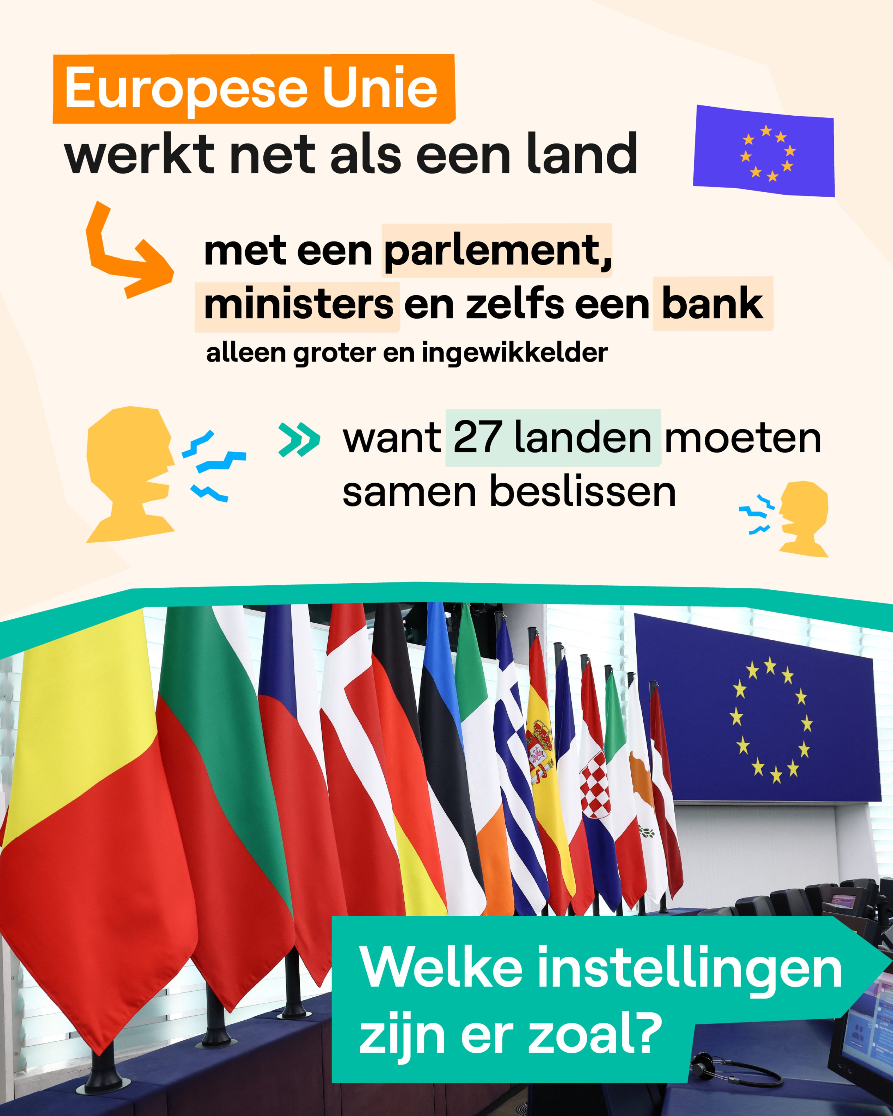 Als je 16 of 17 jaar bent, mag je op 9 juni 2024 gaan stemmen voor het Europees Parlement. Da’s een van de instellingen van de Europese Unie. Maar wat is de Europese Unie eigenlijk, en welke instellingen zijn er nog?