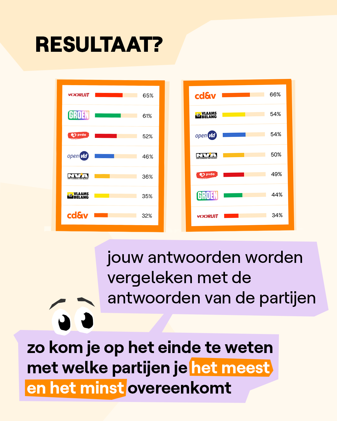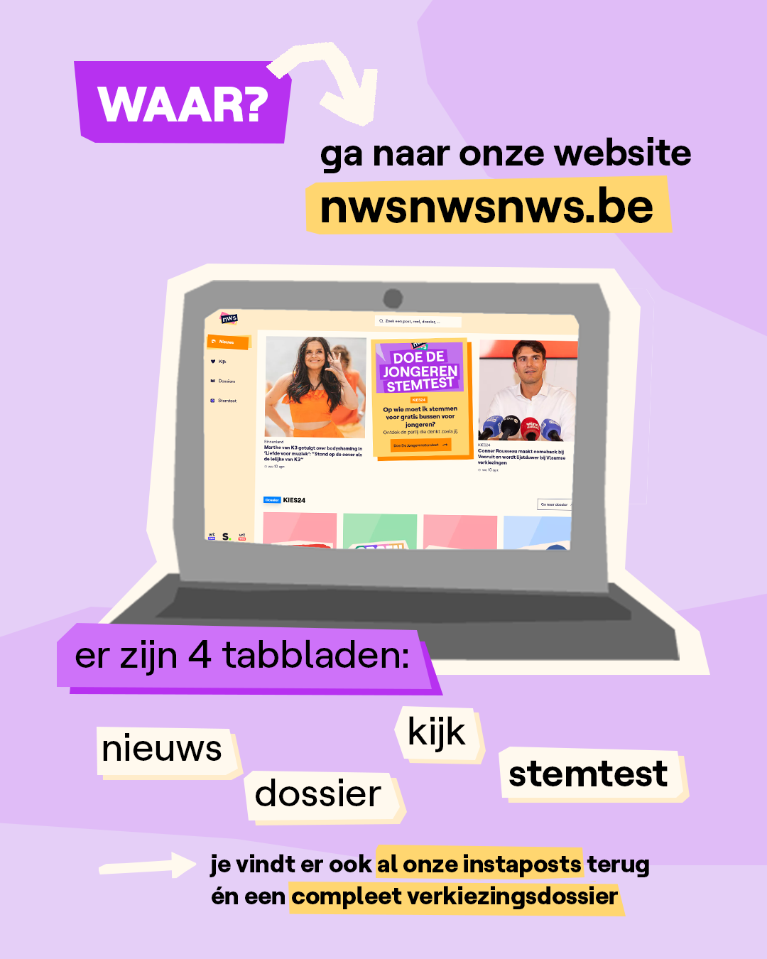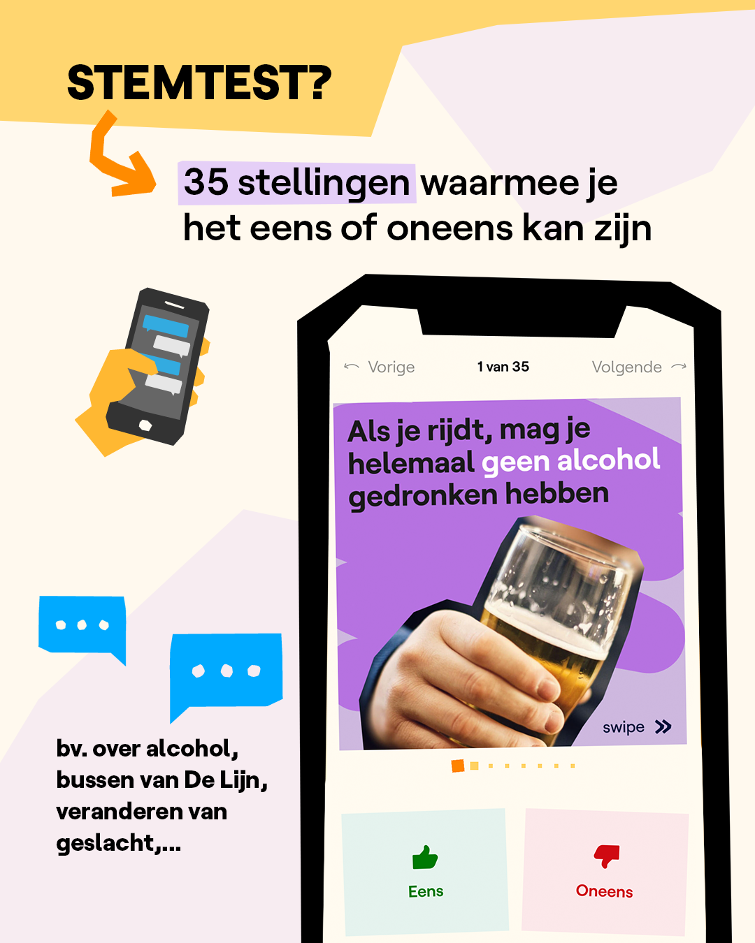 Op 9 juni zijn er verkiezingen. Vanaf 16 kan je gaan stemmen voor de Europese verkiezingen. Ben je 18 dan kan je ook stemmen voor de federale en de regionale verkiezingen. Heb je nog geen idee op wie je gaat stemmen? Dan kan je onze Jongerenstemtest doen om te ontdekken welke partij het beste past bij jouw standpunten. Hoe doe je dat? Swipe voor een handleiding.