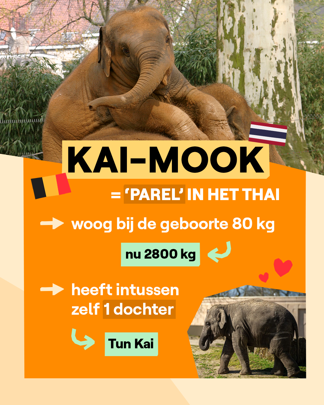 Kai-Mook was 15 jaar geleden de allereerste olifant die in ons land geboren werd. Haar geboorte was toen groot nieuws. Tienduizenden mensen volgden alles live via de website van de Zoo van Antwerpen en op grote schermen in de stad Antwerpen. De verzorgers van de olifanten gaven commentaar bij de bevalling. Kai Mook werd ingeschreven in het Antwerps bevolkingsregister én kreeg zelfs een echte babyborrel. Nu kan je Kai-Mook terugvinden in de zoo Planckendael.