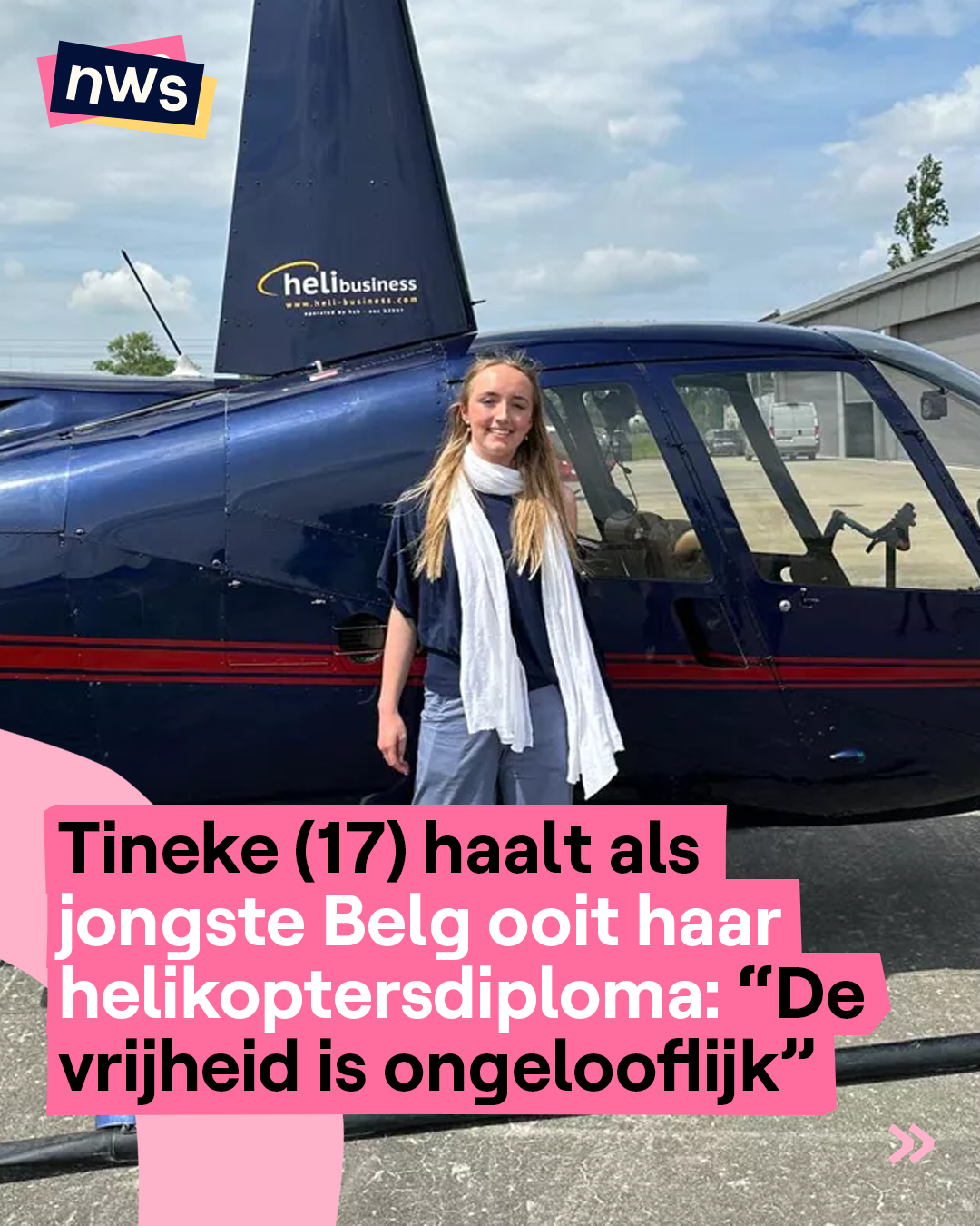 Een autorijbewijs kan ze nog niet halen, maar haar heliktopersdiploma is wel al binnen! Tineke slaagde gisteren, op de dag van haar 17de verjaardag, voor het praktijkexamen helikopterpiloot. Ze is daarmee de jongste Belg ooit die het diploma PPL(H) (Private Pilot Licence (Helicopter)) behaalt. Ze studeert wetenschappen-wiskunde aan het Sint-Jozefscollege in Torhout. Toen Tineke tijdens de kerstexamens in het 3e middelbaar hoge punten haalde, kreeg ze van haar leerkrachten de kans om enkele lesuren per week vrij in te vullen. Na even zoeken, koos ze voor... een opleiding helikopterpiloot. Swipe!