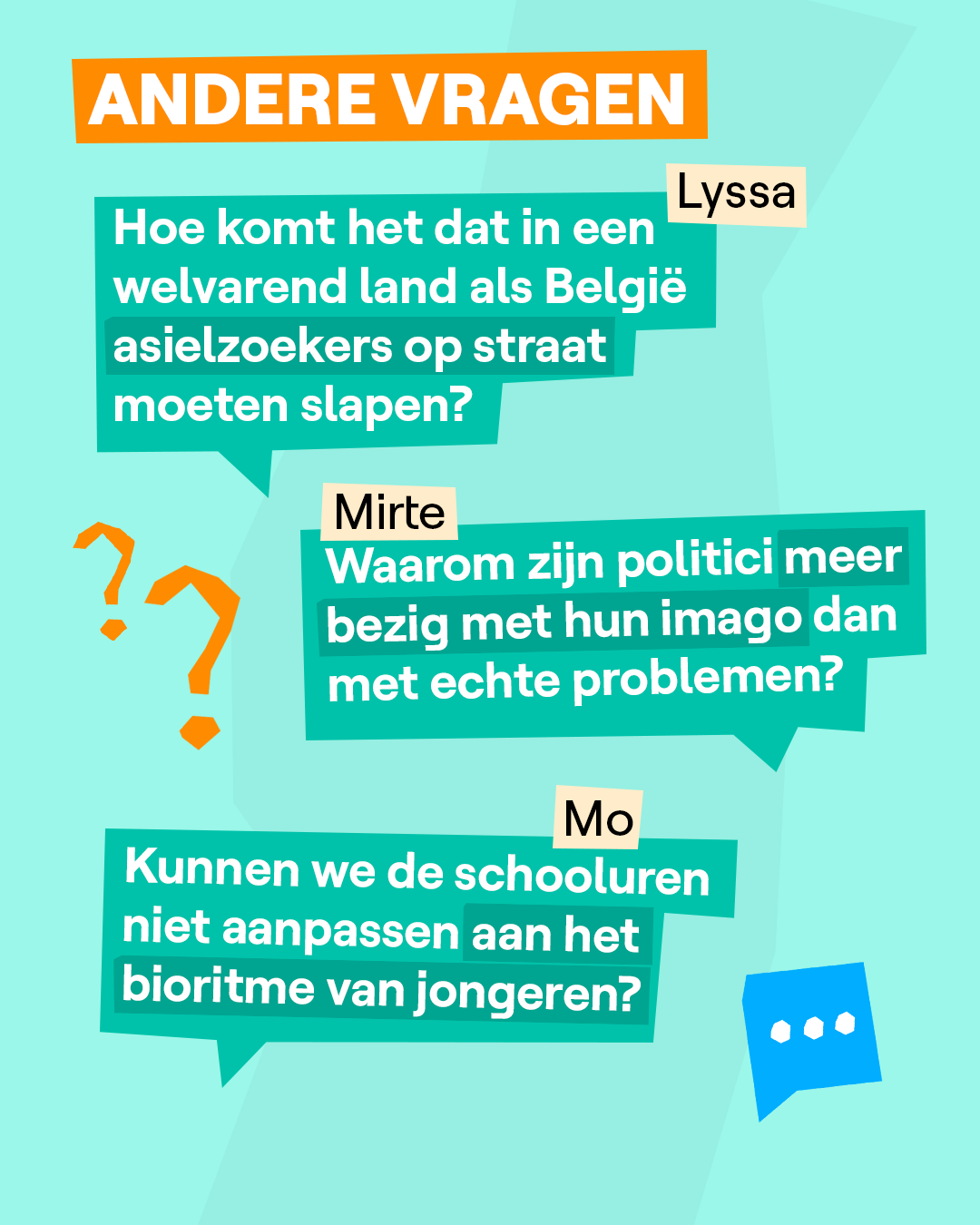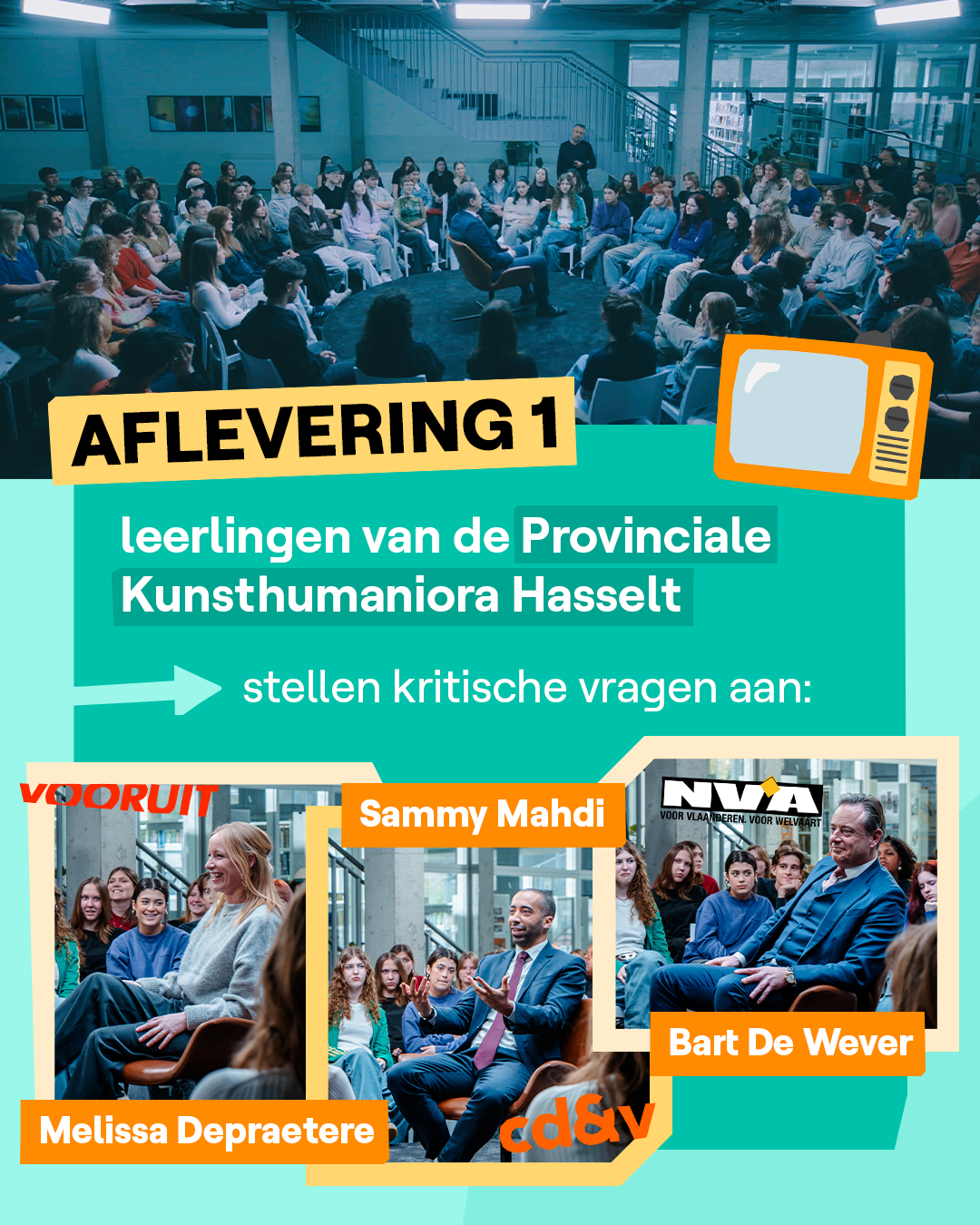 Vanavond kan je kijken naar de eerste aflevering van ‘Eerste Keus’. Zesdejaars uit verschillende Vlaamse scholen krijgen de kans om hun kritische vragen op politici af te vuren. Vandaag is het de beurt aan de leerlingen van de Provinciale Kunsthumaniora in Hasselt. Liggen deze creative minds, die elke dag bezig zijn met beeldende kunst, dans of muziek, ook wakker van de politiek? En welke vragen hebben ze voor politici? Eerste keus, te bekijken om 20u50 op VRT1 of op vrtmax.be.