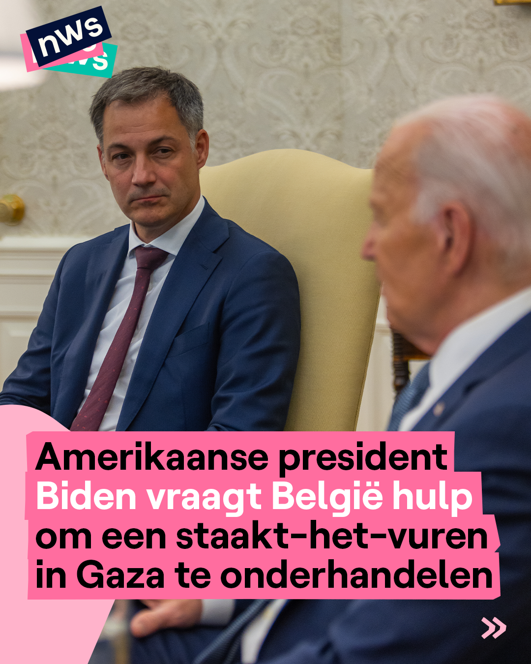 Premier Alexander De Croo was gisterenavond op bezoek in Het Witte Huis. Hij sprak daar met de Amerikaanse president Joe Biden onder meer over de oorlog in Gaza. Biden vroeg hulp aan België om de Palestijnen rond te tafel te krijgen en een staakt-het-vuren in Gaza te onderhandelen. De president zei ook aan De Croo dat hij hetzelfde doel heeft als België: een einde maken aan het geweld in Gaza. Kort voor zijn ontmoeting met onze premier, heeft Biden een voorstel voor een staakt-het-vuren bekendgemaakt. Het voorstel zou van Israël komen en stap voor stap naar een definitief einde van de oorlog willen werken. De Croo is de eerste Belgische premier in 18 jaar tijd die is uitgenodigd voor een afspraak in het Witte Huis.