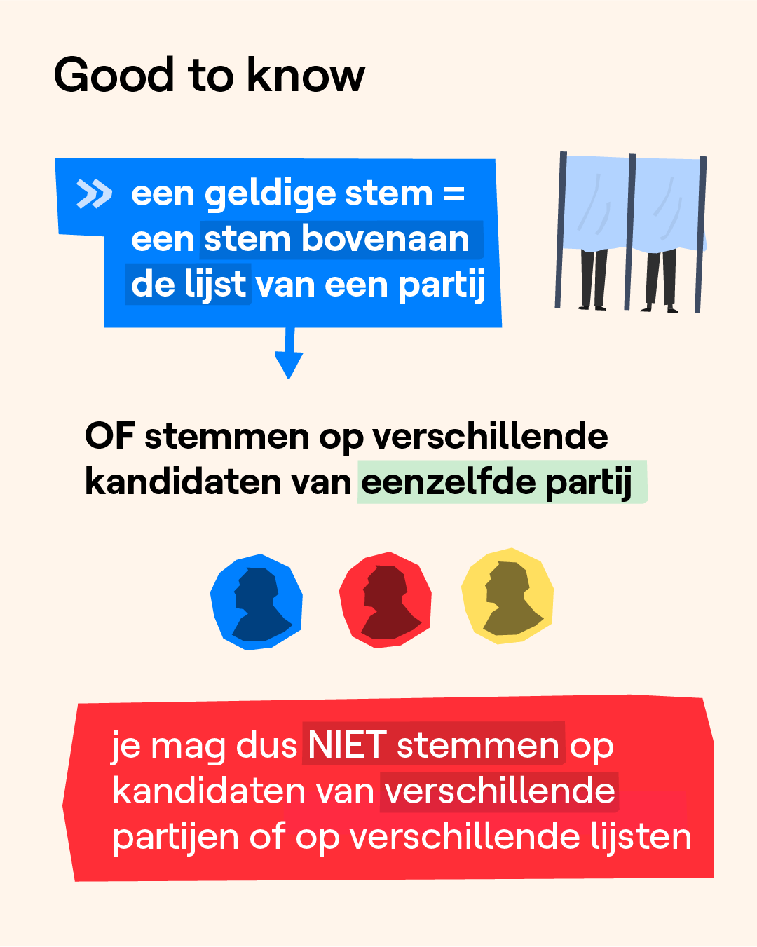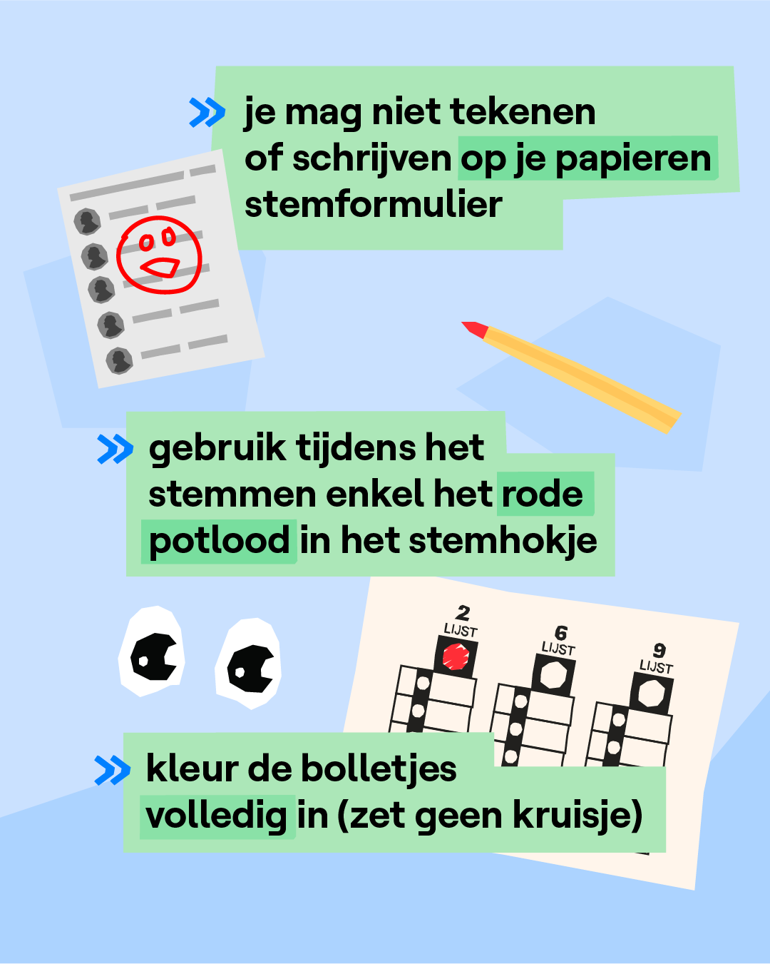 Hoe breng je een geldige stem uit zondag? Swipe om onze twee tutorials te bekijken. Stem jij nog op een papieren stembiljet? Let er dan op dat je bij de papieren versie het bolletje of de bolletjes volledig inkleurt met het rode potlood dat in het stemhokje ligt.