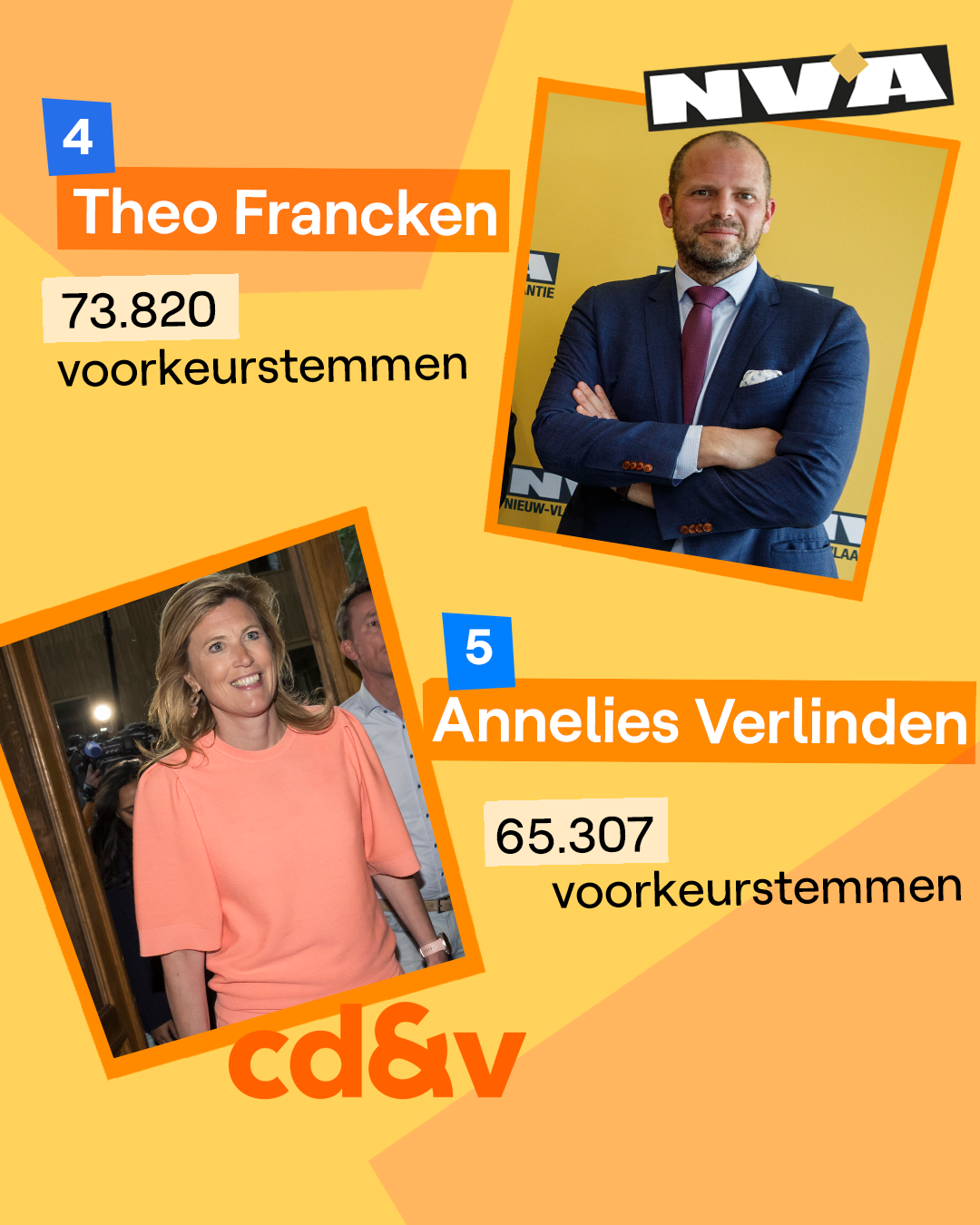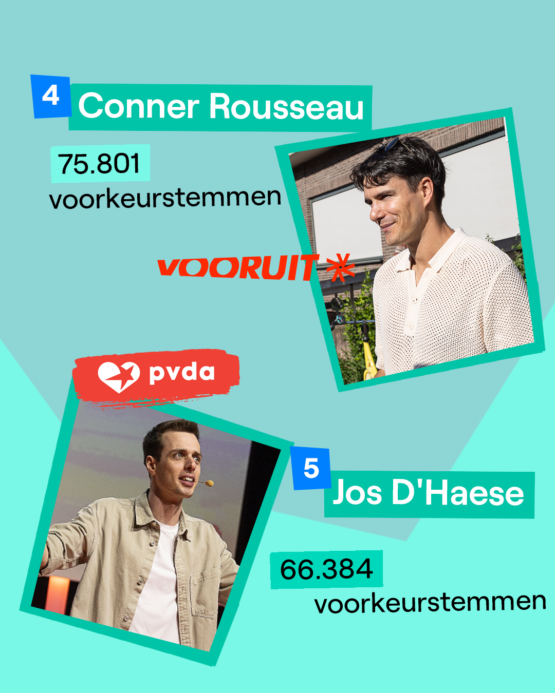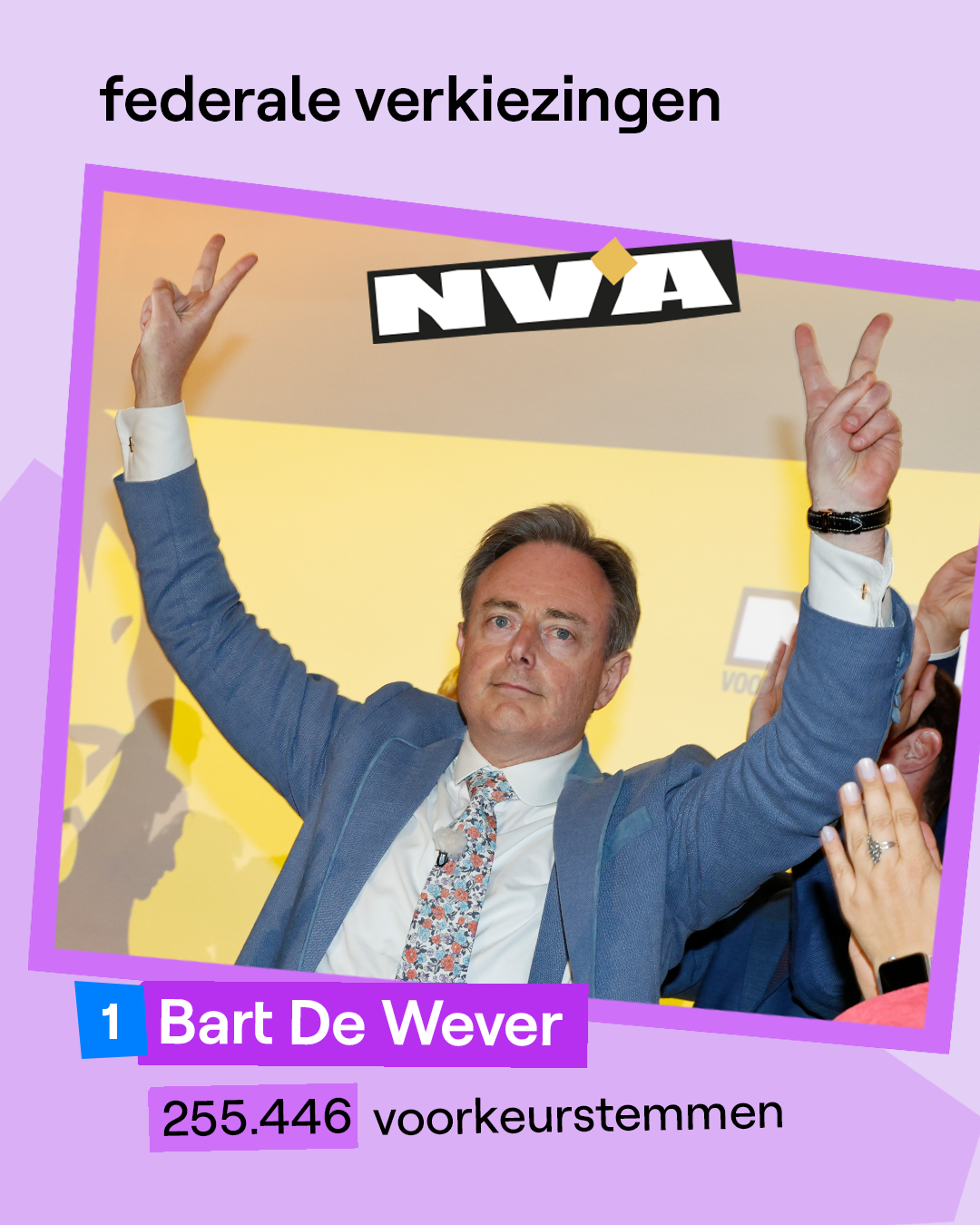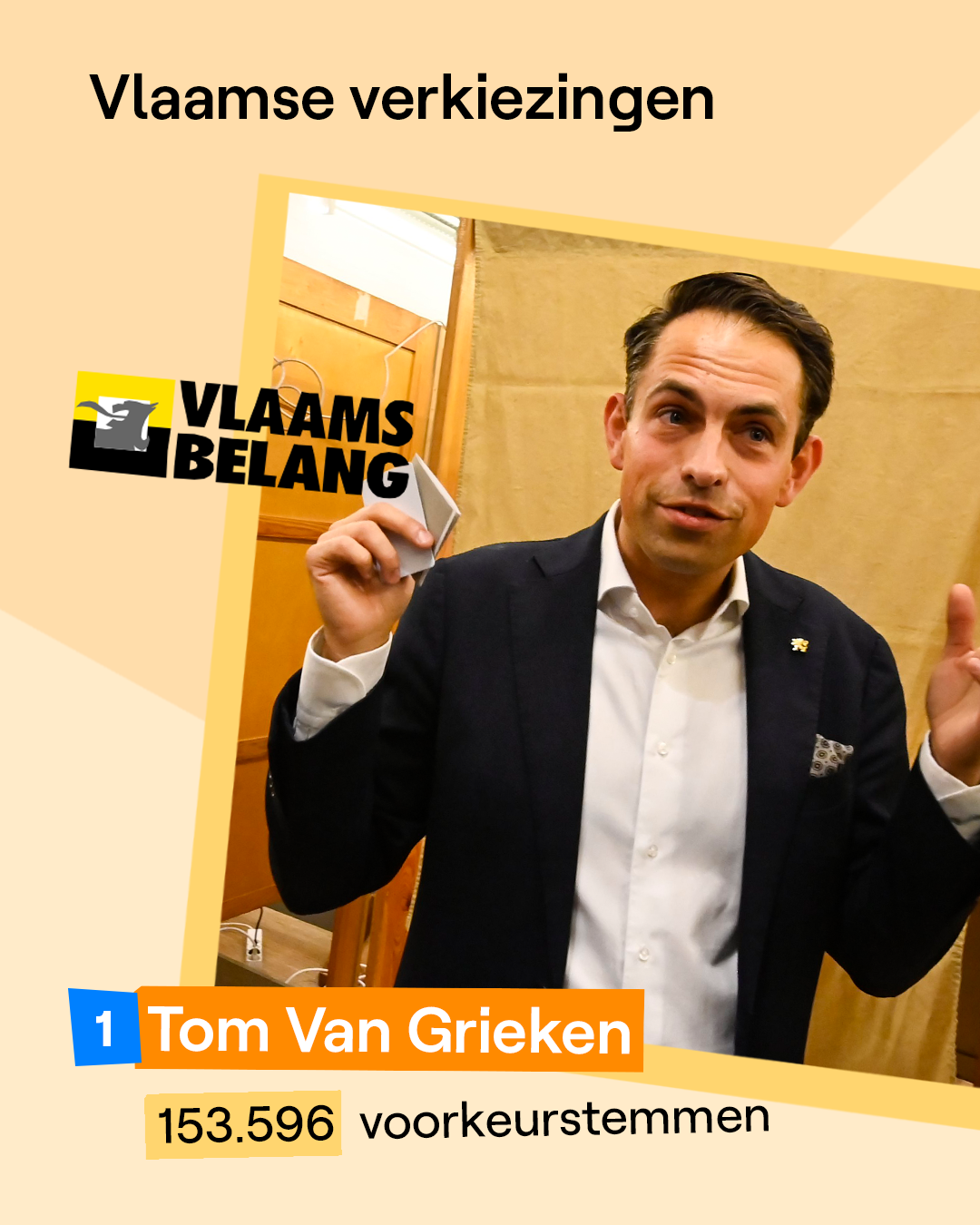 Nu alle stemmen geteld zijn, kennen we ook de populairste politici aan de hand van de voorkeurstemmen. Een voorkeurstem is een stem voor een specifieke politicus. Tom Van Grieken kreeg de meeste voorkeurstemmen in de Vlaamse verkiezingen. In de federale verkiezingen is het Bart De Wever die bovenaan staat. Swipe voor een top vijf van de populairste politici voor zowel de Vlaamse als federale verkiezingen.