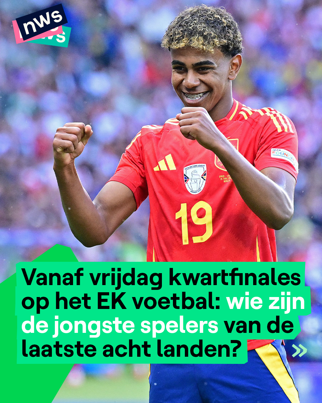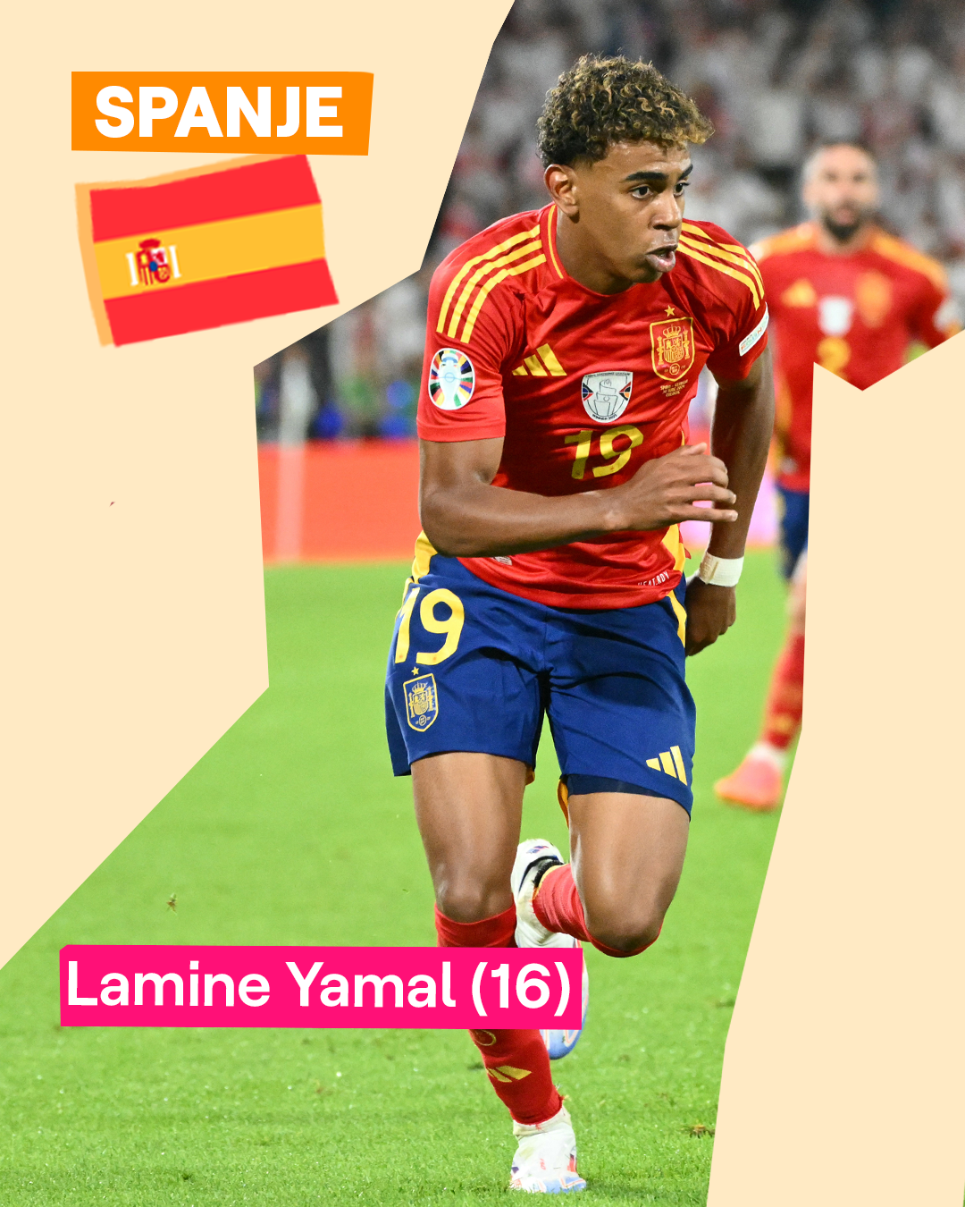 Lamine Yamal (die je ziet op de cover) is de jongste speler ooit op een Europees kampioenschap voetbal. De Spanjaard wordt 17 jaar op 13 juli, precies één de dag voor de finale van het EK. Maar ook bij de andere zeven landen die in de kwartfinale staan, speelt jong talent. Swipe! De oudste speler dit EK is trouwens de Portugees Pepe, met 41 jaar en 4 maanden.