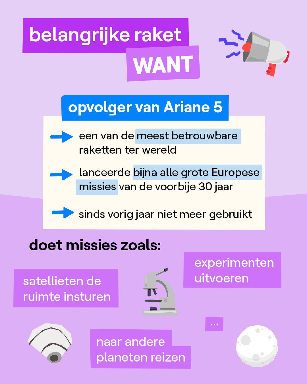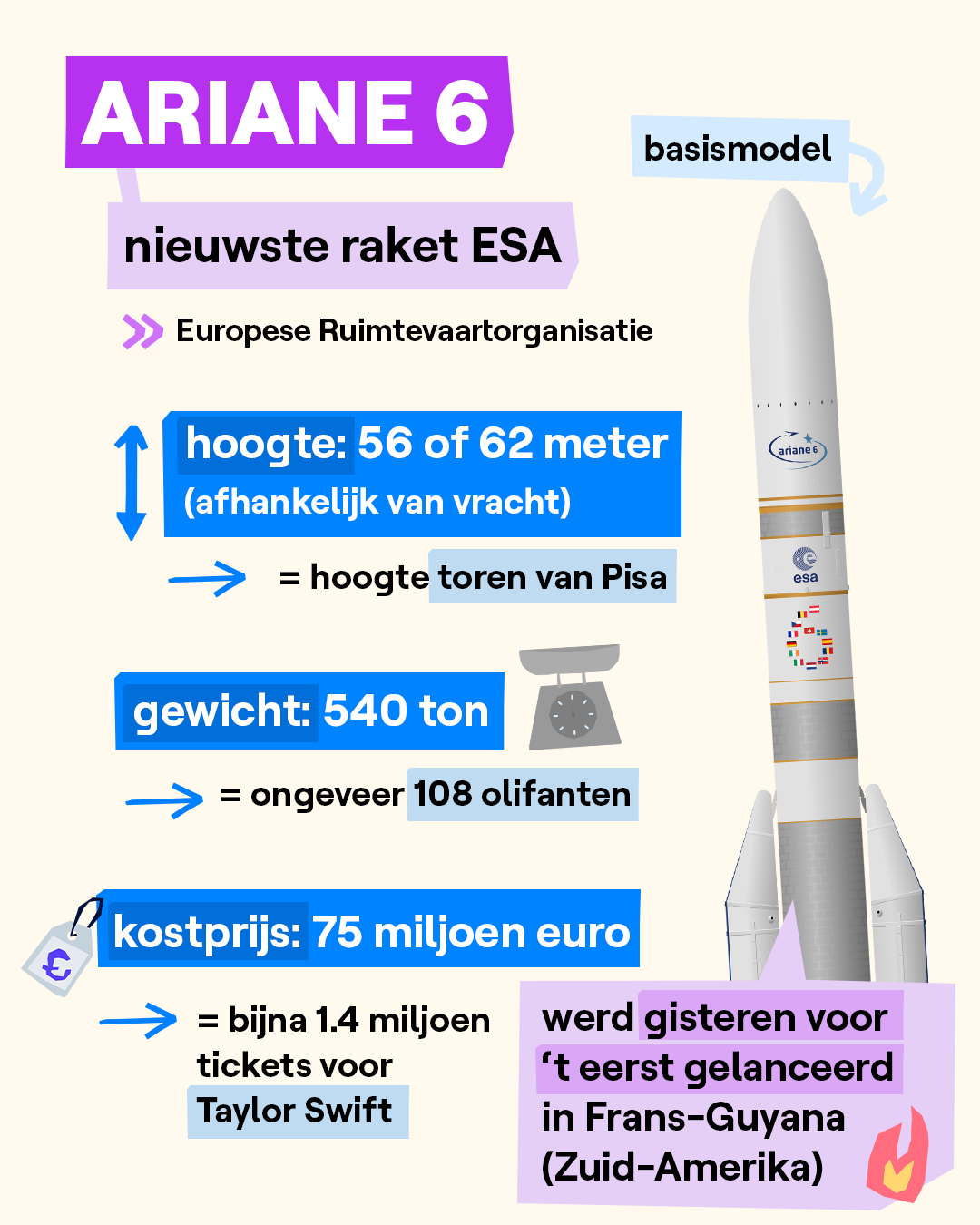 Lift off! Gisterenavond steeg de Ariane 6 op in Frans-Guyana (Zuid-Amerika). De bedoeling is om 16 experimenten en kleine satellieten in een baan om de aarde te brengen. Een van die experimenten werd bedacht door Lore, Julien en hun klasgenoten. Ze ontwikkelden een toestel dat de sterkte meet van het aardmagnetische veld en de invloed van de zon erop. Dat veld is een onzichtbare kracht om de aarde die ons beschermt tegen de schadelijke straling van de zon en waardoor we kunnen vliegen. Als alles goed verloopt, is Europa niet langer afhankelijk van andere landen om de ruimte in te gaan, zoals Amerika. Naast deze lancering, zijn er al 30 nieuwe lanceringen met Ariane 6 gepland.