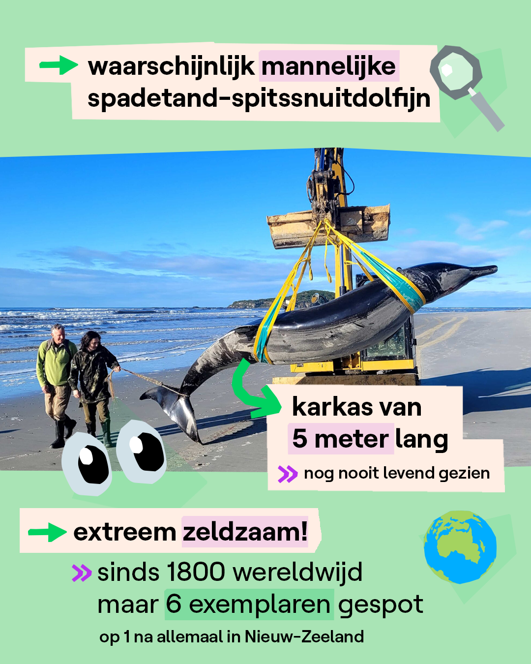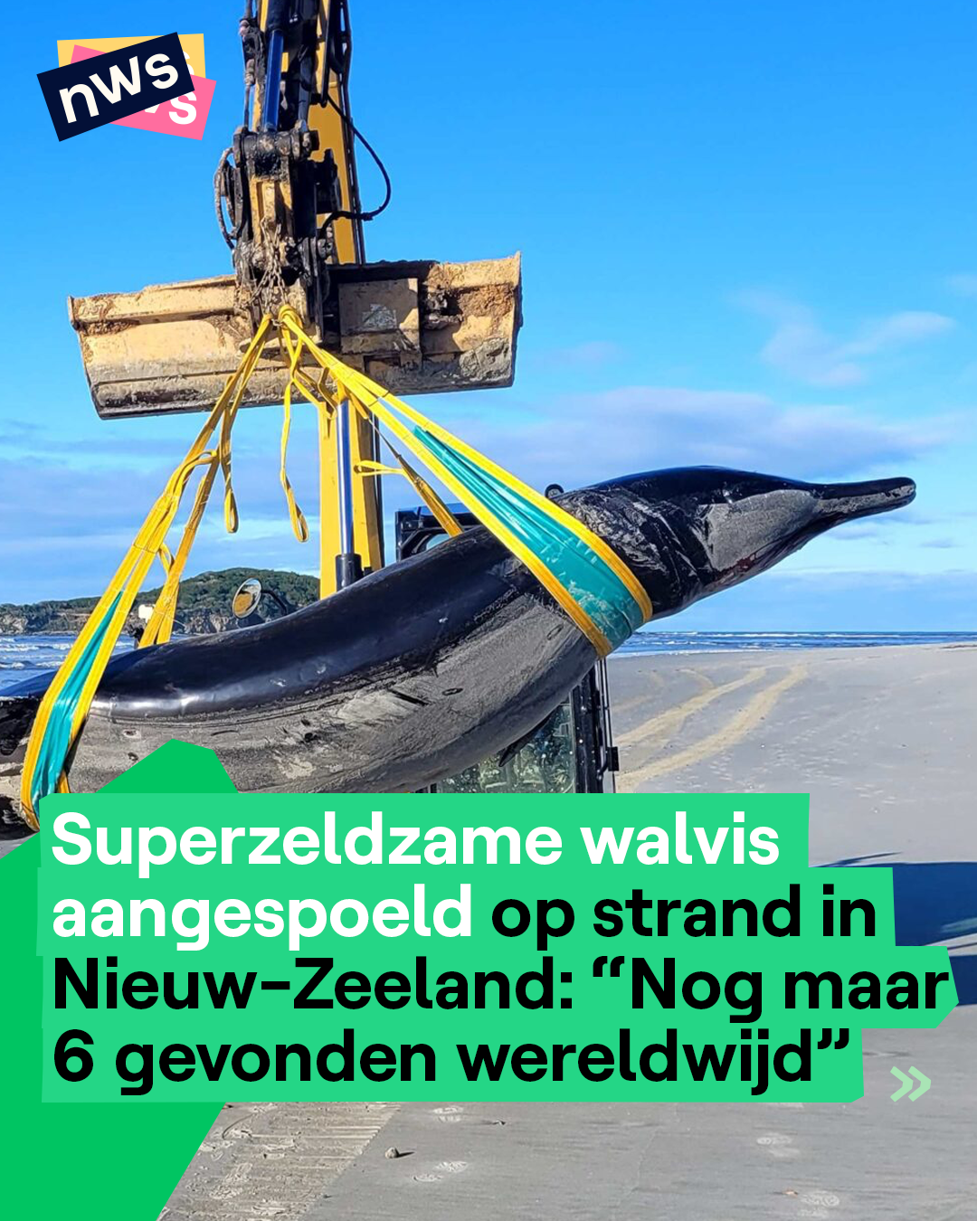 Wat is de kans? Op een strand in Nieuw-Zeeland is een van de meest zeldzame en minst bekende walvissoorten aangespoeld: een spadetand-spitssnuitdolfijn. Een Australische universiteit zal het DNA van het dier onderzoeken. Omdat de walvissoort zó zeldzaam is, kan het even duren voor de resultaten bekend zijn. De overblijfselen van het dier worden nu bewaard in een koelcel tot er een beslissing is genomen over de volgende stappen. De onderzoekers zullen ook overleggen met de inheemse bevolking van Nieuw-Zeeland (de Maori), zodat het karkas op de juiste manier en met respect behandeld wordt. Voor de Maori zijn walvissen meer dan alleen dieren: ze zien een directe band tussen henzelf en de zeezoogdieren én beschouwen ze als hun voorouders.