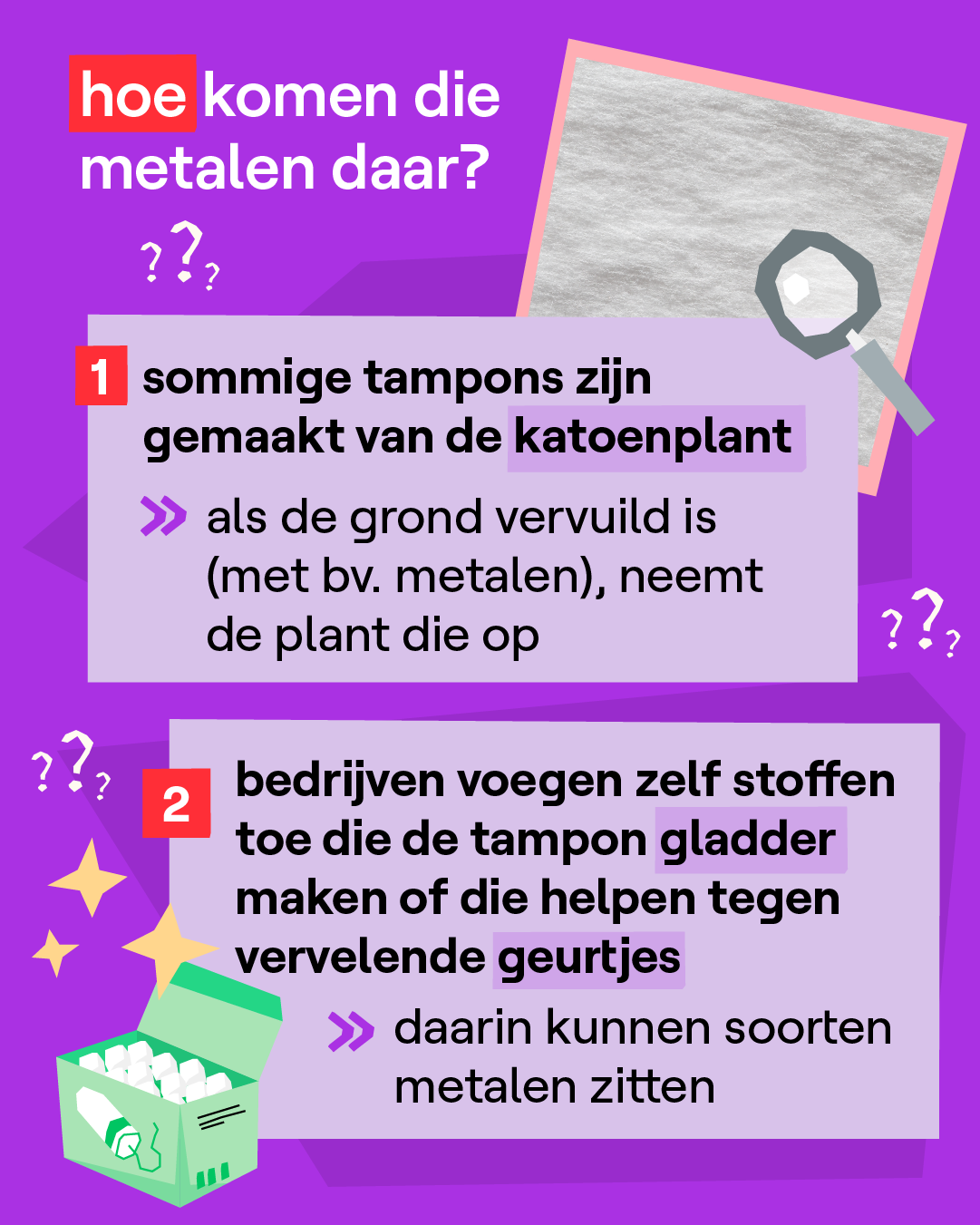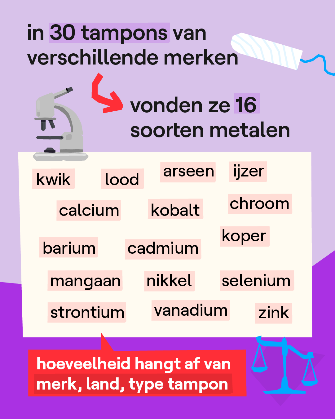 Tampons bestaan al meer dan 90 jaar. Toch bestaat er tot nu toe heel weinig wetenschappelijk onderzoek over. Het Amerikaanse onderzoek is het eerste dat heeft onderzocht of tampons metalen bevatten. Volgens de wetenschappers toont het onderzoek ook een groot probleem bij de industrie. Zij vinden dat de bedrijven meer open moeten zijn over hoe ze de tampons maken en wat er in zit. Menstruatieproducten - zoals tampons - worden ook niet gezien als 'medisch materiaal'. Daardoor mag er in tampons een even grote hoeveelheid metalen zitten als in bijvoorbeeld huidcrème. Terwijl onze huid iets helemaal anders is dan de vaginale huid. Of er ook metalen zitten in maandverbanden, is niet duidelijk. Daar is nog geen onderzoek naar gedaan.