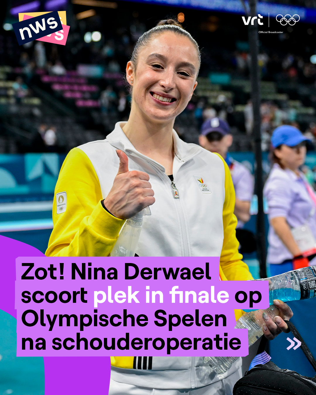 Tranen van geluk bij turnster Nina Derwael! Gisteren plaatste ze zich voor de finale op de Olympische Spelen op de brug met ongelijke leggers. Da's heel straf, want amper 10 maanden geleden is Nina geopereerd aan haar schouder. Daardoor was het zelfs helemaal niet zeker of ze de Olympische Spelen zou halen. "Ik heb echt geen woorden om dit te beschrijven", reageerde ze achteraf. De brug met ongelijke leggers is Derwaels favoriete oefening. Tijdens de Olympische Spelen in Tokio in 2020 won ze daarvoor goud. 't Was een succesvol weekend voor Belgen op de Olympische Spelen. Naast de medailles voor Remco Evenepoel en Wout van Aert, mogen ook onder meer de Red Panthers en bokser Victor Schelstraete door naar volgende rondes.