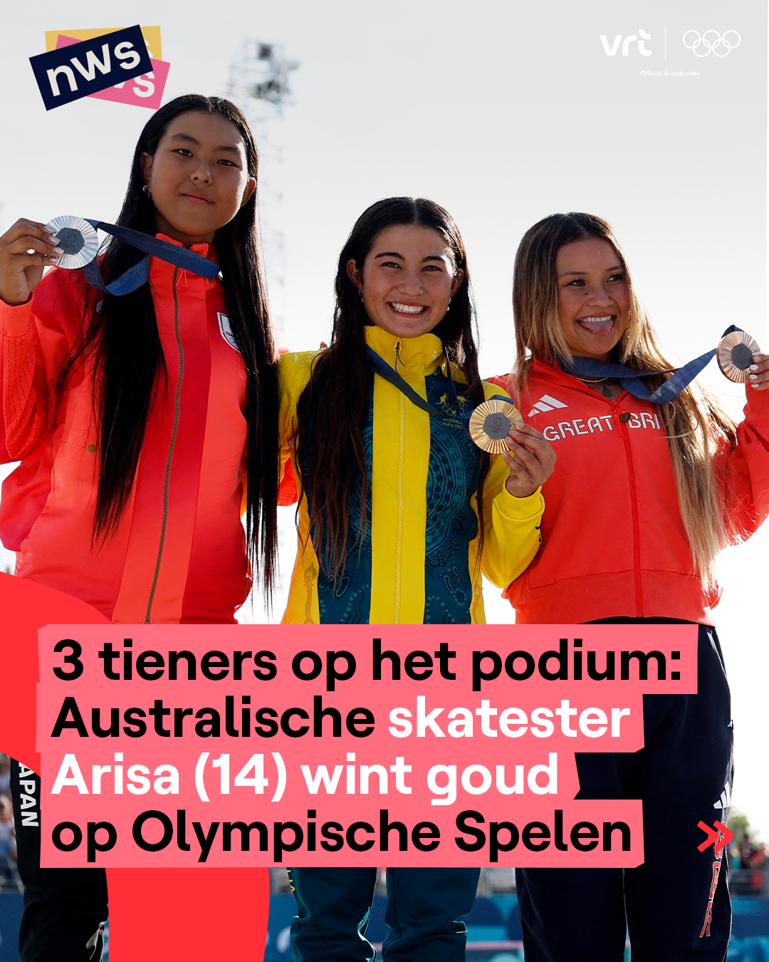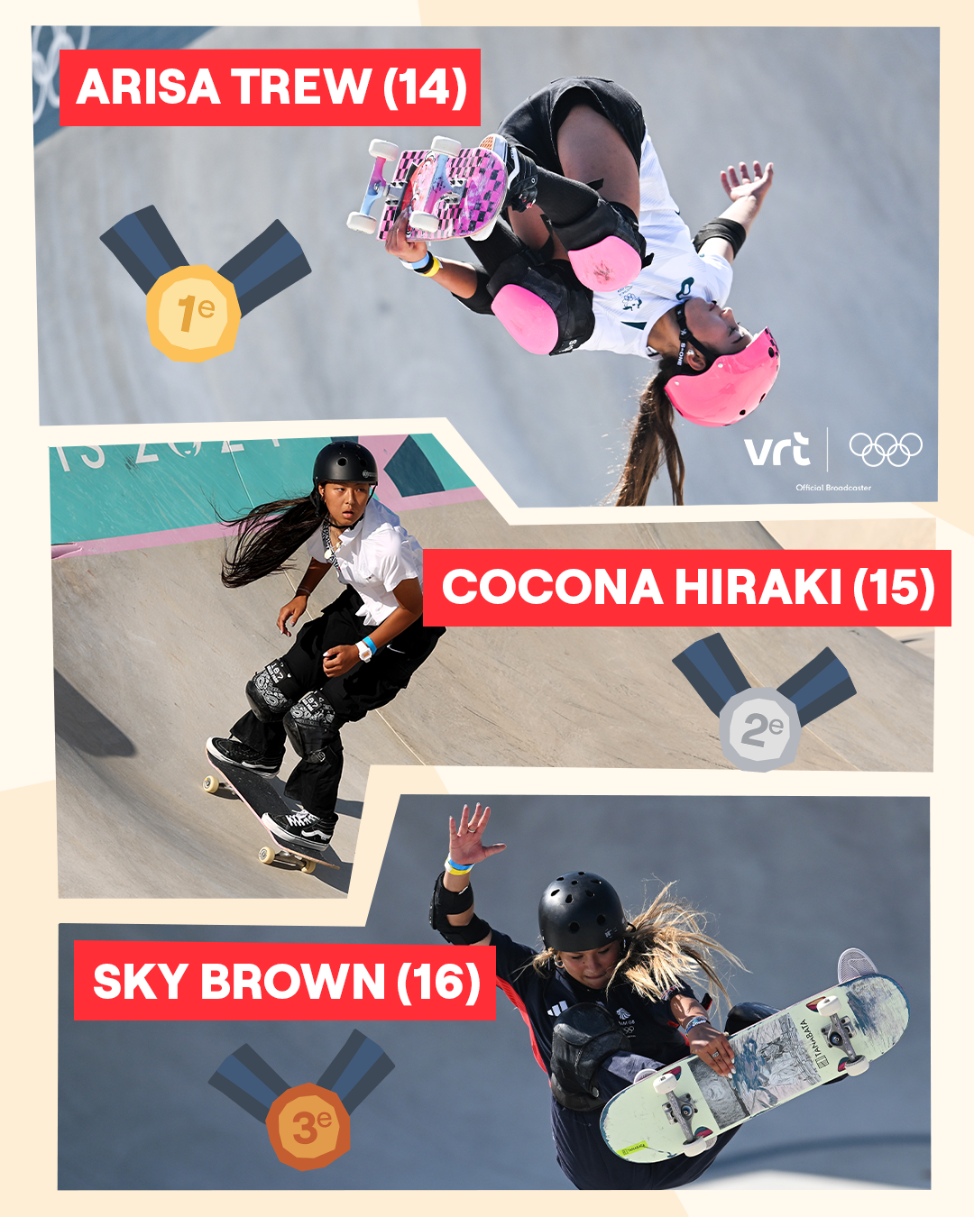 14, 15 en 16 jaar oud! Op het podium van het skateboarden op de Olympische Spelen staan alleen maar tieners. De Australische Arisa Trew (14) pakte op haar allereerste spelen meteen goud in de discipline park. Daarbij proberen skaters in de bowl (= betonnen kuip met obstakels) zo veel mogelijk tricks te doen binnen de 45 seconden. De Japanse Cocona Hiraki (15) eindigde op de tweede plaats. De Britse Sky Brown (16) werd derde, net zoals tijdens de Spelen in Tokio. Ook de 11-jarige Zheng Haohao deed vandaag mee aan de wedstrijd. Ze is de jongste atlete op deze Spelen. Zheng geraakte uiteindelijk niet tot in de finale.