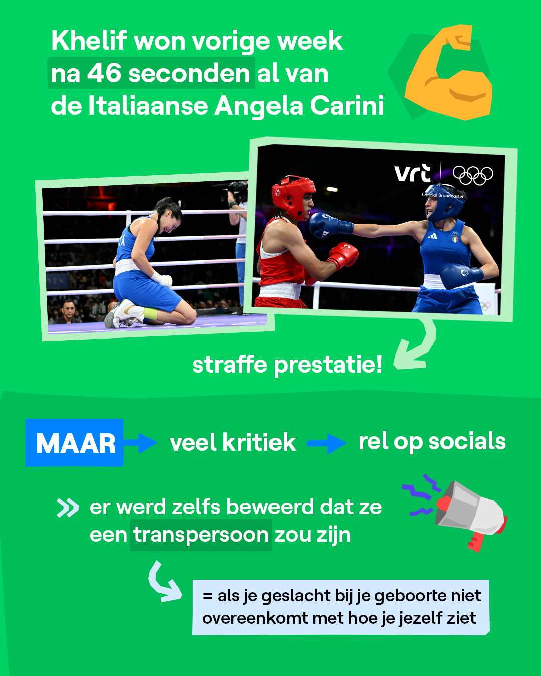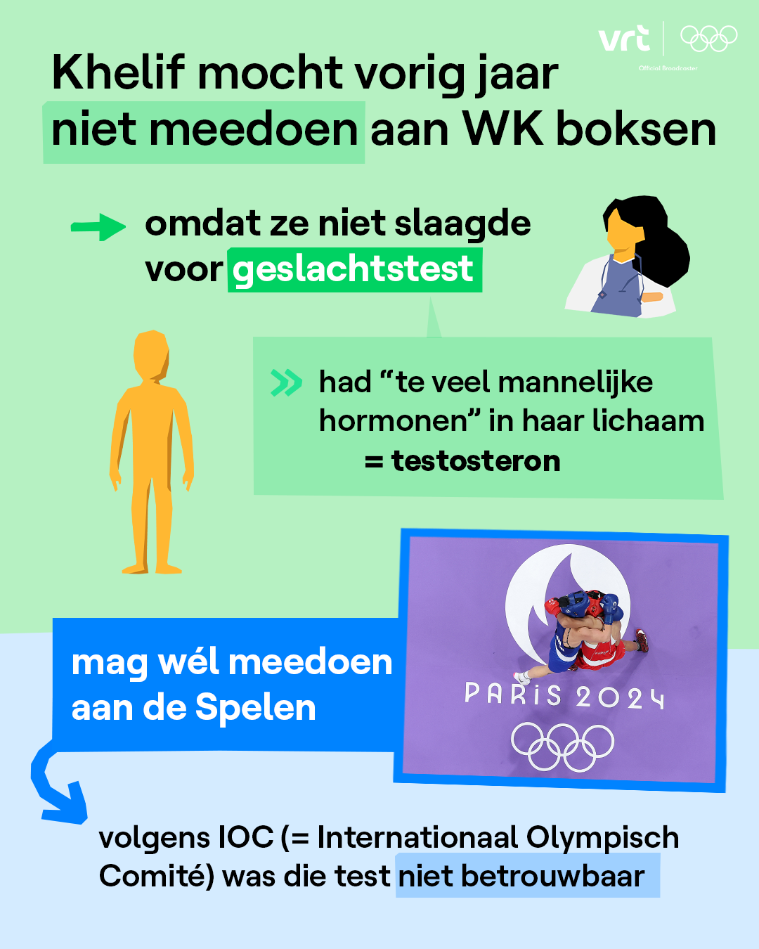 Khelif is trouwens niet de enige boksster die veel kritiek krijgt. Ook de Thaise Lin Yu-ting, in de gewichtscategorie tot 57 kg, werd vorig jaar op het WK gediskwalificeerd omdat ze té veel mannelijke hormonen had. Ook zij zit in de finale in haar gewichtsklasse.