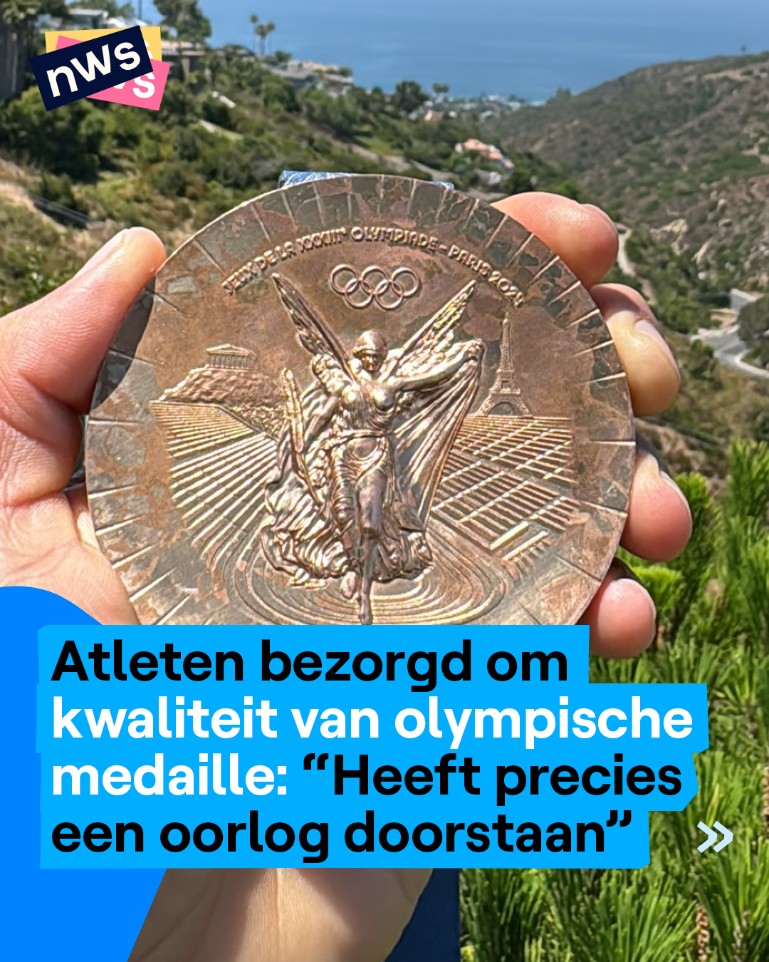 Deze foto van de bronzen medaille van de Amerikaanse skater Nyjah Huston gaat al enkele dagen viraal. Nyjah vond dat zijn olympische medaille er na één weekend wel snel heel slecht uitzag: "Het lijkt alsof hij een oorlog heeft meegemaakt". Andere atleten lieten intussen ook al weten dat hun medaille nu al verkleurd is, beschadigd, of een pak minder glanst dan de medaille van de vorige Olympische Spelen. Volgens sommigen is het heel normaal dat metaal verkleurt. Maar het Olympisch Comité gaat toch onderzoeken waarom de kwaliteit van de medailles zo slecht zou zijn. Ze lieten ook weten dat ze beschadigde medailles zullen vervangen. Da's jammer nieuws voor gastland Frankrijk, want de Fransen zijn erg trots op hun medailles. Er zit zelfs een stukje van de Eiffeltoren in verwerkt.