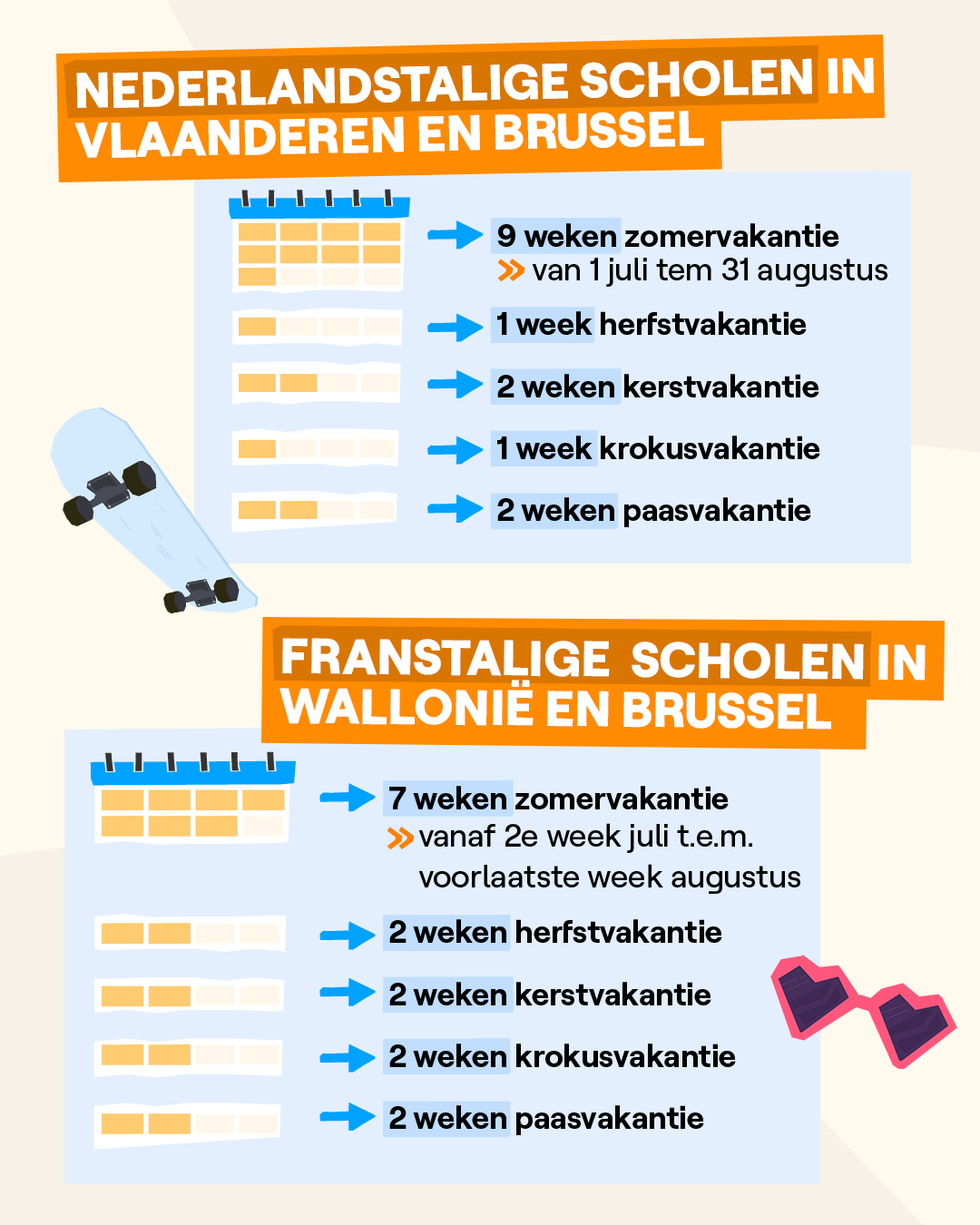 Terwijl jij nog geniet van je laatste week vakantie, moeten leerlingen in het Franstalig onderwijs vandaag weer naar school. Franstalige scholen werken sinds vorig jaar met een '7+2-model’. Dat wil zeggen dat er na 7 weken les altijd 2 weken vakantie volgen. De herfst- en krokusvakantie duren dus een week langer, maar daardoor duurt de zomervakantie ook maar 7 weken. In het Franstalig onderwijs is er dus in totaal evenveel vakantie als in het Nederlandstalig onderwijs, maar het is wat anders verdeeld. Sommige politieke partijen willen ook in het Nederlandstalig onderwijs een kortere zomervakantie, maar daar is lang niet iedereen voorstander van. Jij kan dus nog de rest van de week chillen en genieten. Er wordt trouwens nog de hele week goed weer verwacht, met woensdag zelfs temperaturen tot 29 graden.