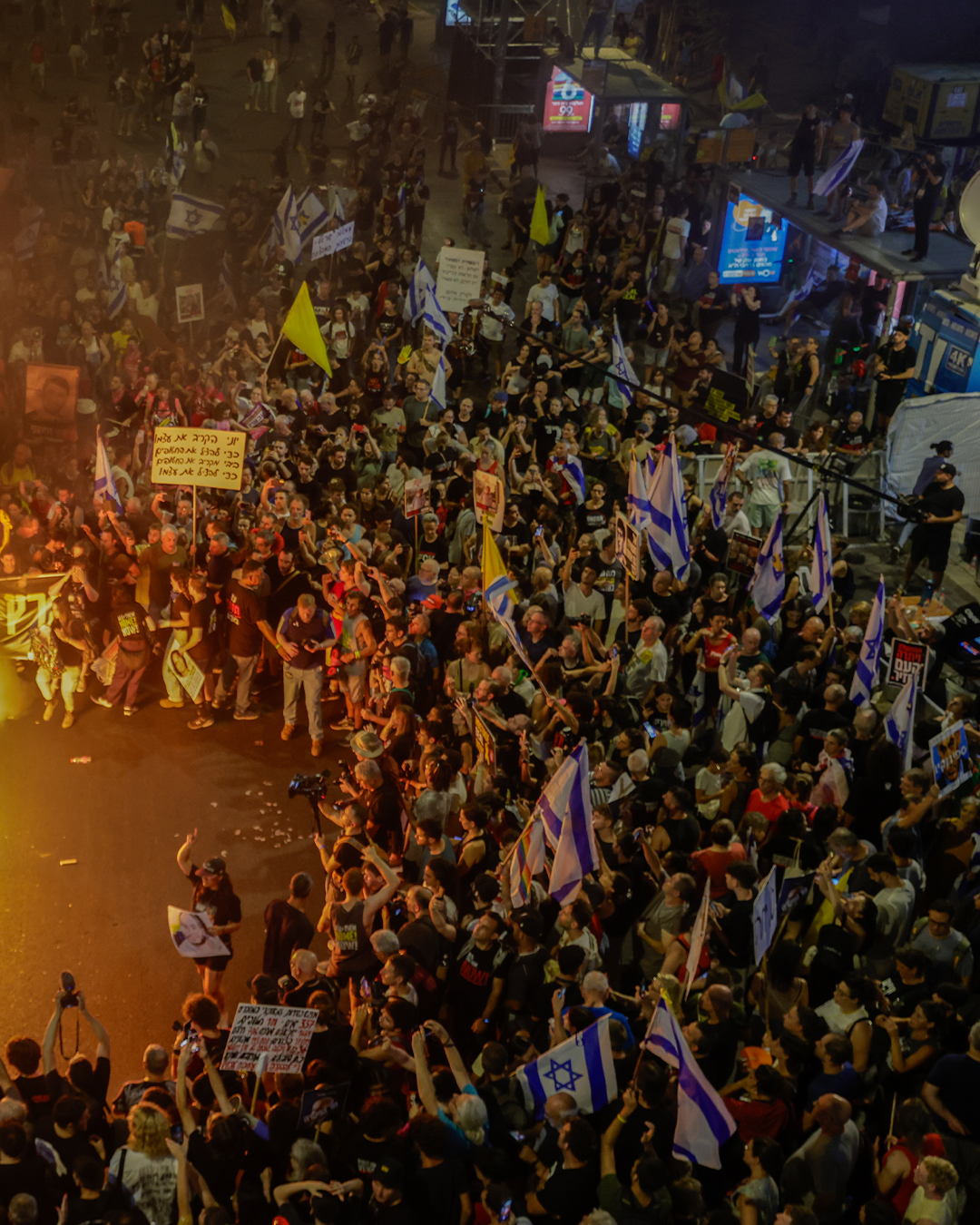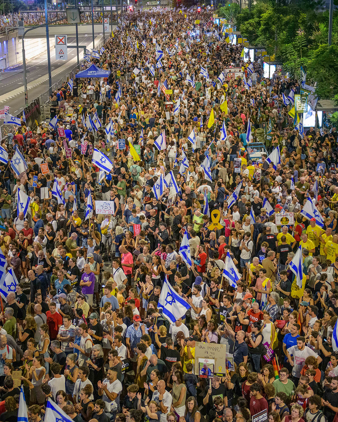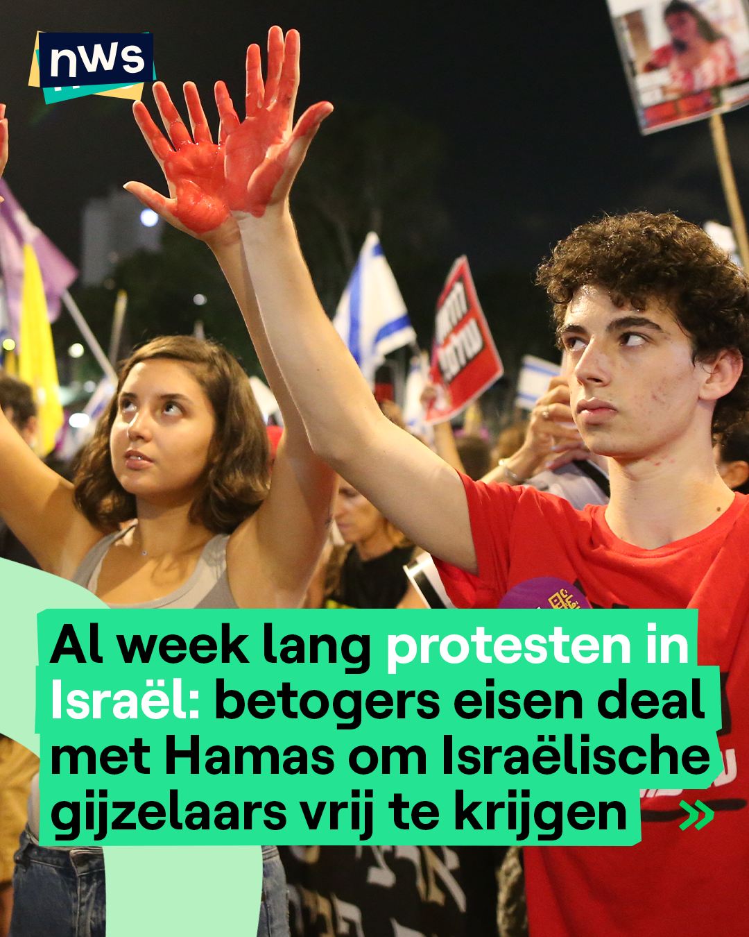 Al de hele week lang zijn er op verschillende plaatsen in Israël grote protesten tegen de regering van premier Netanyahu. De protesten komen er na de ontdekking van lichamen van 6 Israëlische gijzelaars in de tunnels van Rafah (een stad in het zuiden van Gaza) vorige zondag. De betogers beschuldigen de premier ervan dat hij een staakt-het-vuren tegenhoudt en eisen zo snel mogelijk een akkoord met Hamas over de vrijlating van de overgebleven gijzelaars. Het Israëlische leger schat dat er nog een honderdtal in Gaza wordt vastgehouden. Ongeveer een derde van hen zou intussen niet meer in leven zijn.