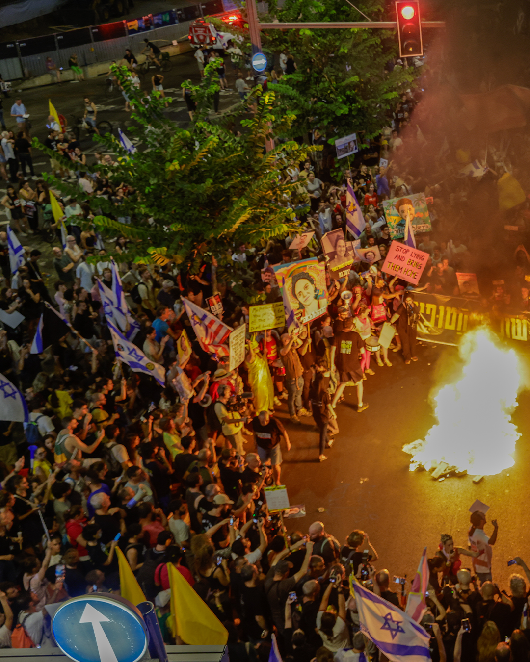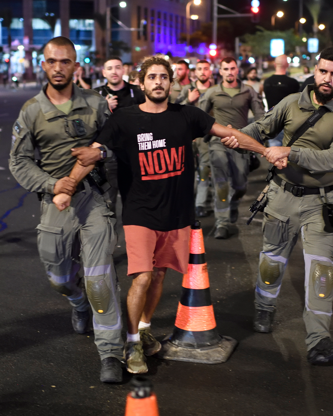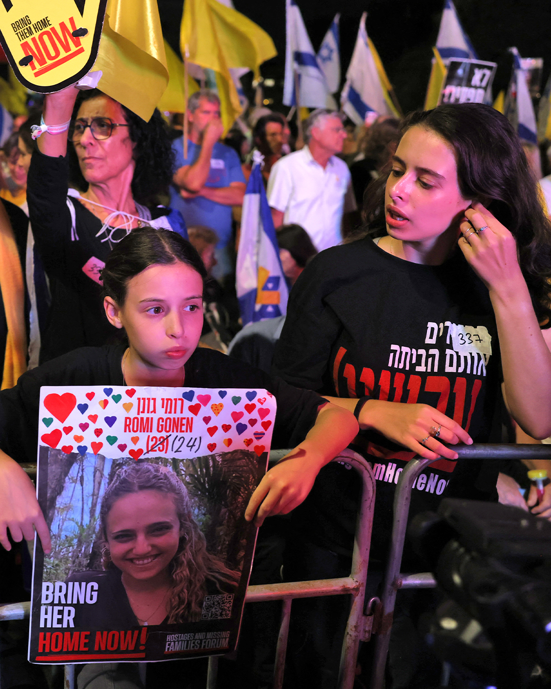 Al de hele week lang zijn er op verschillende plaatsen in Israël grote protesten tegen de regering van premier Netanyahu. De protesten komen er na de ontdekking van lichamen van 6 Israëlische gijzelaars in de tunnels van Rafah (een stad in het zuiden van Gaza) vorige zondag. De betogers beschuldigen de premier ervan dat hij een staakt-het-vuren tegenhoudt en eisen zo snel mogelijk een akkoord met Hamas over de vrijlating van de overgebleven gijzelaars. Het Israëlische leger schat dat er nog een honderdtal in Gaza wordt vastgehouden. Ongeveer een derde van hen zou intussen niet meer in leven zijn.