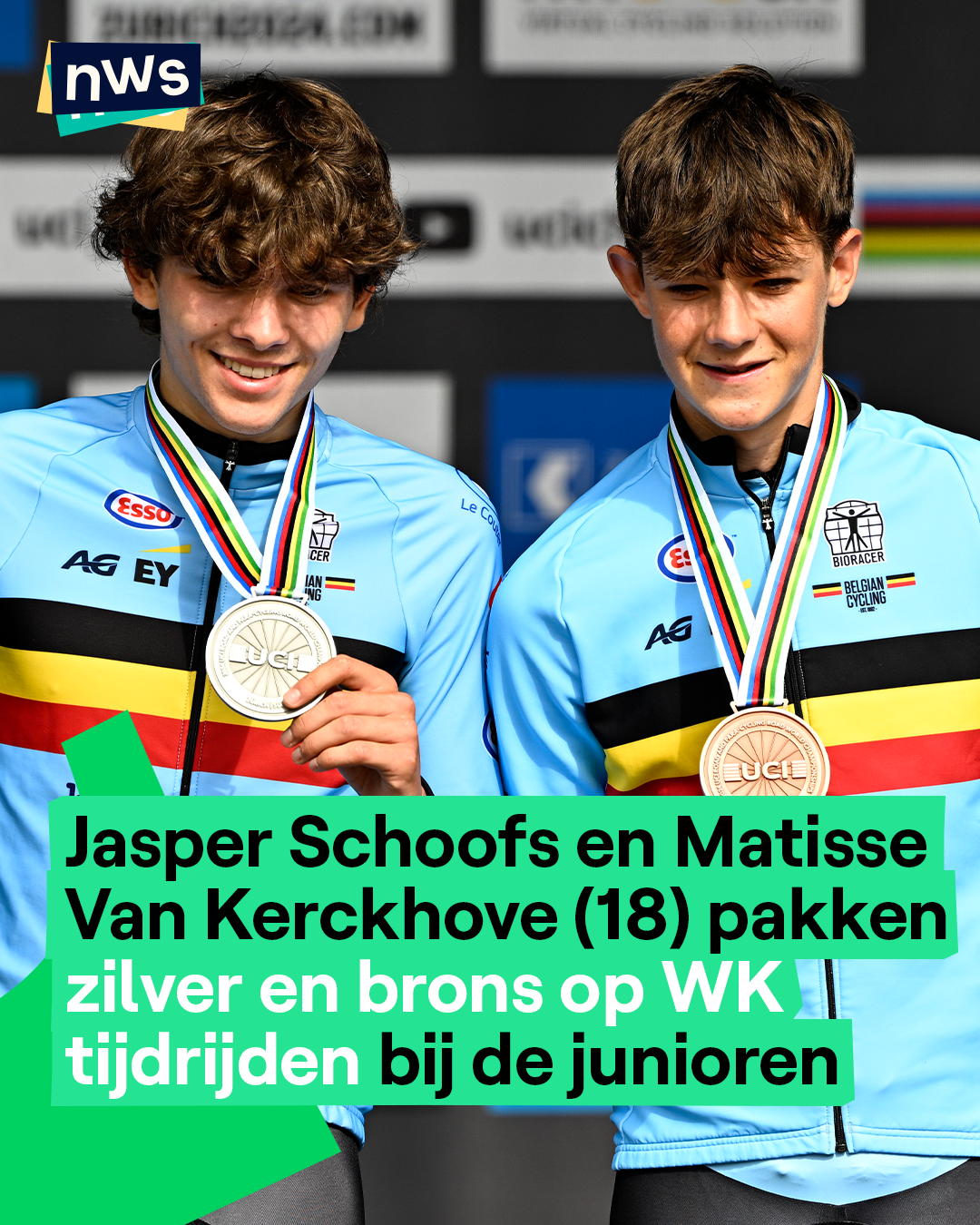 Twee medailles! De 18-jarige wielrenners Jasper Schoofs en Matisse Van Kerckhove hebben zilver en brons gewonnen op het WK tijdrijden bij de junioren. De Franse Paul Seixas (17) pakte goud. ‘t Is de eerste keer ooit dat er twee Belgen samen op dit podium staan. Jasper is heel trots op zijn prestatie. Hij onthulde ook dat hij met hetzelfde wiel als Remco Evenepoel reed. Ook Matisse is tevreden met zijn 3e plaats. “Het is een heel mooie ervaring om op het podium te staan”, klinkt het. In totaal heeft België al 4 medailles gescoord op het WK wielrennen in Zürich (Zwitserland). Gisteren won Remco Evenepoel goud in de tijdrit. Julie De Wilde (21) won brons in de tijdrit voor beloften.