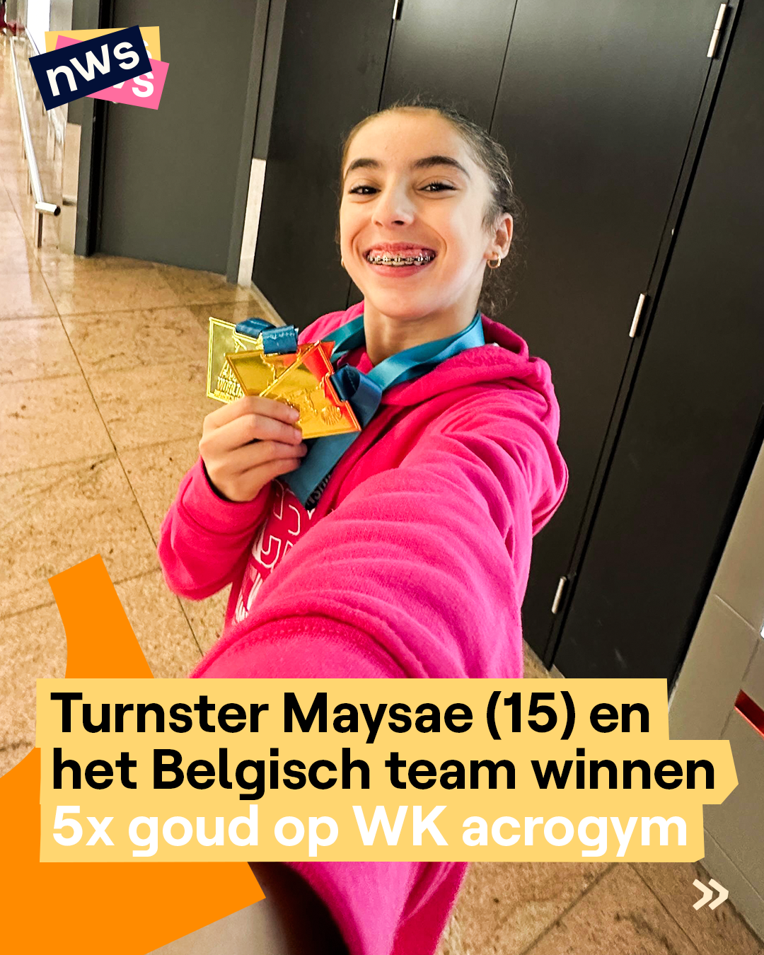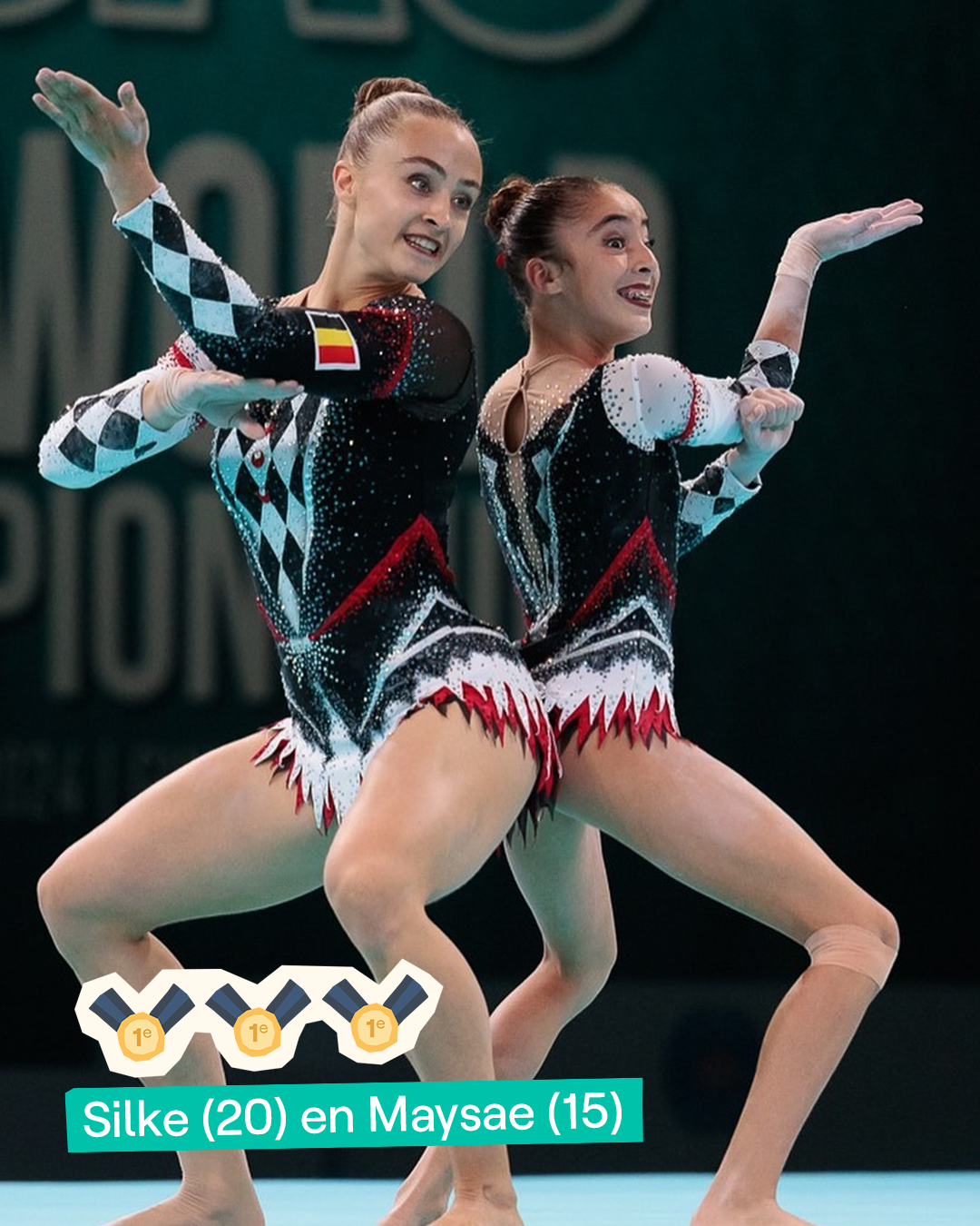 Vijf gouden en één zilveren medaille. Zoveel medailles nam het Belgische team mee naar huis van het WK acrogym in Portugal. Acrogym staat voor 'acrobatische gymnastiek' en is een sport die je in teams doet. Aan het WK namen twee Belgische teams deel. Een team van twee turnsters, Maysae Bouhouch (15) en Silke Macharis (20), en een team van drie turnsters: Mirte Vercauteren (16), Lauren Verbrugghe (19) en Sofie Jaeken (19). België presteerde in het verleden ook al sterk in acrogym. In 2022, tijdens de vorige 'World Games' (Spelen voor niet-olympische sporten), behaalde het Belgische team twee gouden en een zilveren medaille. De volgende 'World Games' waar de turnsters ook aan deelnemen, vinden volgend jaar in augustus plaats in China.