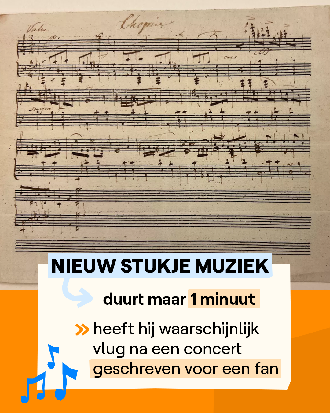 Het nieuwe stukje muziek is gevonden in een Amerikaanse bibliotheek. De noten staan neergeschreven op een klein stukje papier dat tussen een hoop brieven zat van componisten Brahms en Tsjaikovski. Chopin trad niet graag op voor veel mensen en gaf daarom alleen privéconcerten. Hij ligt begraven op de bekende begraafplaats Père-Lachaise in Parijs. Z'n hart wordt bewaard in een vat vol cognac in de Poolse hoofdstad Warschau.