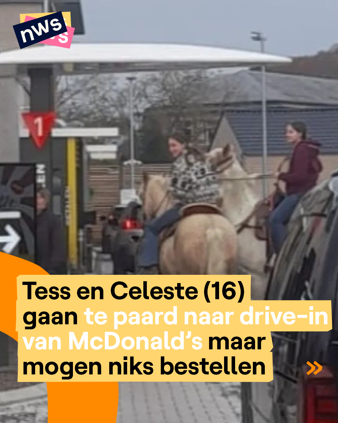 Gekke beelden uit Aarschot, in Vlaams-Brabant. Daar stonden vandaag 2 paarden aan te schuiven bij de drive-in van de McDonald’s. En daarbovenop? Tess en Celeste, twee 16-jarige meisjes. Het stond al lang op hun bucketlist om eens met hun paarden langs te gaan. Maar toen ze mochten bestellen, werden ze met een lege maag naar huis gestuurd. McDonald’s mag aan de drive-in geen klanten bestellen die met de motor, de fiets, te voet of te paard zijn. Een grote teleurstelling voor de twee meisjes. Zeker omdat ze hun paard daar ook niet kunnen stallen en binnen kunnen bestellen. “De paarden waren superbraaf. Ik begrijp niet wat het probleem was”, klinkt het. Geen McFlurry dus vanavond. “Ik was daarnet even boos en zei dat ik hier nooit meer wilde komen”, vertelde Tess, “maar dat was in een opwelling. Waarschijnlijk ga ik wel nog terug, maar dan toch zonder paard.”