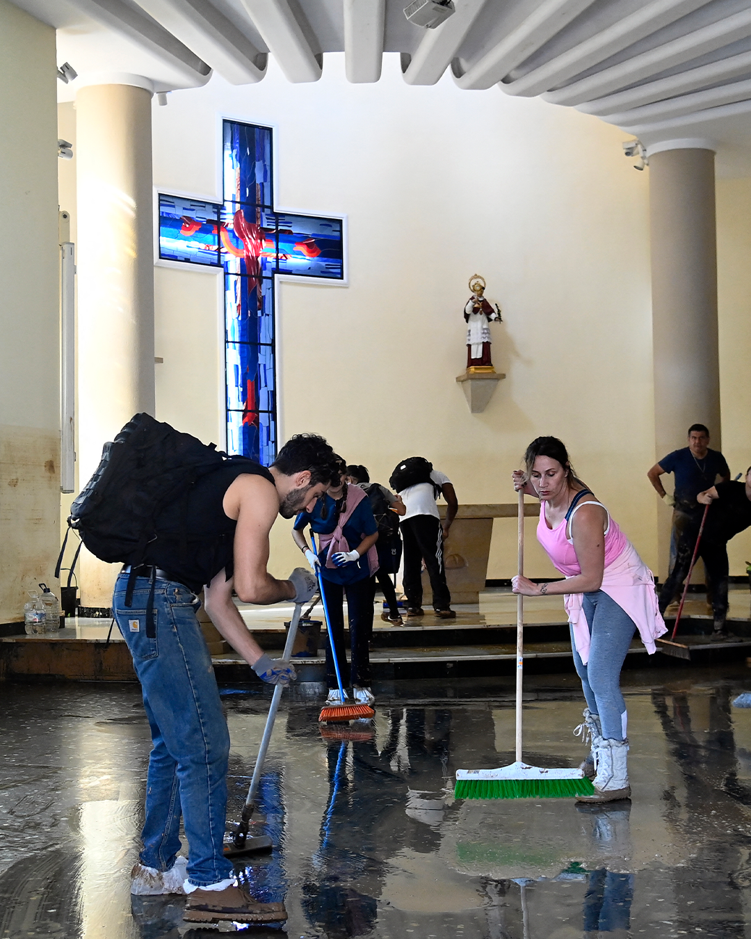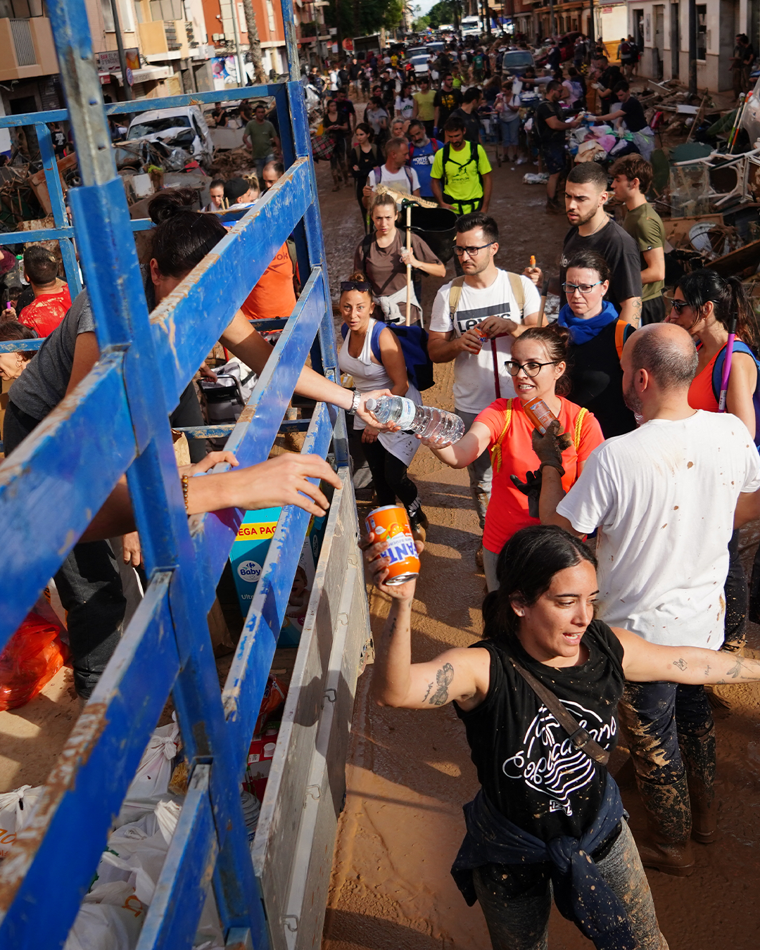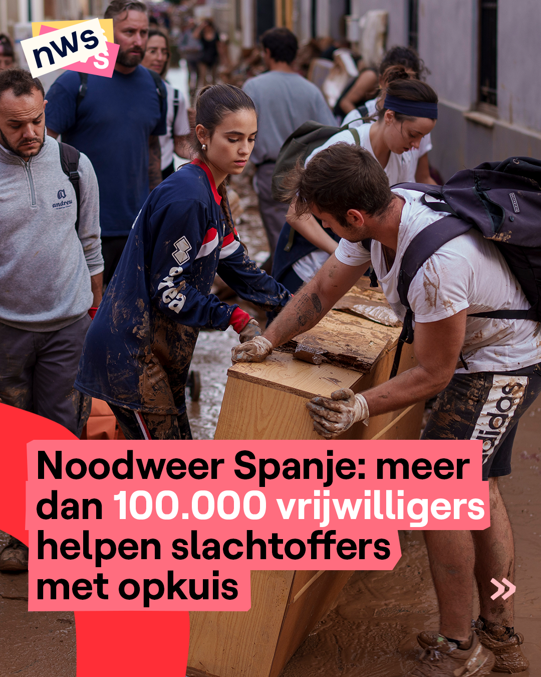 De solidariteit na de zware overstromingen in het oosten en zuiden van Spanje is enorm. Meer dan 100.000 vrijwilligers hebben zijn aangemeld om te helpen in de getroffen gebieden, waaronder ook veel jongeren. De Spaanse regering zet in totaal ook zo'n 10.000 soldaten, agenten en burgerwachten in. De vrijwilligers helpen vooral met modder ruimen, huizen en straten kuisen of eten en drinken rondbrengen. Zo kunnen de hulpdiensten zich focussen op de zoektocht naar vermisten. Tot nu zijn al zeker 211 mensen overleden, maar mogelijk ligt het aantal veel hoger. Er zijn nog altijd mensen vermist. Daarnaast zitten ook nog duizenden mensen vast in onbereikbare dorpen, zonder eten, drinkbaar water en gsm-ontvangst. Onze collega's konden in het dorpje Chiva praten met Alejandro, Swipe!