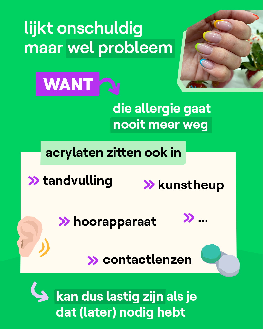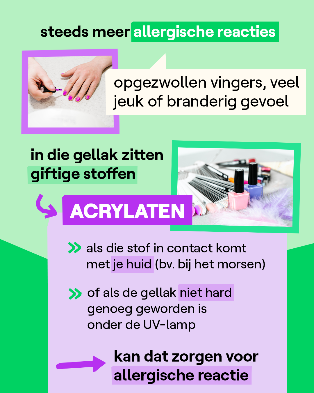 Een acrylaat-allergie is een vorm van contactallergie. De allergische reactie kan ontstaan als de giftige stof op de huid of onder de nagel komt. De stoffen zitten ook in gewone nagellak. Maar dat is een andere soort. Deze zijn dus niet gevaarlijk.