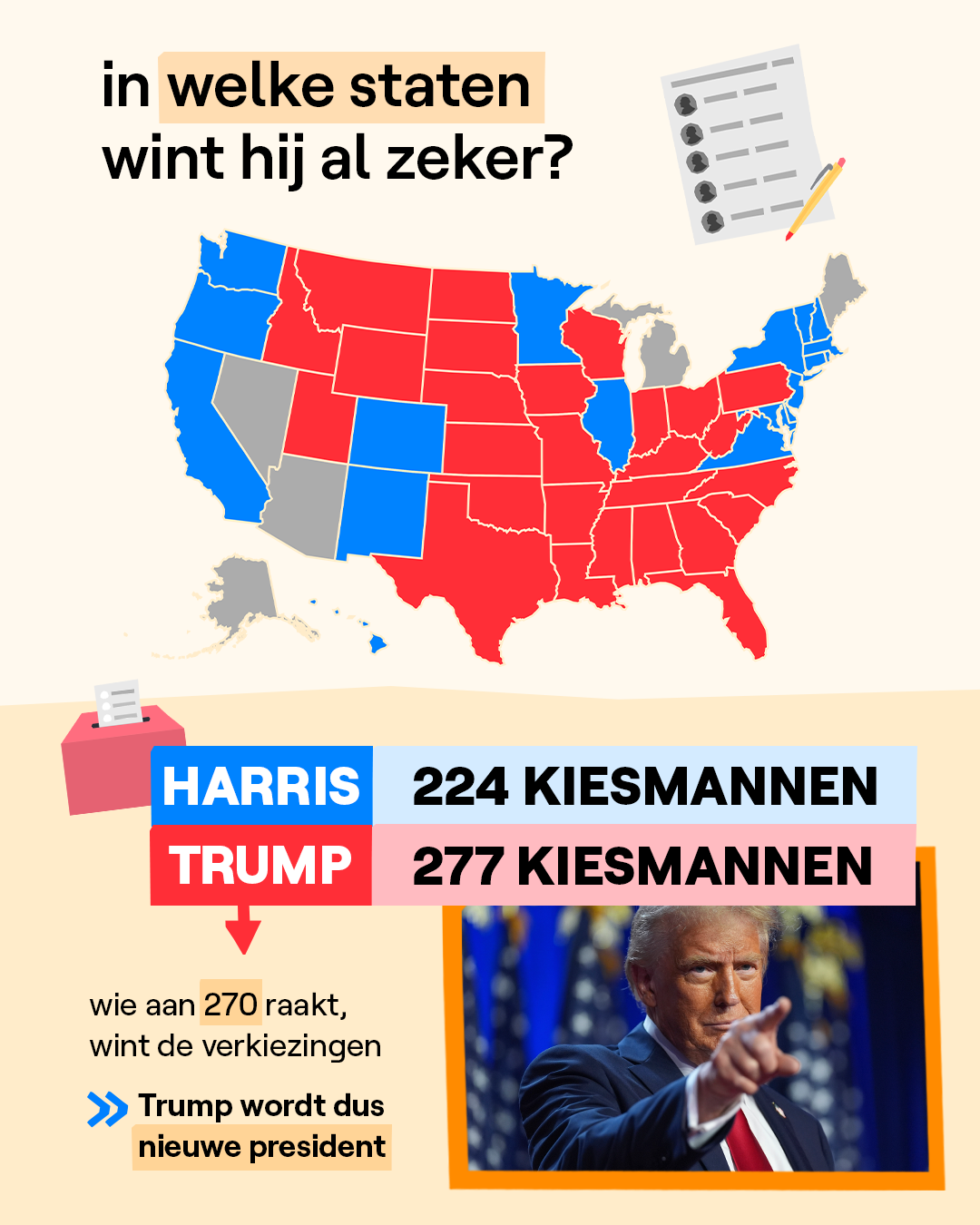 Met 277 kiesmannen is Donald Trump officieel verkozen tot nieuwe president van de Verenigde Staten. Hij wint nu ook 10 kiesmannen in de staat Wisconsin waardoor hij de kaap van 270 haalt. De komende vier jaren zal hij dus over het land regeren. Dat doet hij samen met zijn vicepresident JD Vance. Ook hij nam het woord tijdens Trumps overwinningsspeech en noemde de overwinning "de grootste politieke comeback van de geschiedenis". Trump zal op 20 januari de eed afleggen en wordt vanaf dan officieel president.
