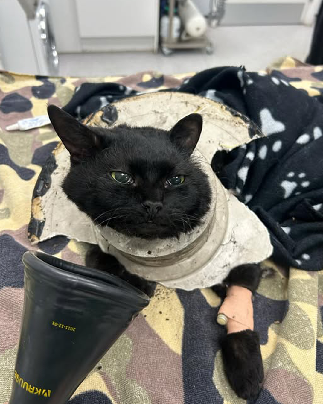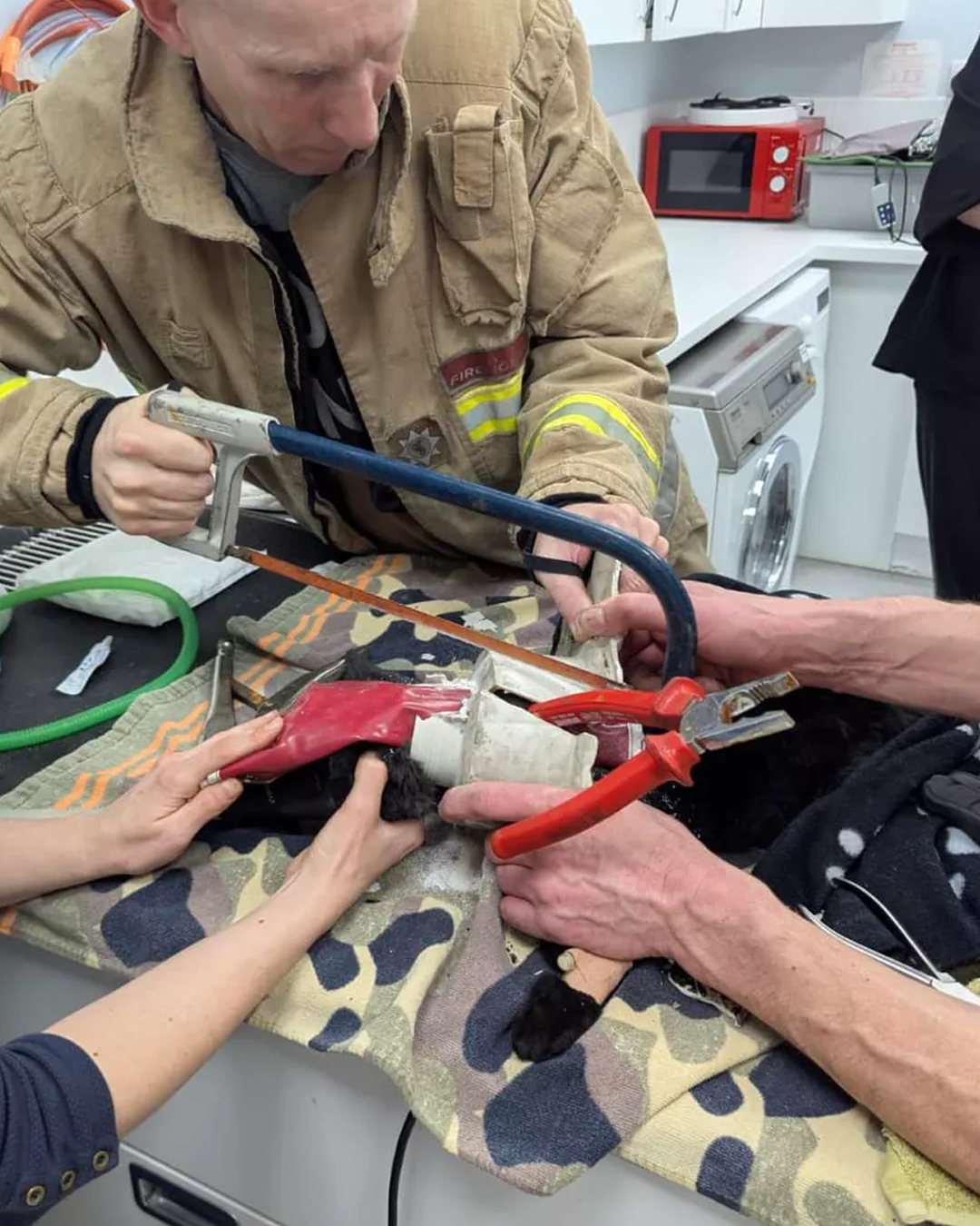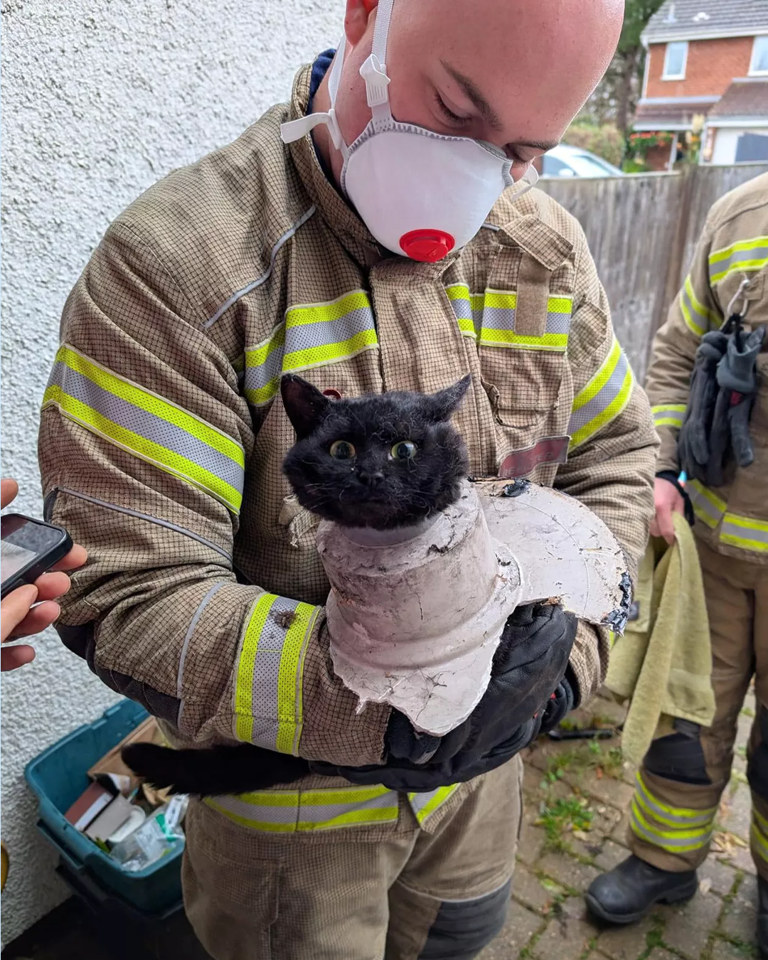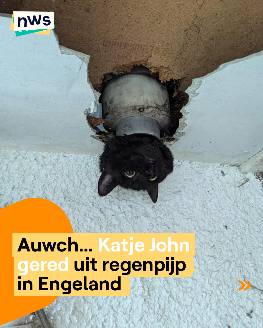 Cute! De brandweer uit Clevedon (Engeland) heeft katje John dit weekend gered uit een regenpijp. Een deel van de pijp bleef wel rond haar hals zitten... John moest naar de dierenarts en werd daar verdoofd. Zo kon de brandweer het laatste stuk hard plastic verwijderen met een zaag en een tang. Toen John wakker werd, kreeg ze veel knuffels. De brandweer heeft via socials laten weten dat de kat intussen weer thuis is en dat alles goed gaat met haar.