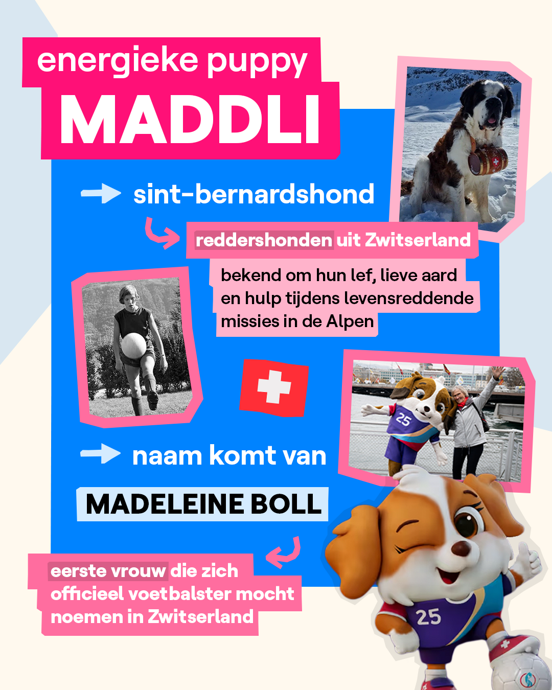 De Belgische Red Flames hebben gisteravond met 0-2 gewonnen van Oekraïne. Daarmee maken ze steeds meer kans om zich te kwalificeren voor het EK voetbal in Zwitserland. Dat gaat volgende zomer door van 2 tot en met 27 juli. En uiteraard is er geen EK zonder mascotte, dus maak kennis met de schattige puppy Maddli. De organisatie stelde haar officieel voor als mascotte voor het EK. “Haar energie, passie en liefde voor voetbal omvat perfect de geest van het toernooi en ons mooie land. Ik geloof dat zij jonge fans uit heel Europa kan inspireren en ik kan niet wachten om haar plezier te zien overbrengen naar de fans”, zegt een ambassadeur. Swipe!