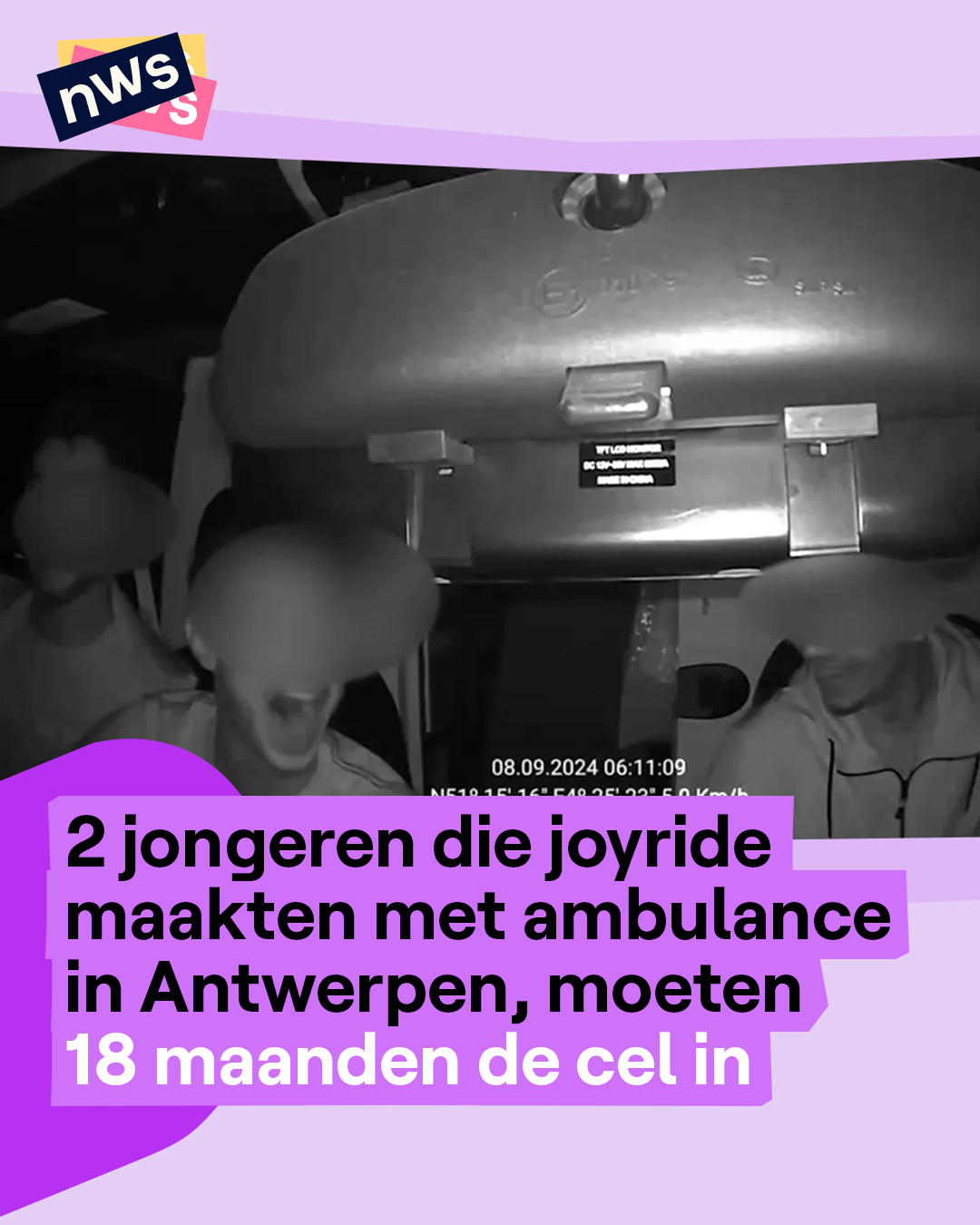 Twee jongeren die op 8 september een ambulance stalen in Antwerpen kennen hun straf: 18 maanden cel, 800 euro boete en 1.743 euro schadevergoeding. De rechter vond het nodig om de jongeren streng te straffen zodat ze de ernst van hun daden inzien. Het is namelijk niet de eerste keer dat ze voor de rechtbank moesten komen. Er reed ook een minderjarge mee die eerder al in een gesloten instelling werd geplaatst. De twintigers zeggen nu dat ze spijt hebben en dat ze dronken waren. Ze noemen hun actie "een uit de hand gelopen grap".