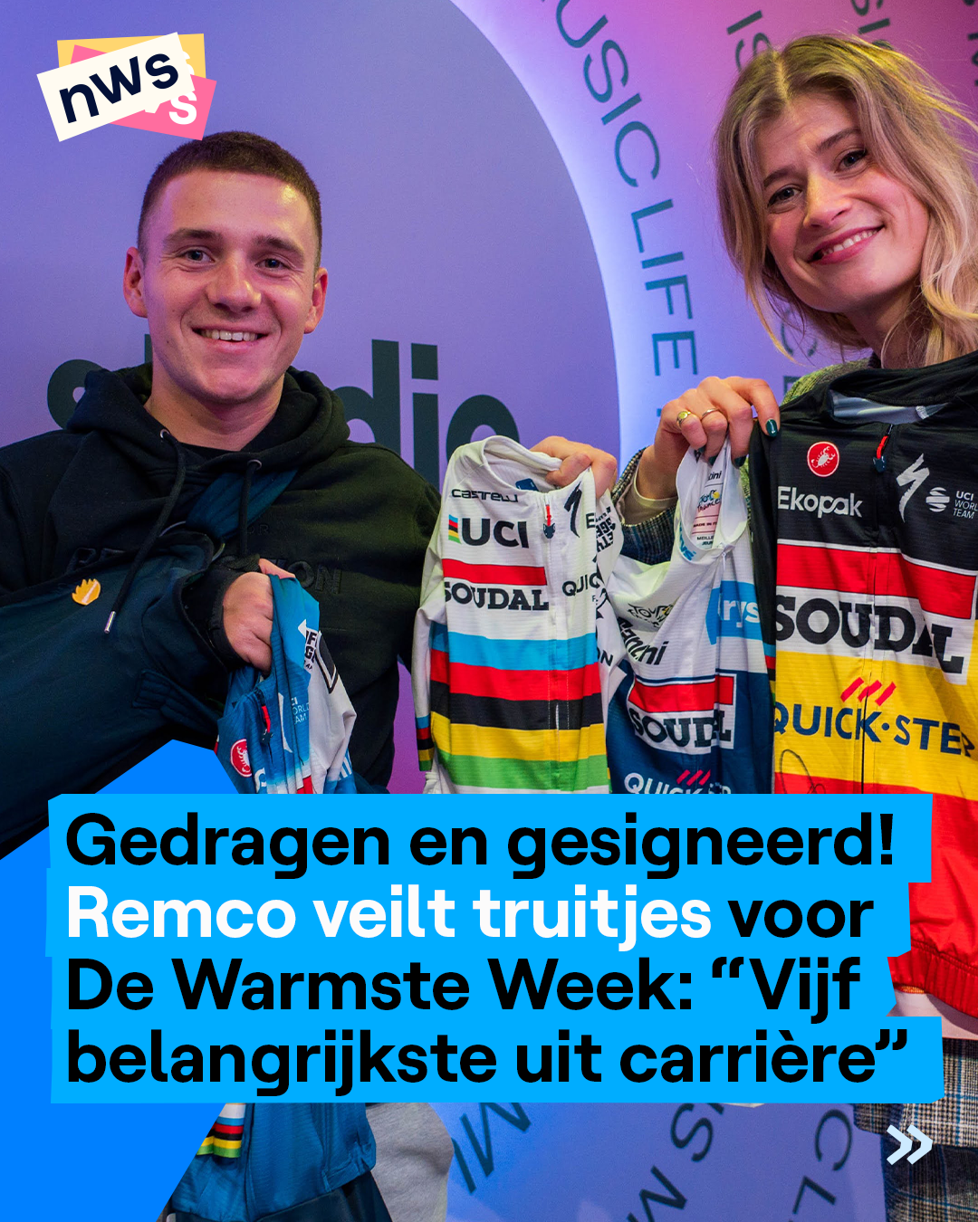 Altijd al willen schitteren in een truitje van Remco Evenepoel? Dit is je kans! Bij Eva De Roo op Studio Brussel kondigde Remco zijn actie voor De Warmste Week aan. Hij geeft vijf van zijn belangrijkste truitjes weg om het thema van dit jaar, eenzaamheid, te steunen. Op 24 december overhandigt Remco de truitjes persoonlijk aan de winnaars in Het Warmste Huis in Brugge.