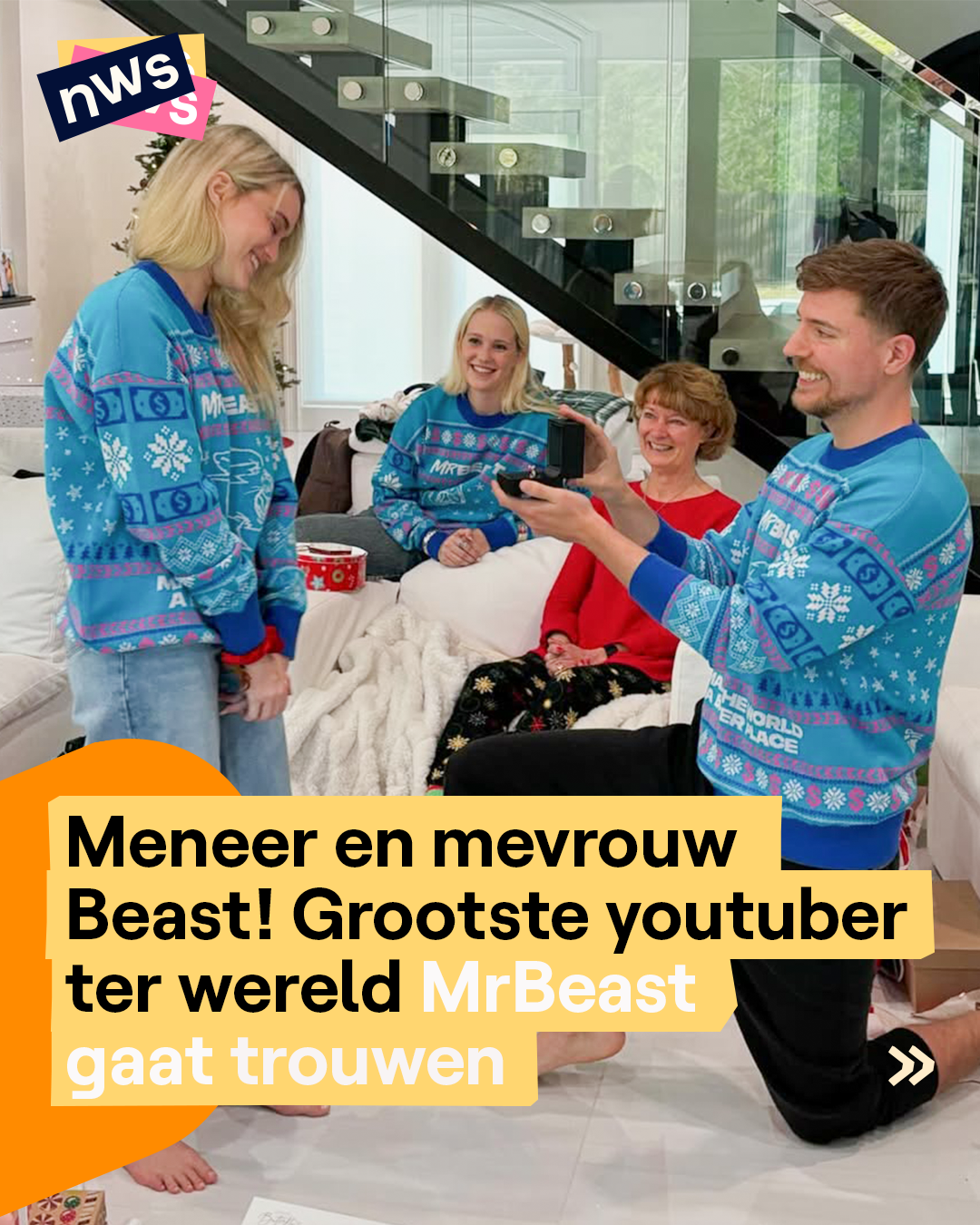 Jimmy Donaldson (26), beter bekend als MrBeast, heeft zijn vriendin Thea Booysen (27) gevraagd om te trouwen. Dat deed hij op Kerstmis met haar volledige familie erbij. Thea Booysen komt van Zuid-Afrika en is net als MrBeast een youtuber. Daarnaast heeft ze ook drie diploma's en schreef ze een boek. Jimmy en Thea kennen elkaar sinds 2022. Wanneer het trouwfeest plaatsvindt, is nog niet bekend. En of er een zotte YouTube-video van gemaakt zal worden? MrBeast hoopt om zijn huwelijk zo privé mogelijk te houden. Maar als de populairste youtuber ter wereld met meer dan 340 miljoen volgers zal dat moeilijk gaan. Sinds kort presenteert hij ook zijn eigen spelshow ‘Beast Games’ waarin duizend mensen strijden om een prijs van 5 miljoen dollar.