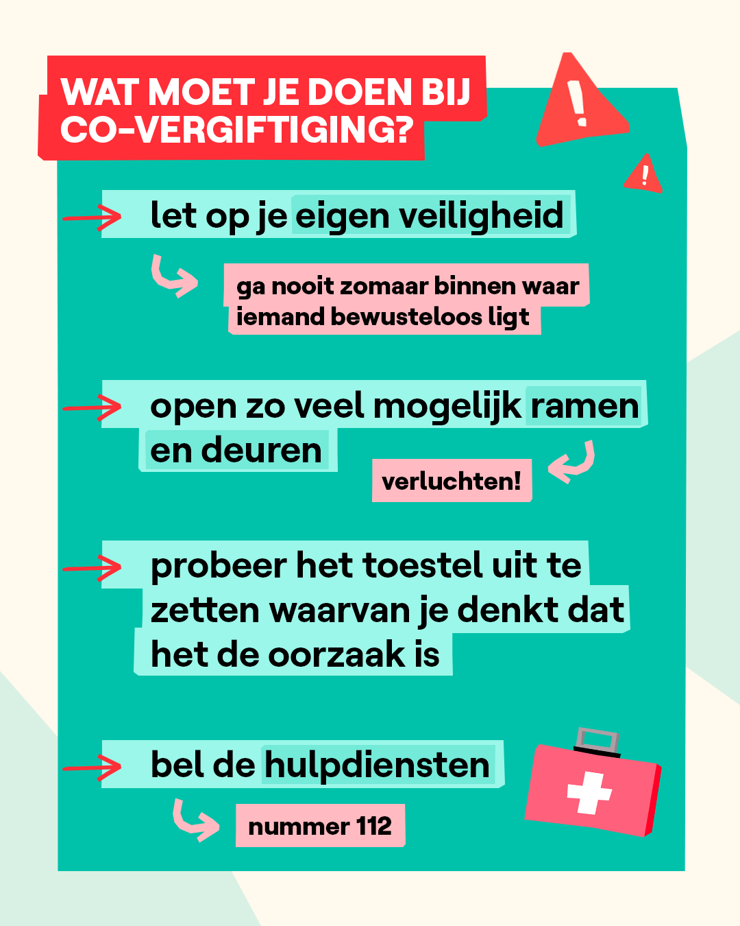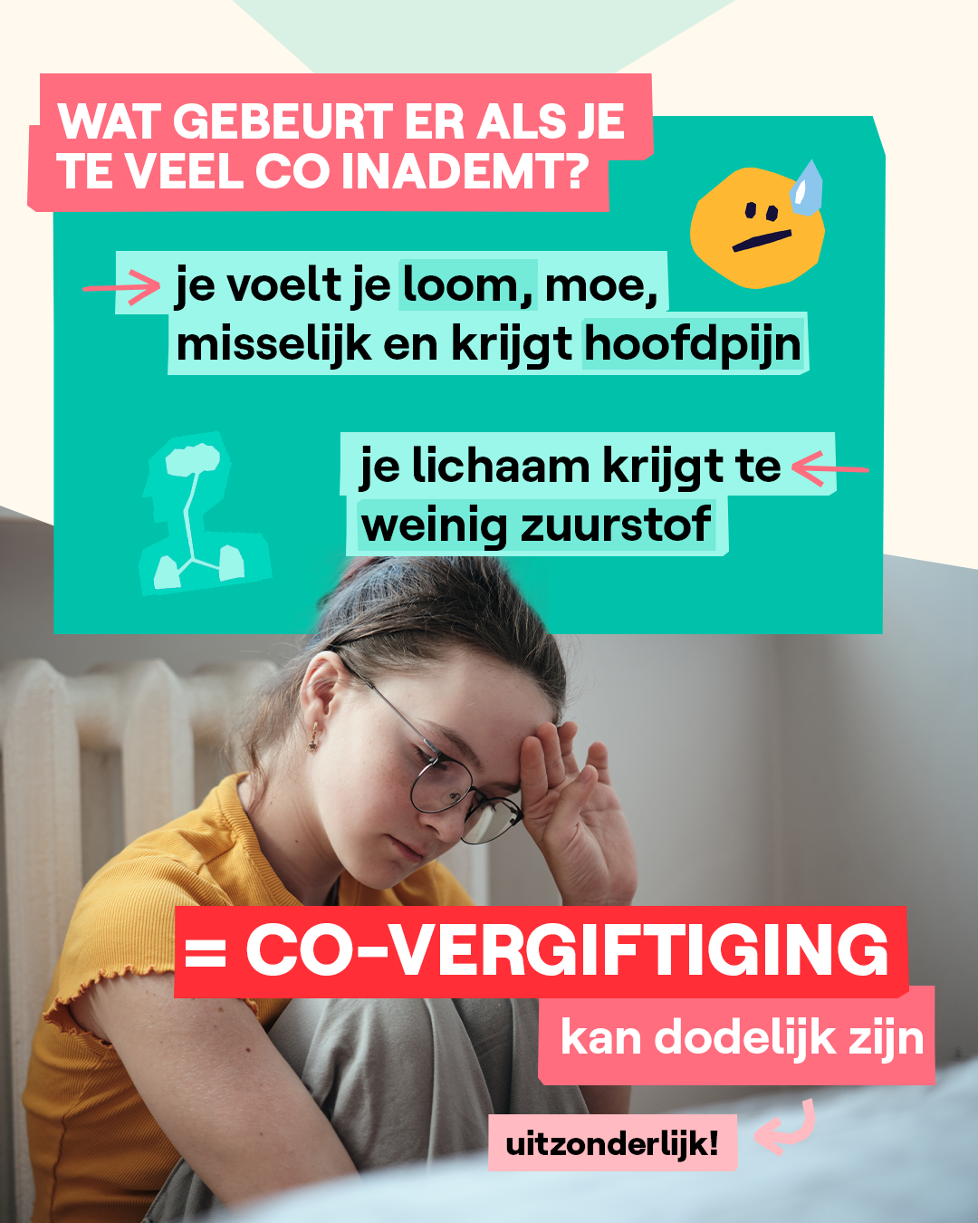 Het is normaal om een kleine hoeveelheid koolstofmonoxide (CO) in je bloed te hebben. Voor niet-rokers is dat 1 tot 4 procent, voor mensen die wel roken is dat 7 tot 9 procent. Hogere percentages wijzen op een CO-vergiftiging. Sinds de energiecrisis komt CO-vergiftiging steeds vaker voor. Mensen laten minder snel hun verwarmingstoestellen controleren en zoeken ook andere en goedkopere manieren om hun huis op te warmen. Maar die zijn vaak onveilig. Wil je meer weten over CO-vergiftiging? Check dan zeker de website het Antigifcentrum (antigifcentrum.be).