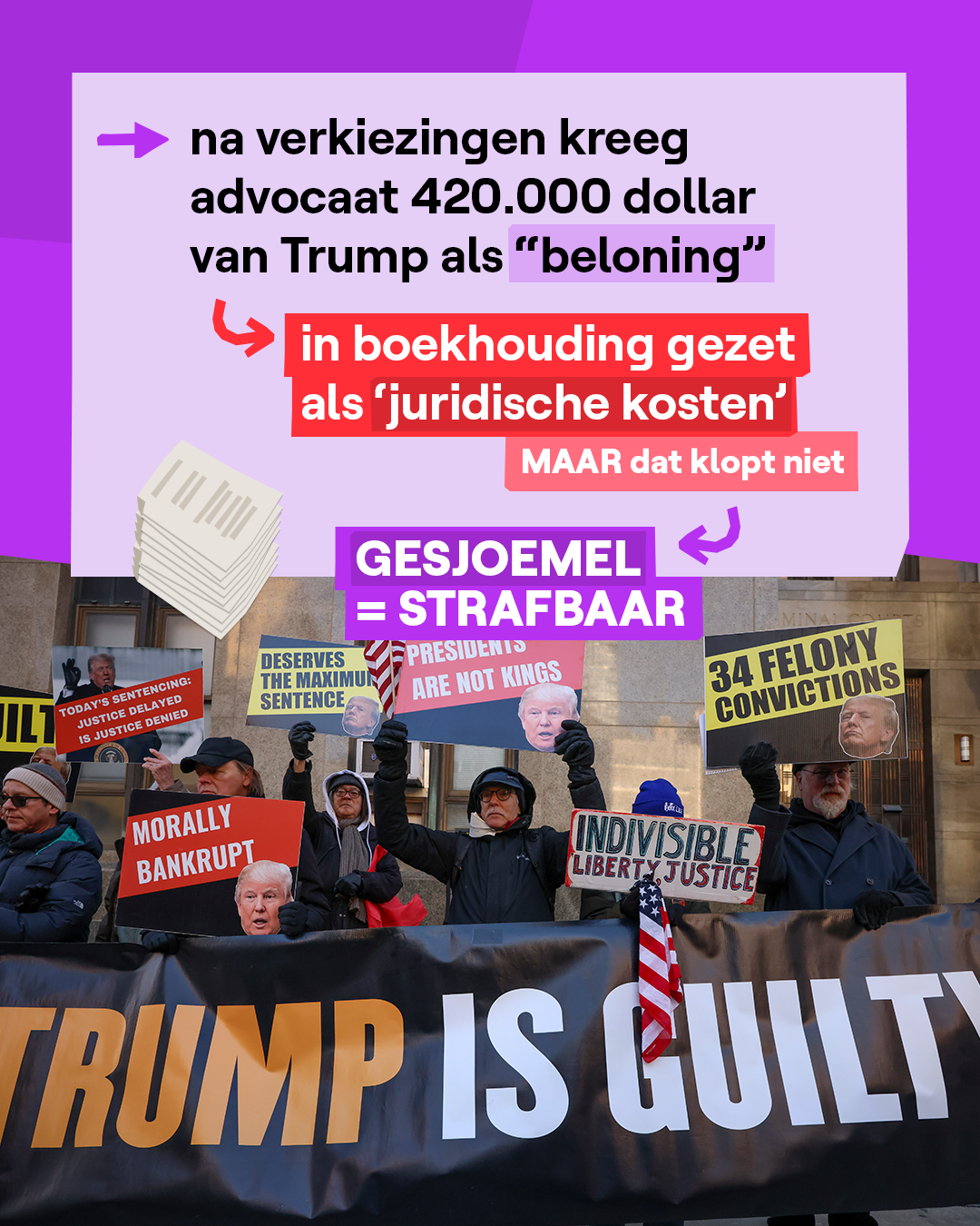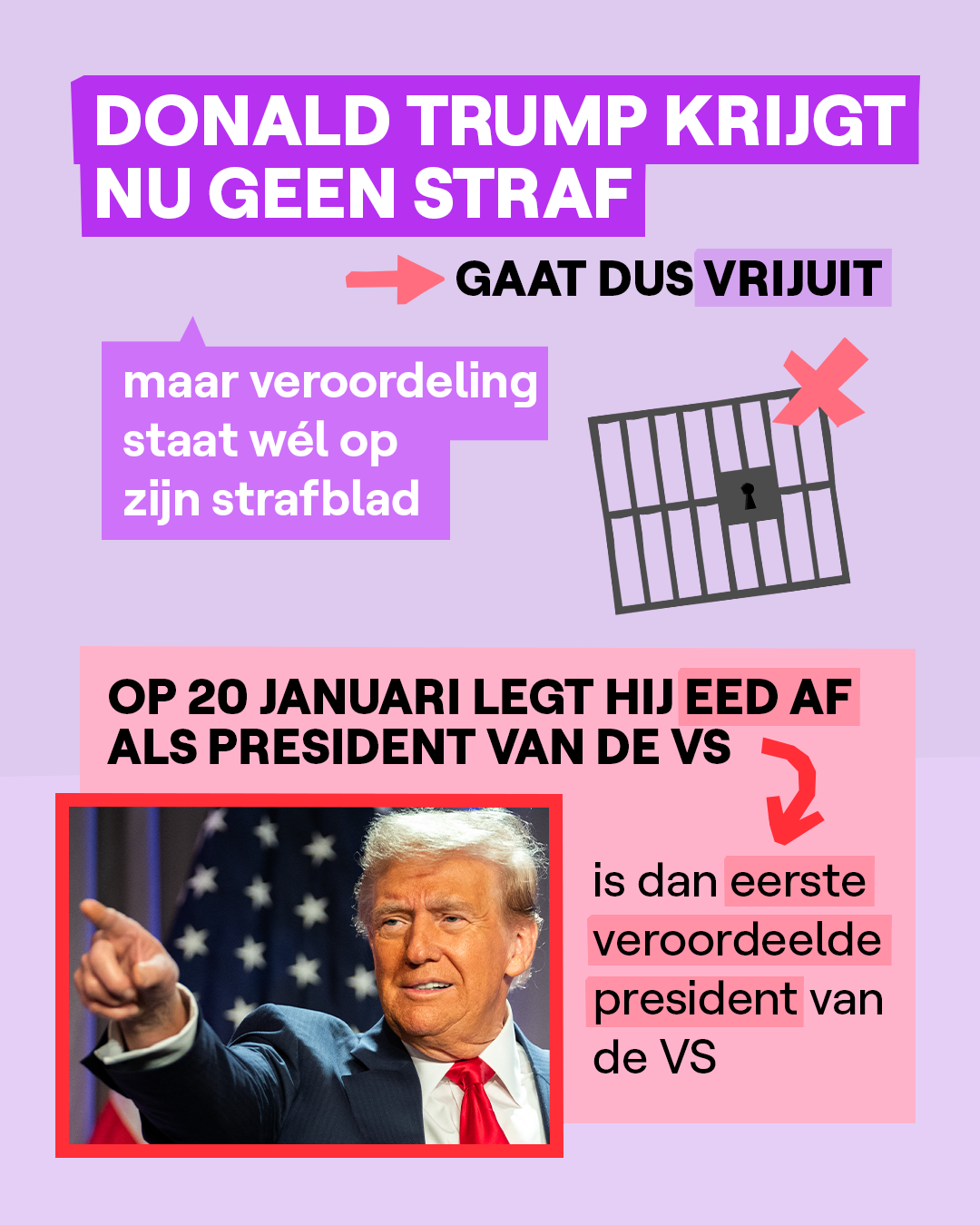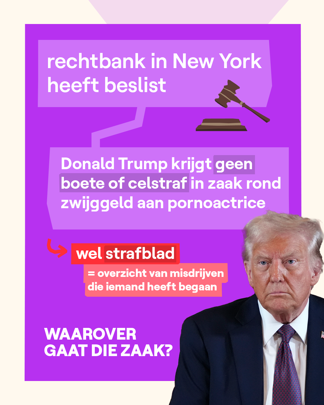 Donald Trump probeerde meerdere keren om de uitspraak tegen te houden, maar da's dus niet gelukt. Hij zegt ook nog steeds dat hij onschuldig is en dat hij niets fout heeft gedaan. Trump kan nog in beroep gaan tegen de uitspraak. Dat wil zeggen dat hij niet akkoord is met de uitspraak en wil dat een andere rechtbank de zaak opnieuw bekijkt.