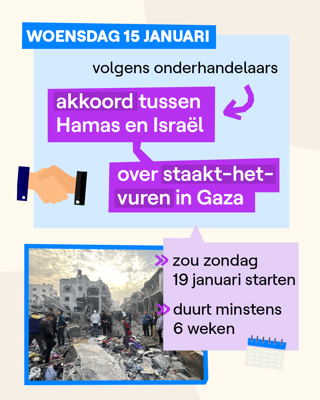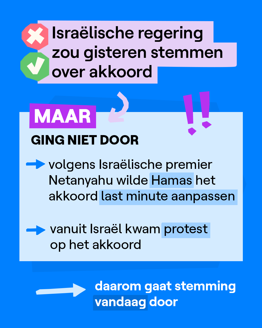 Deze namiddag zit de Israëlische regering samen over het akkoord met Hamas. Enkele extreemrechtse ministers riepen al op om het akkoord niet te aanvaarden. Ze dreigen er zelfs mee de regering te verlaten. In het algemeen wordt er wel verwacht dat het staakt-het-vuren toch goedgekeurd zal worden.