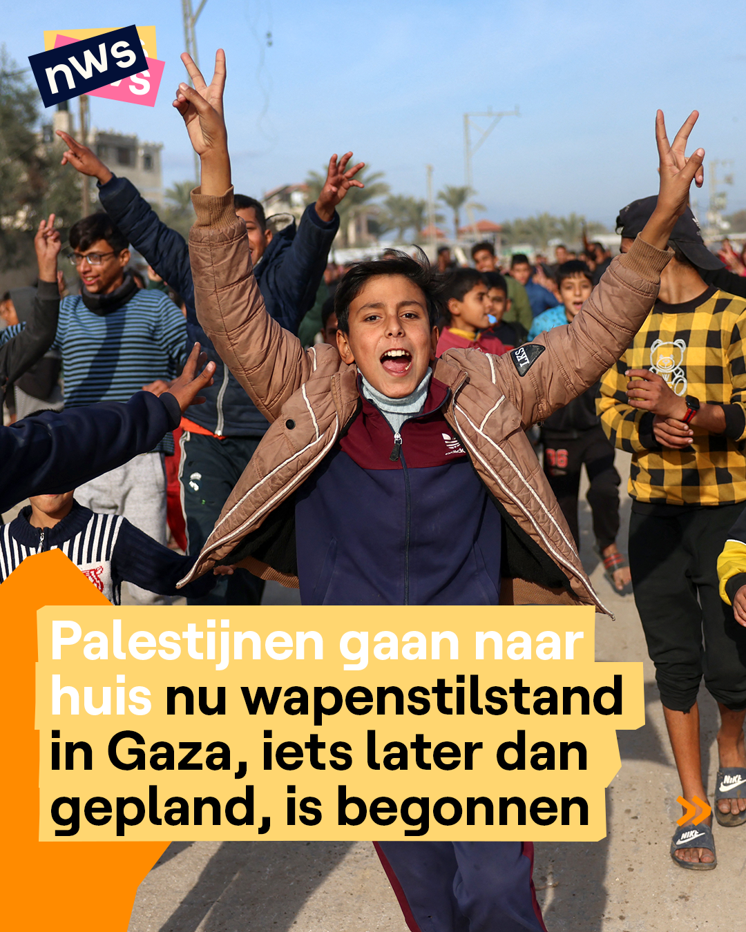 Te voet, met ezelwagens of met de auto: Palestijnen keren volop terug naar huis. Na 15 maanden oorlog is er een wapenstilstand tussen Israël en de Palestijnse gewapende groep Hamas. Het staakt-het-vuren begon wel 2 uur later dan afgesproken. Hamas had de namen van de drie Israëlische gijzelaars, die vandaag vrijkomen, niet op tijd doorgegeven. Israël heeft Gaza daarom vanmorgen nog gebombardeerd. Ondertussen zijn de namen er wel. In ruil worden iets minder dan 100 Palestijnse gevangenen vrijgelaten. Duizenden vrachtwagens staan ook klaar om Gaza binnen te rijden. Die zitten vol met eten, water en bloem.